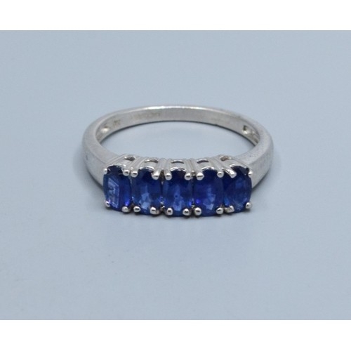 9ct white gold ladies 5 stone inline Sapphire dress ring held in a claw design size N, 3.3grams