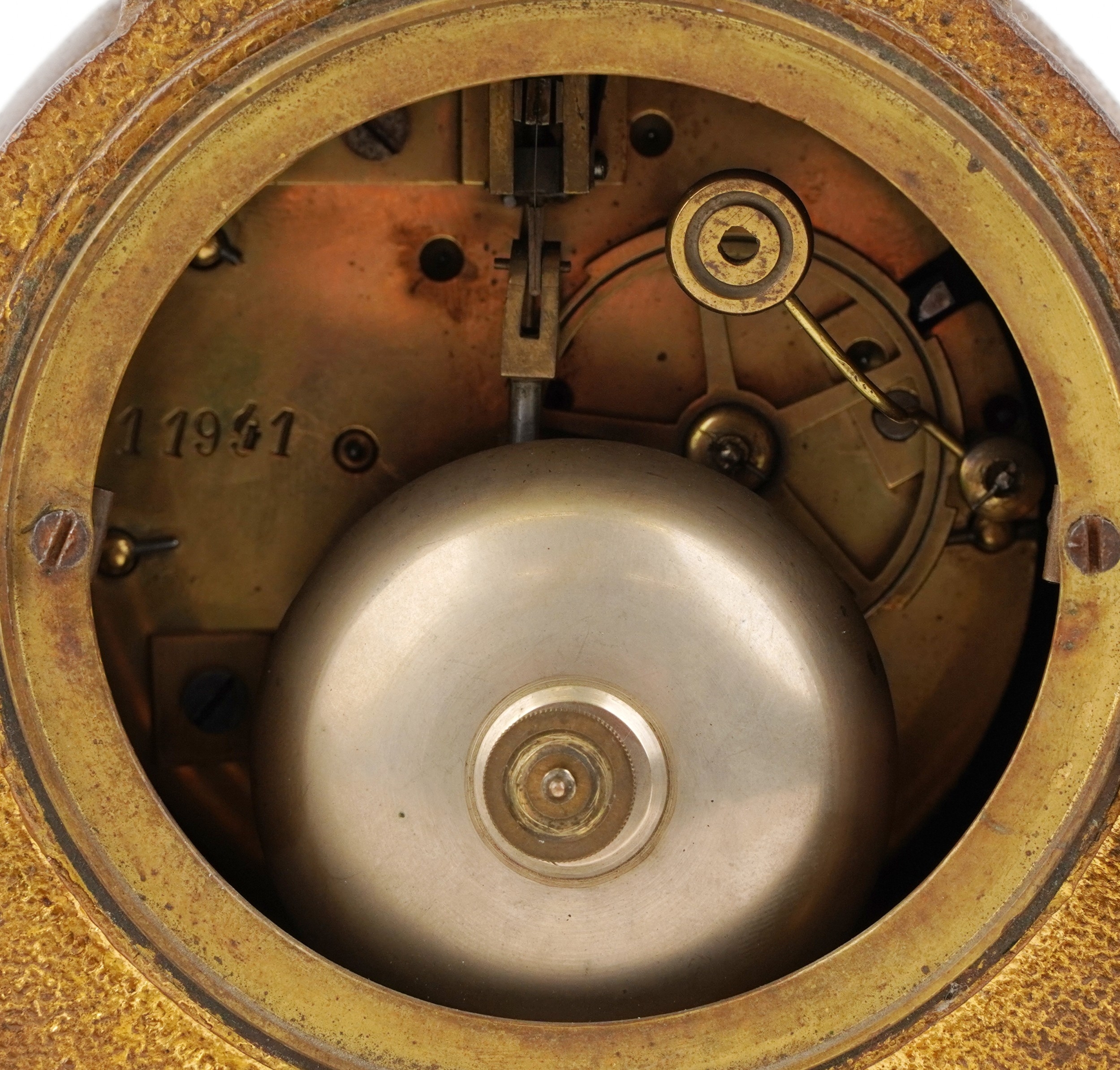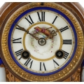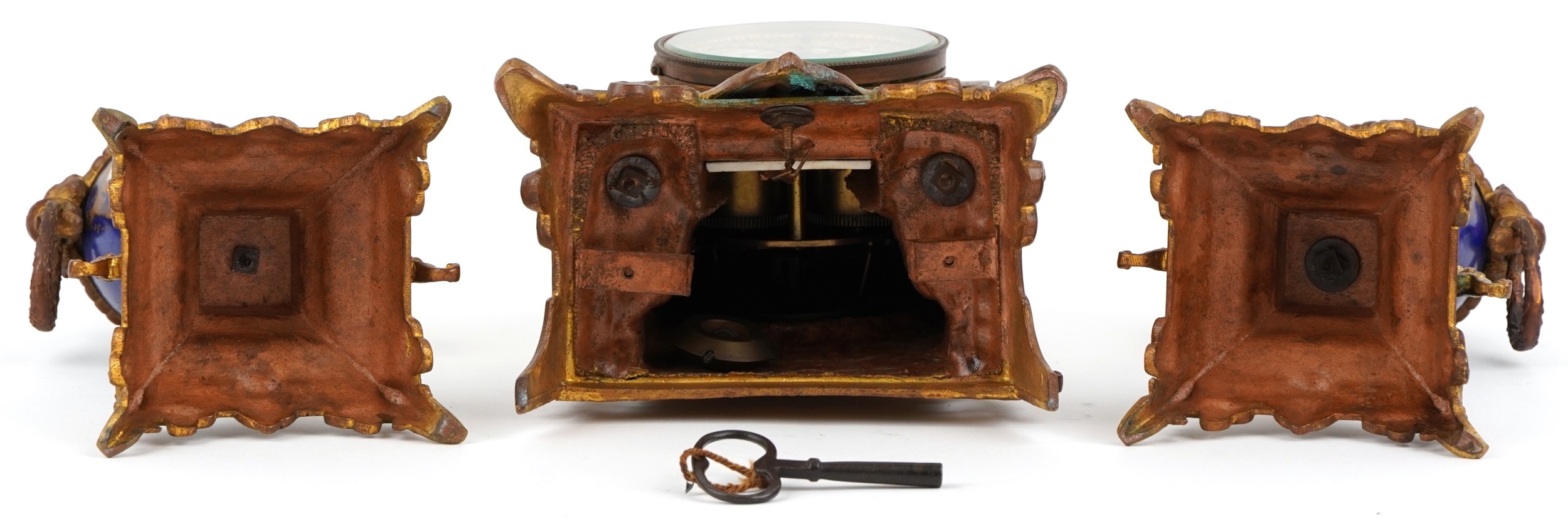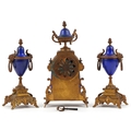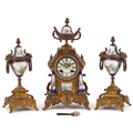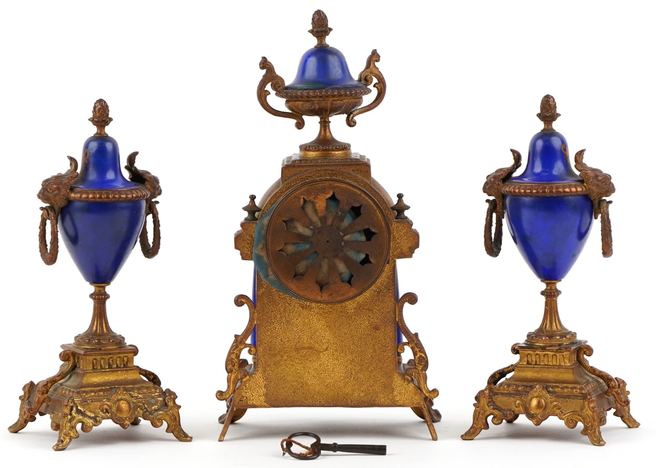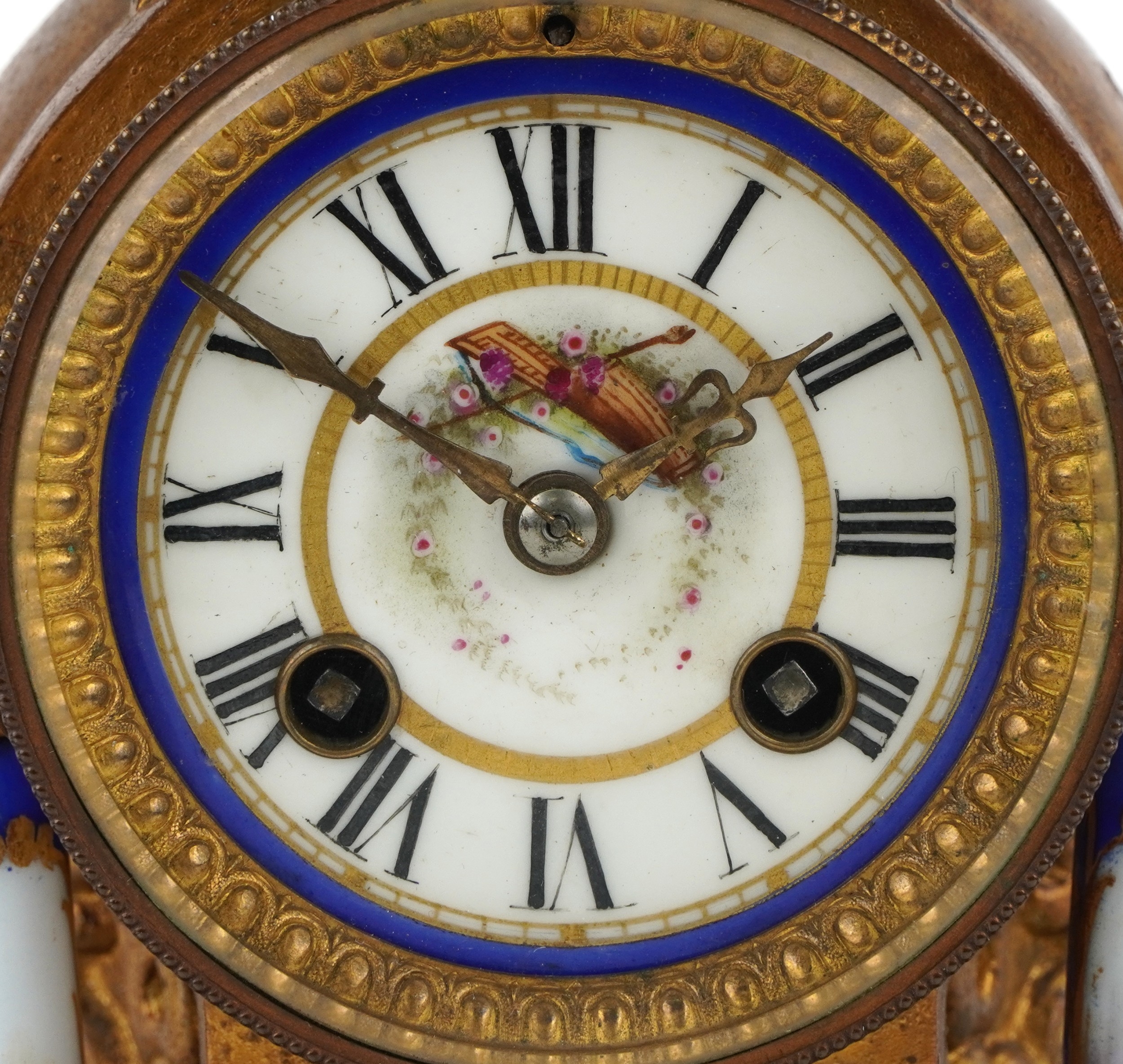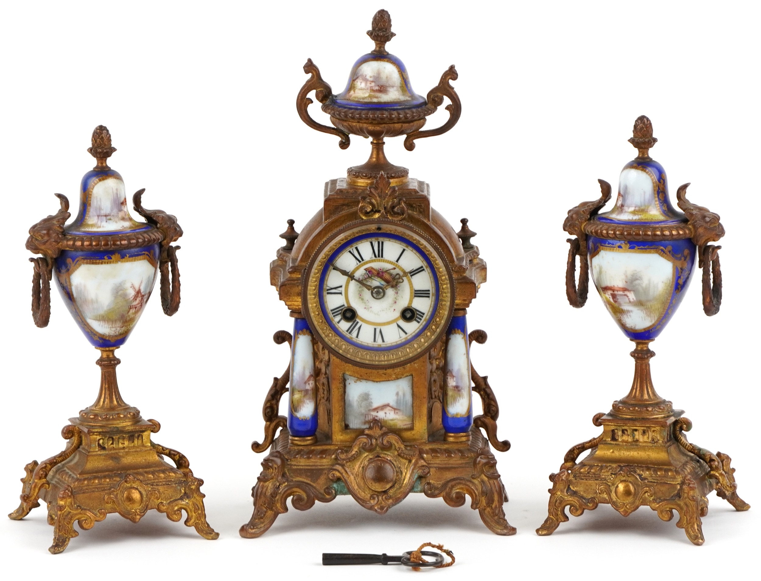 A French 19th century A D Mougin gilt brass and porcelain three piece striking clock garniture hand painted with pastoral landscapes, the enamelled dial with Roman numerals, striking on a bell, the clock 32cm high.