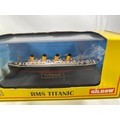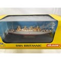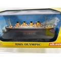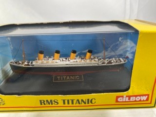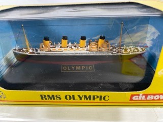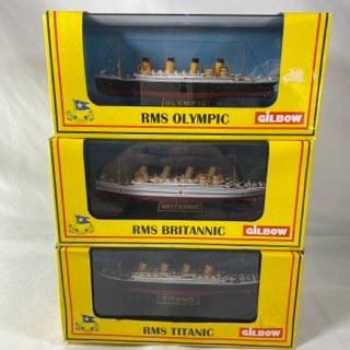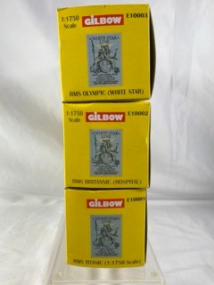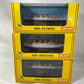 Three Gilbow White Star Line 1:1750 scale die-cast ships, E100001 RMS Titanic, E10002 RMS Britannic (Hospital), E100003 RMS Olympic (White Star), previously displayed in their cases, original box sleeves with price label marks and creasing - Ships Very Good, cases/sleeves Good (3) 750g