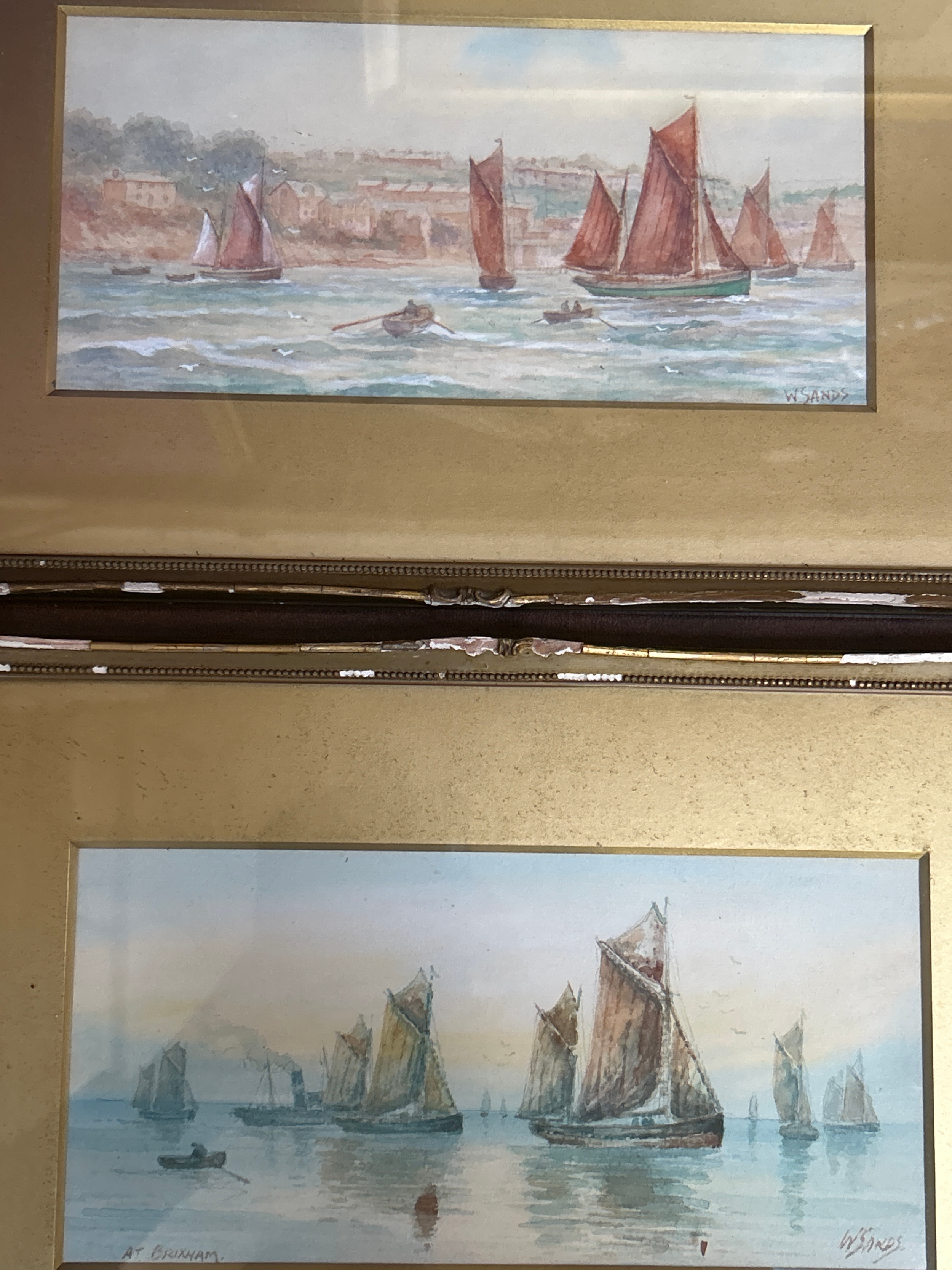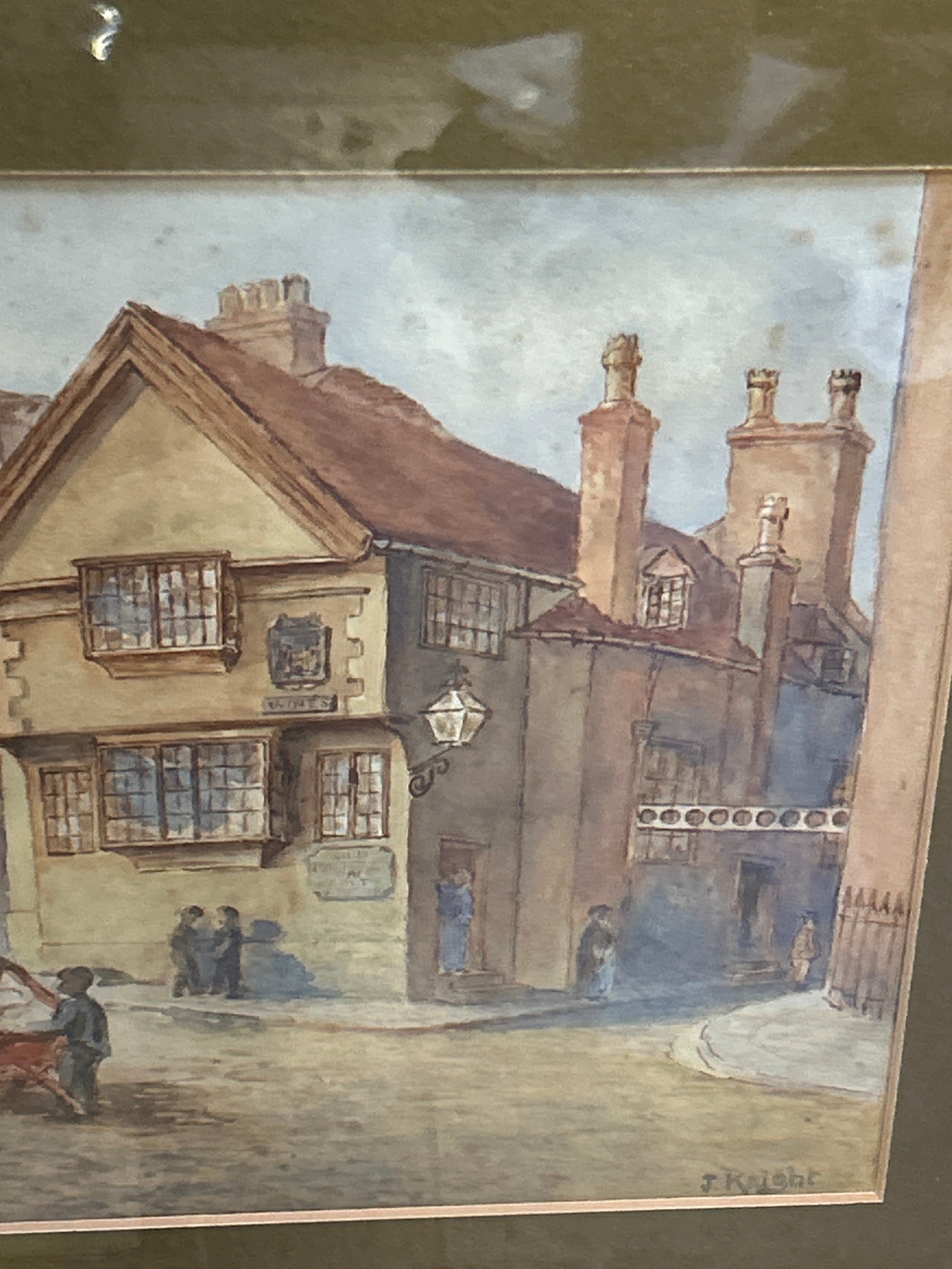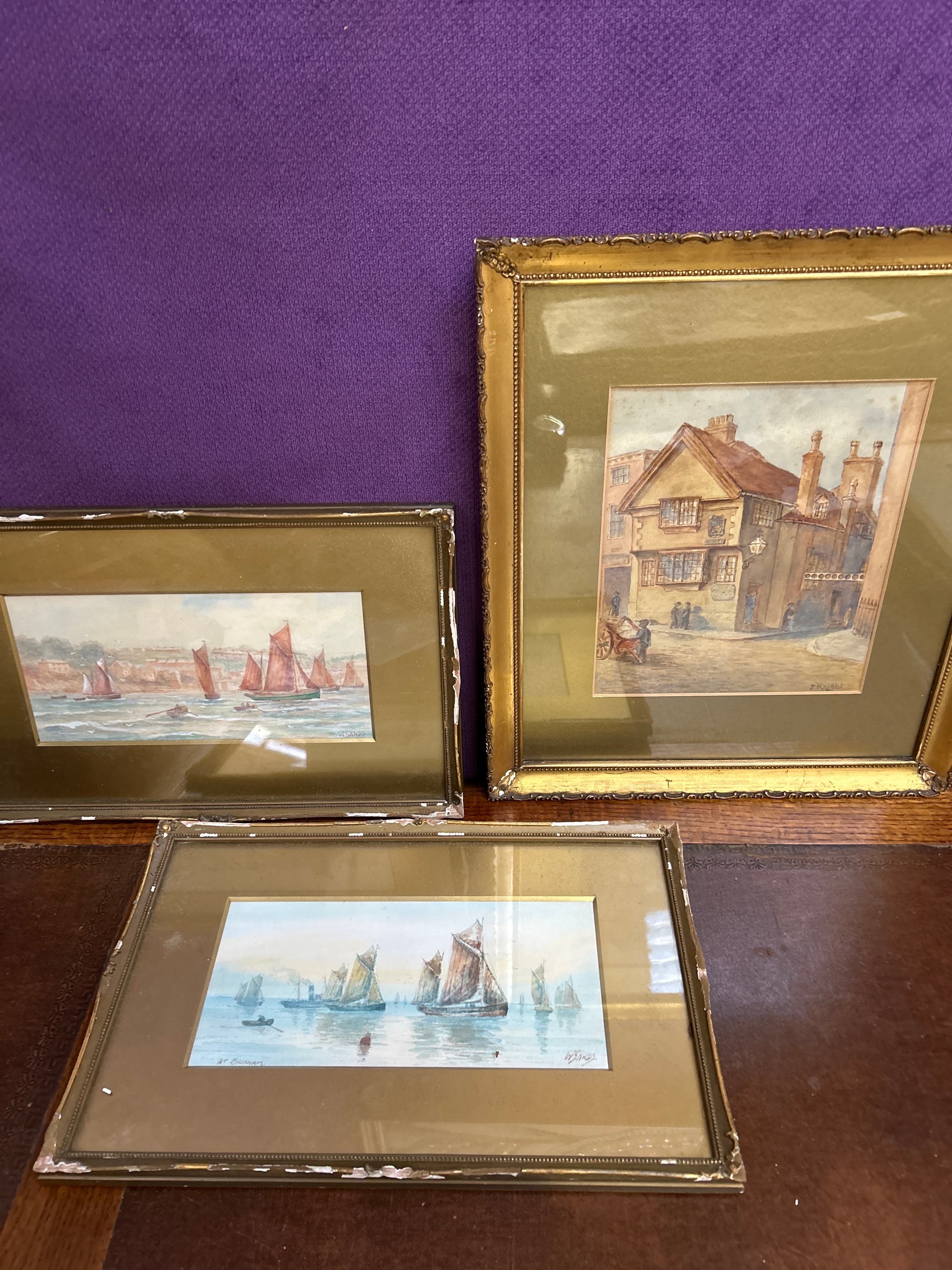 A late 19th Century watercolour of the old Postern Gate Inn, Nottingham, signed by the artist J Knight, together with two further late 19th or early 20th Century watercolours of yachts, one “At Brixham” signed by the artist W Sands. Image size 25cm x 12cm