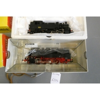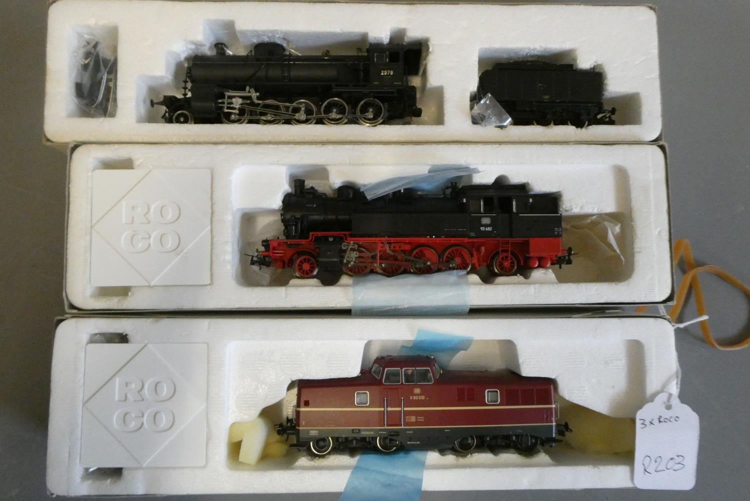 Three Roco HO scale locomotives comprising Swiss C5/6 steam locomotive, DB Class 93 steam tank and DB V80 diesel locomotive, all items boxed, excellent