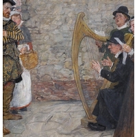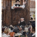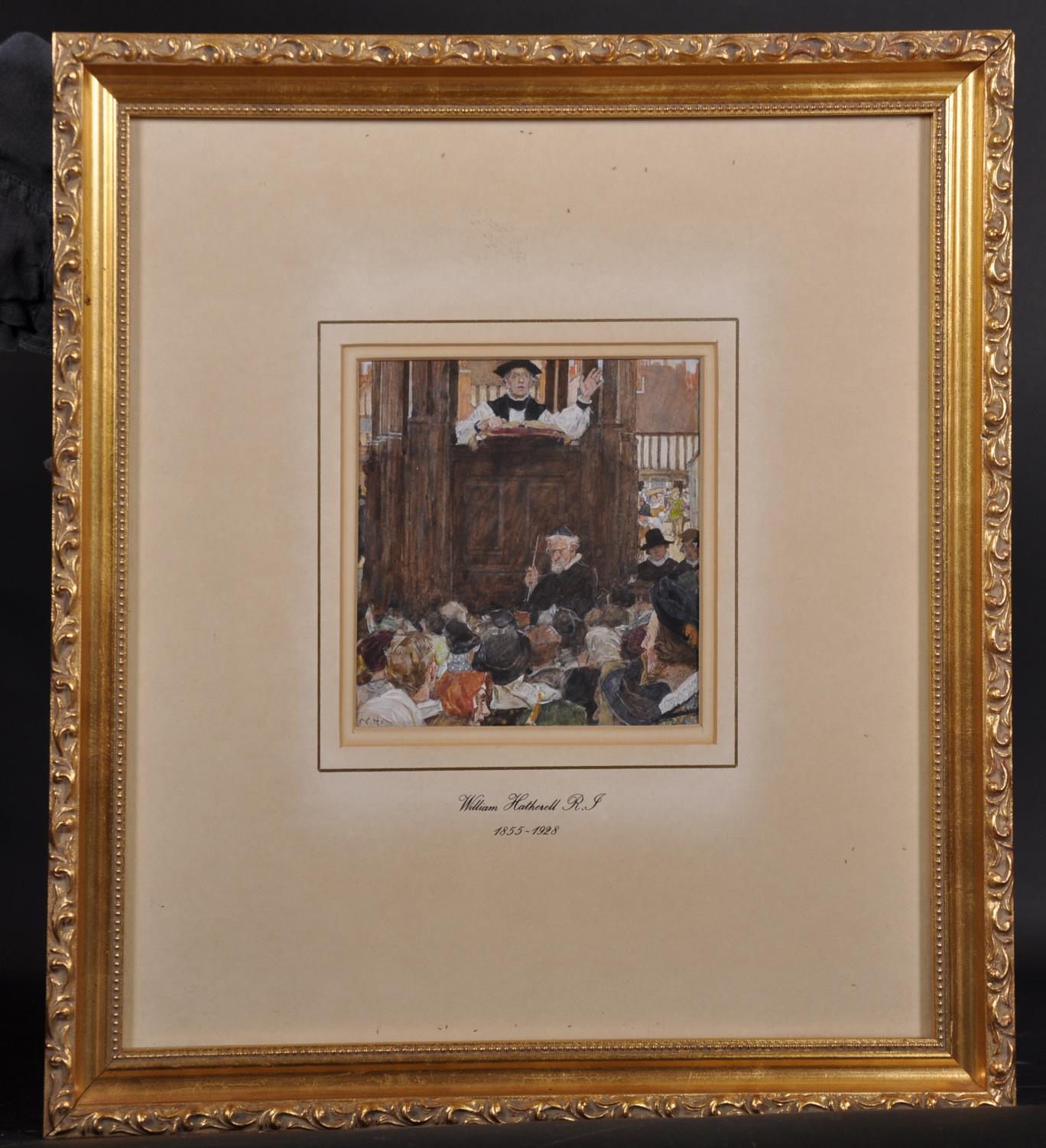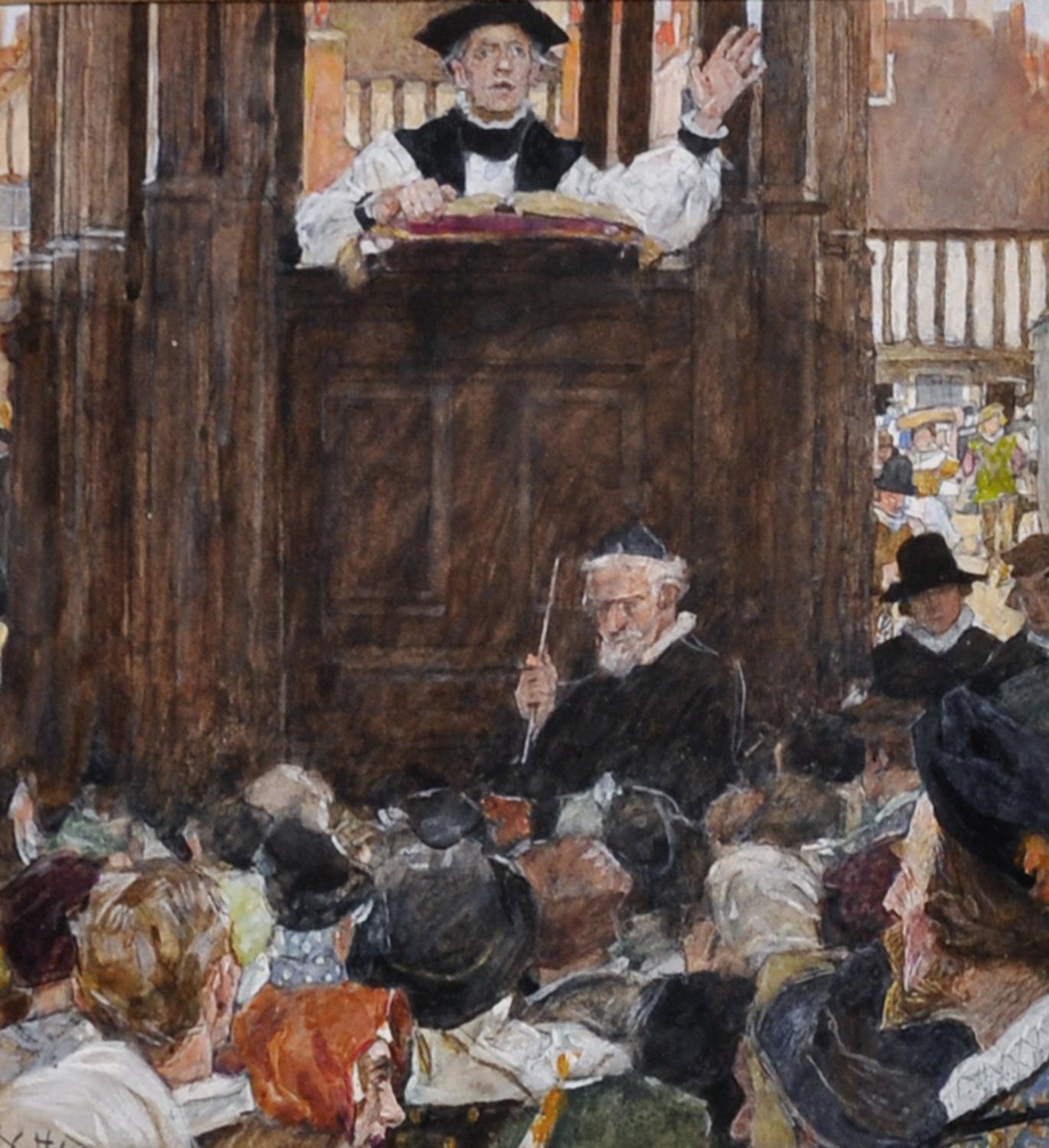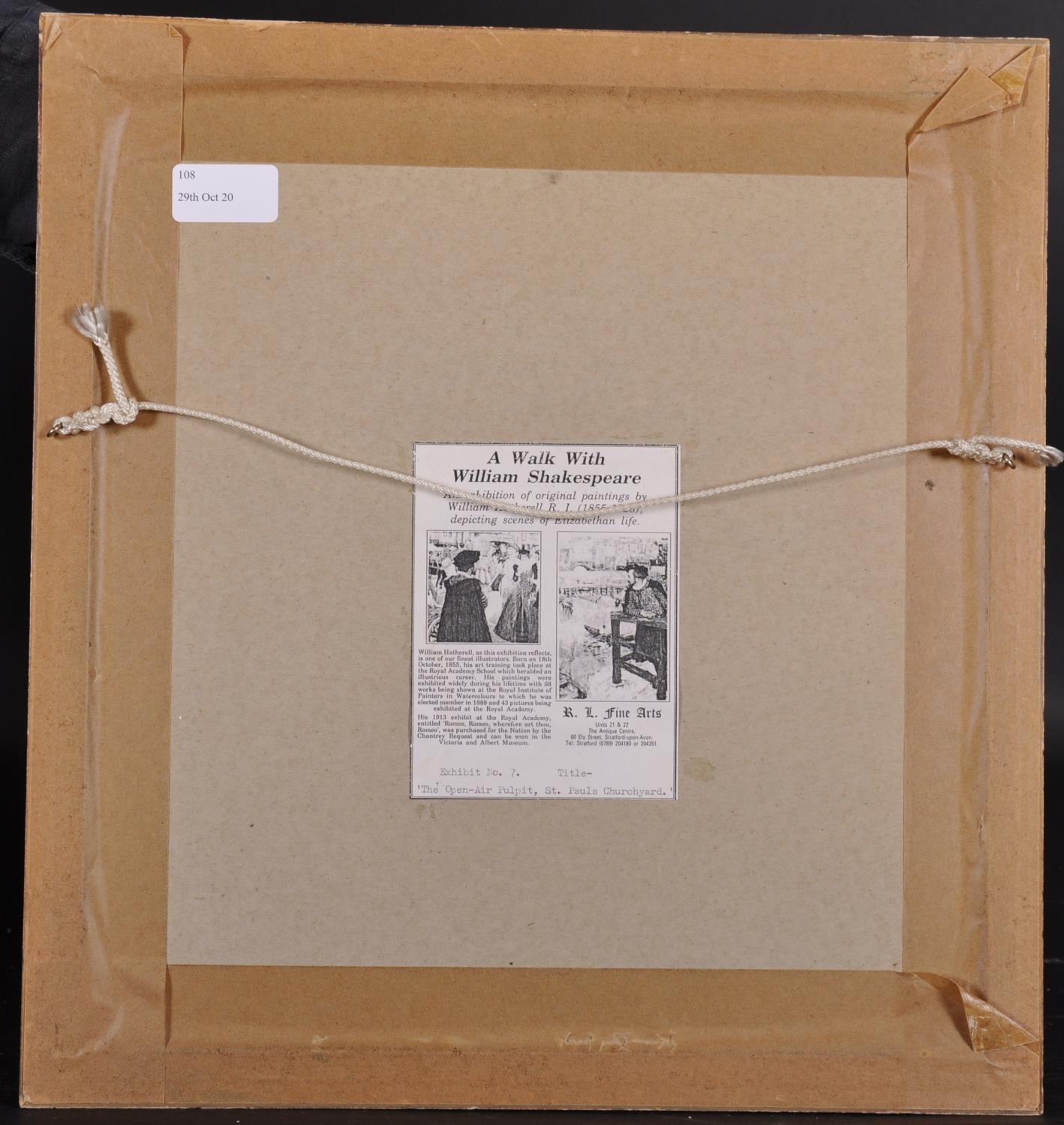 William Hatherell (1855-1928) British. “The Open-Air Pulpit, St Paul’s Churchyard”, in Elizabethan Costume, Watercolour, Inscribed on the mount, and Inscribed on a label on the reverse, 5.5” x 5.25” (14 x 13.5cm). Provenance; Exhibited, ‘A Walk with Shakespeare’, No 7.