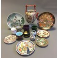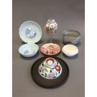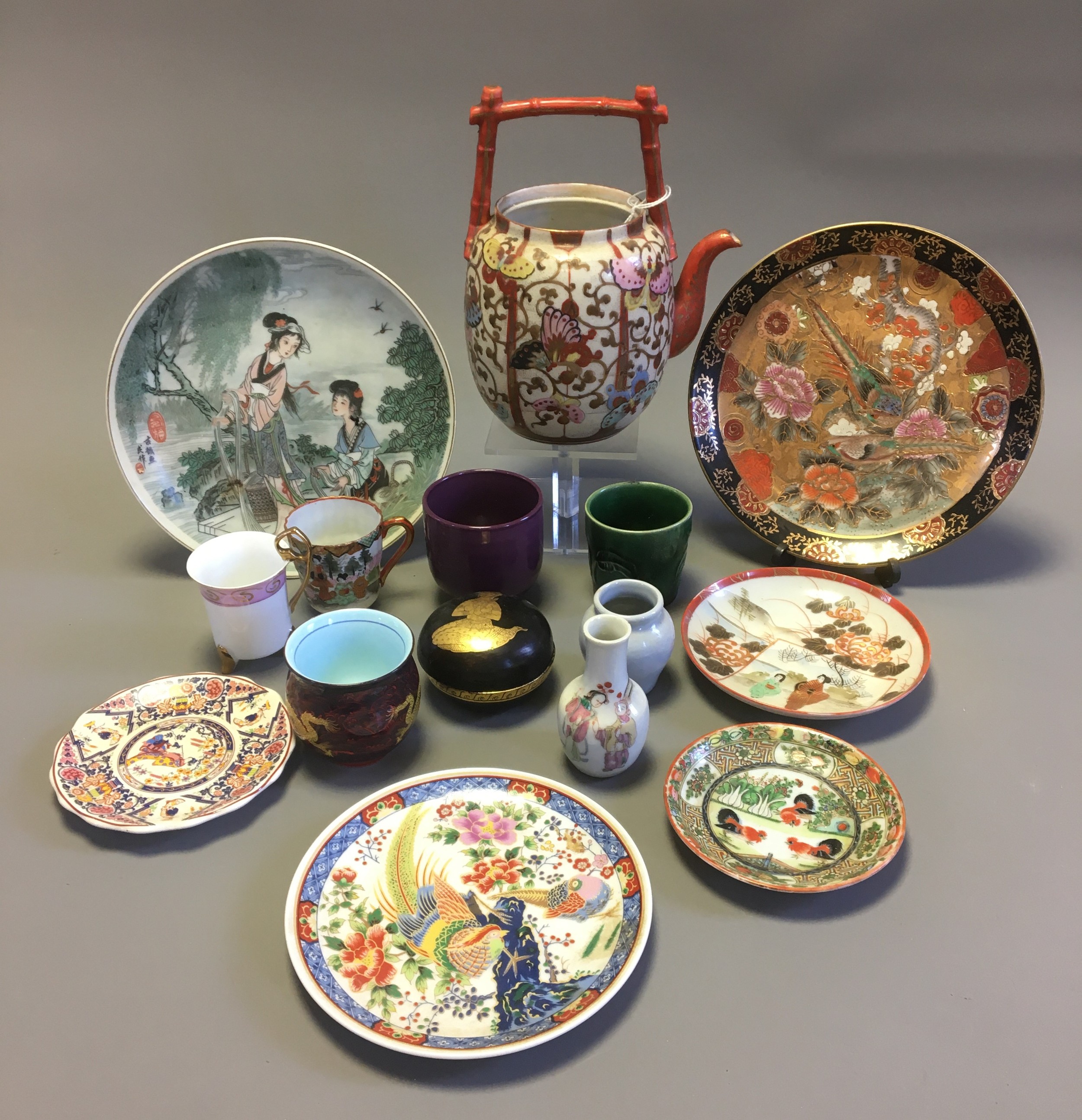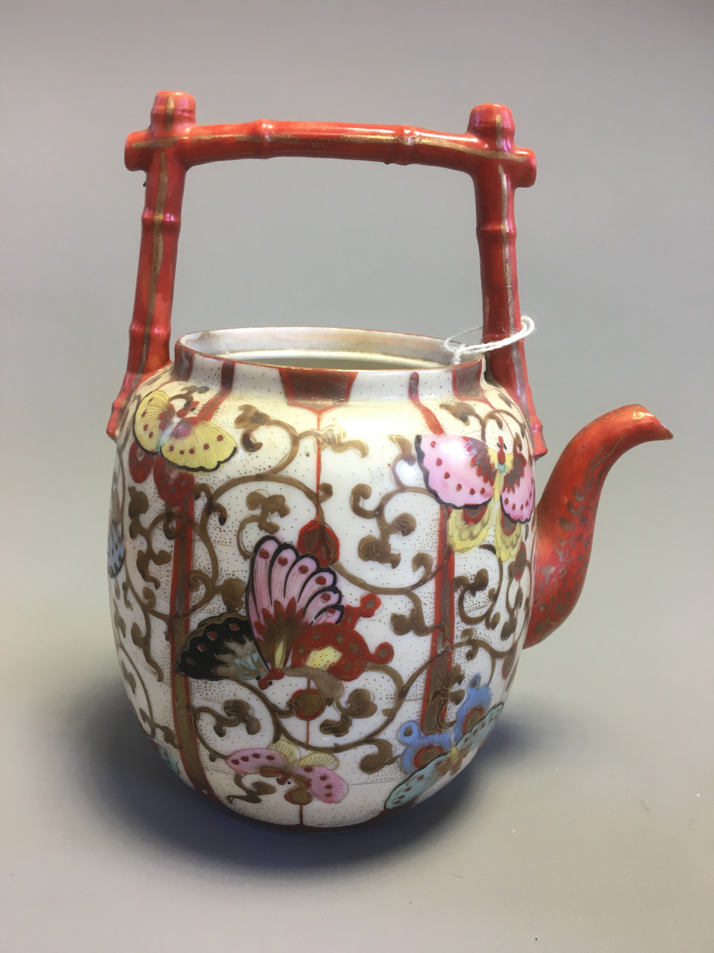 Oriental Ceramics Chinese and Japanese to include a Butterfly Decorated Tea Pot with Bamboo effect Handle.