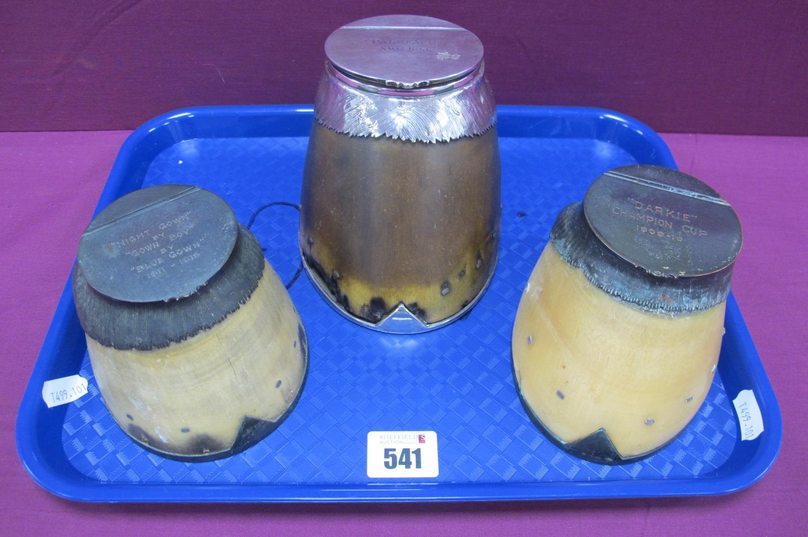 A Victorian Hallmarked Silver Mounted Horse Hoof Inkwell, RW, London 1896, the flat hinged lid engraved "Paleface Xmas 1896", also inscribed to the applied hallmarked silver horseshoe "Rowland Ward & Co Limited 166 Piccadilly S. W."; Together with Two Further Horse's Hooves, each as a table vesta, inscribed "Night Gown by Gown Boy by Blue Gown 1911-1919" and "Darkie Champion Cup 1909-10", both also inscribed "Rowland Ward Limited". (3)