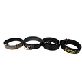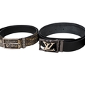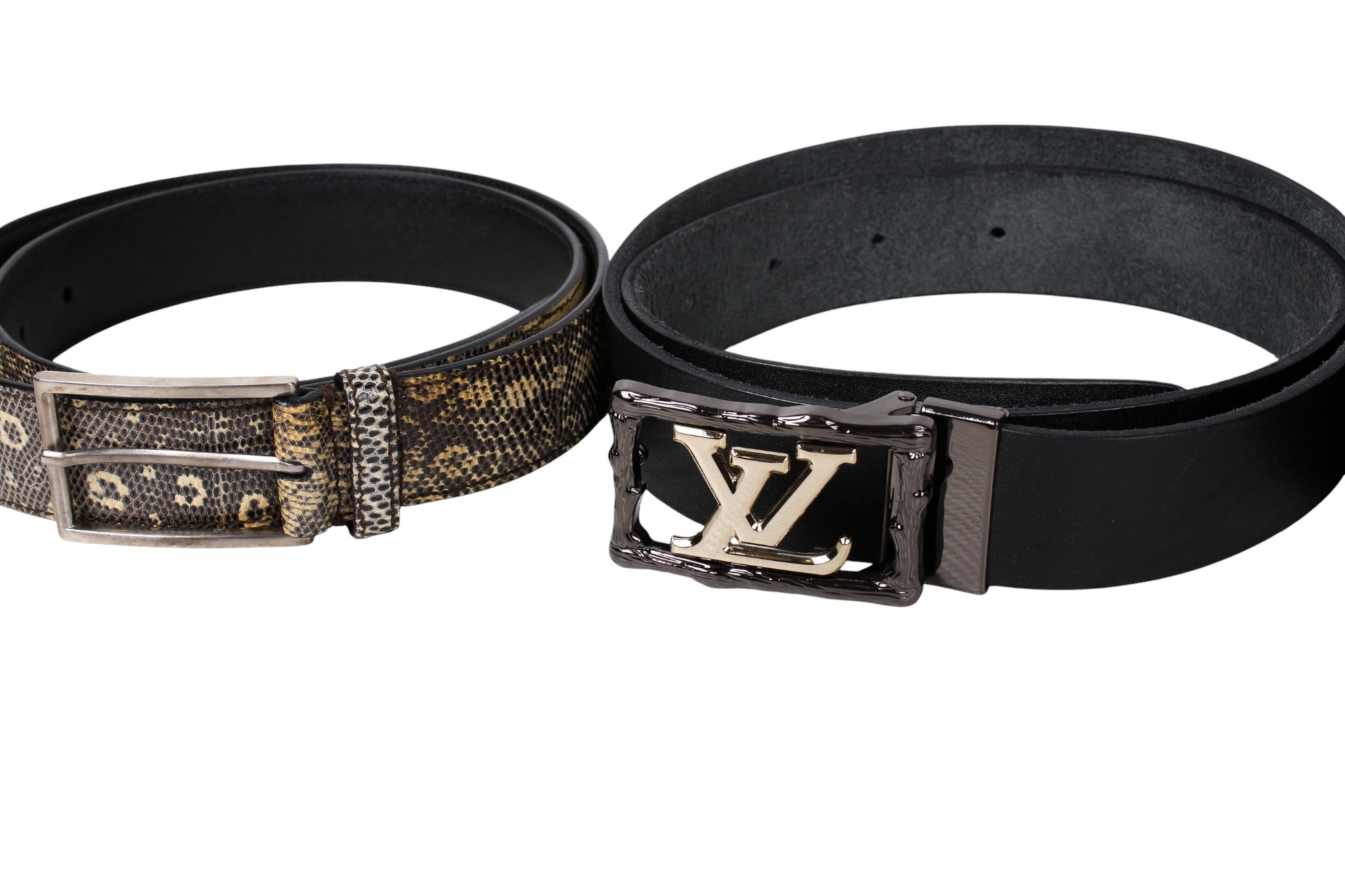 Four designer belts. Comprising a Prada faux snakeskin belt with a chrome buckle, stamped '2C1468251', length 100cm, a Diesel blue fabric belt stamped 'diesel ind' in yellow with brass hardware, length 105cm, a Louis Vuitton black leather belt with chrome hardware, length 99cm and an Armani black leather belt with grey metal hardware, length 99cm.