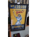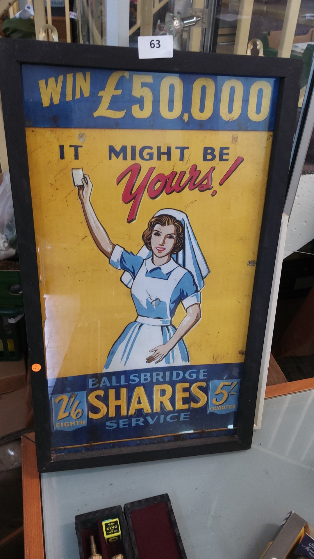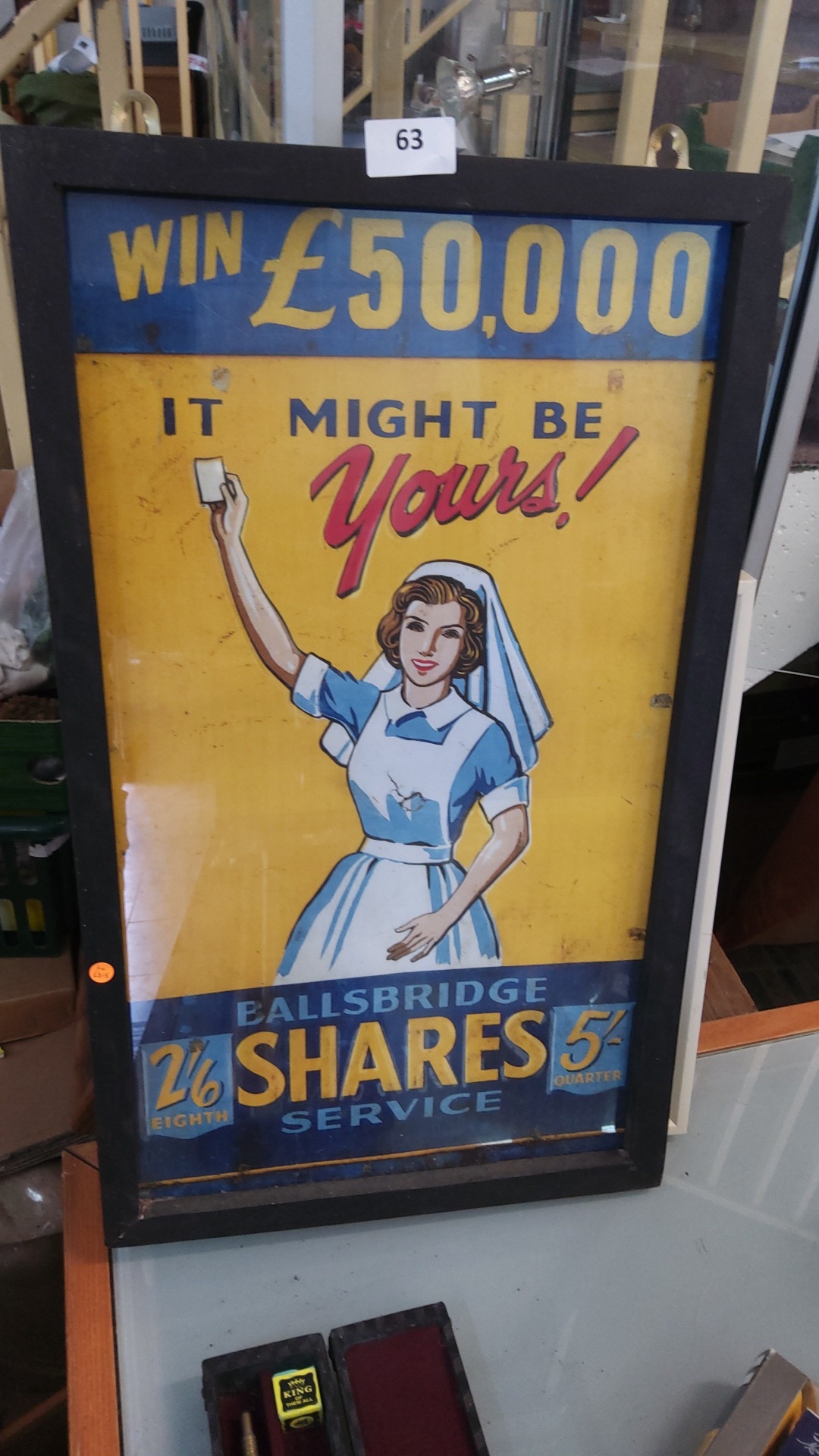 Framed colour lithograph poster promoting Ballsbridge Shares Service, featuring nurse figure under slogan “Win £50,000 – It Might Be Yours!”, c.1950s.