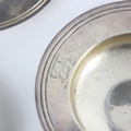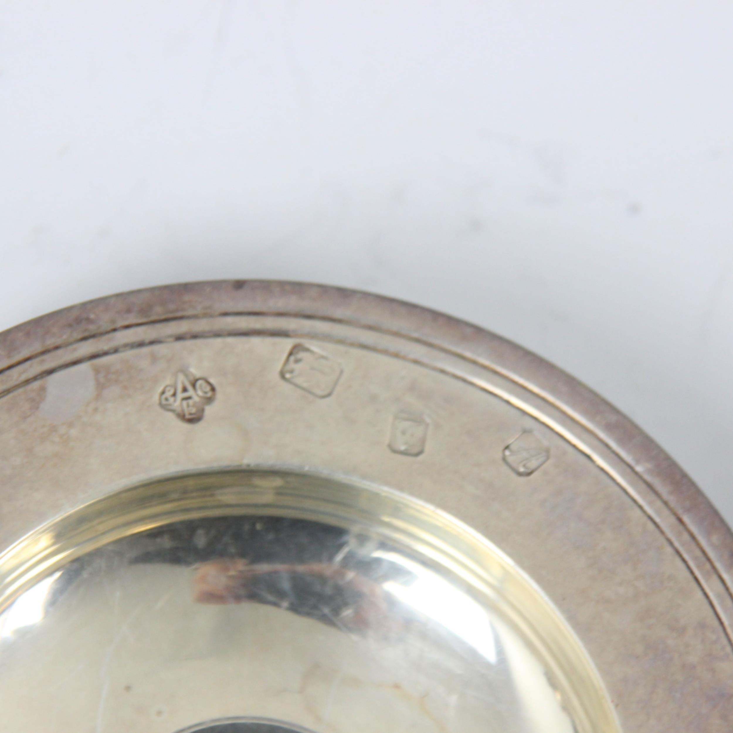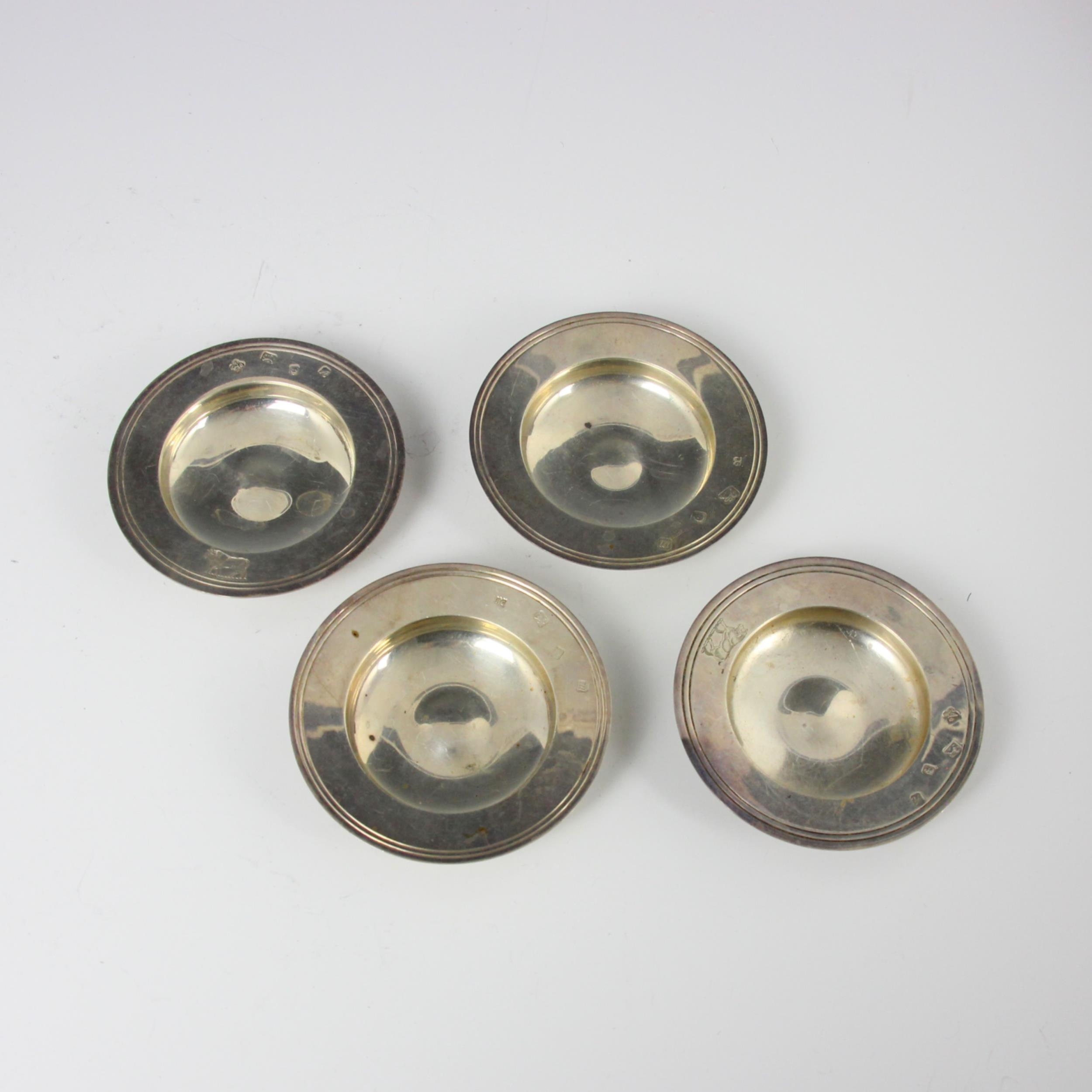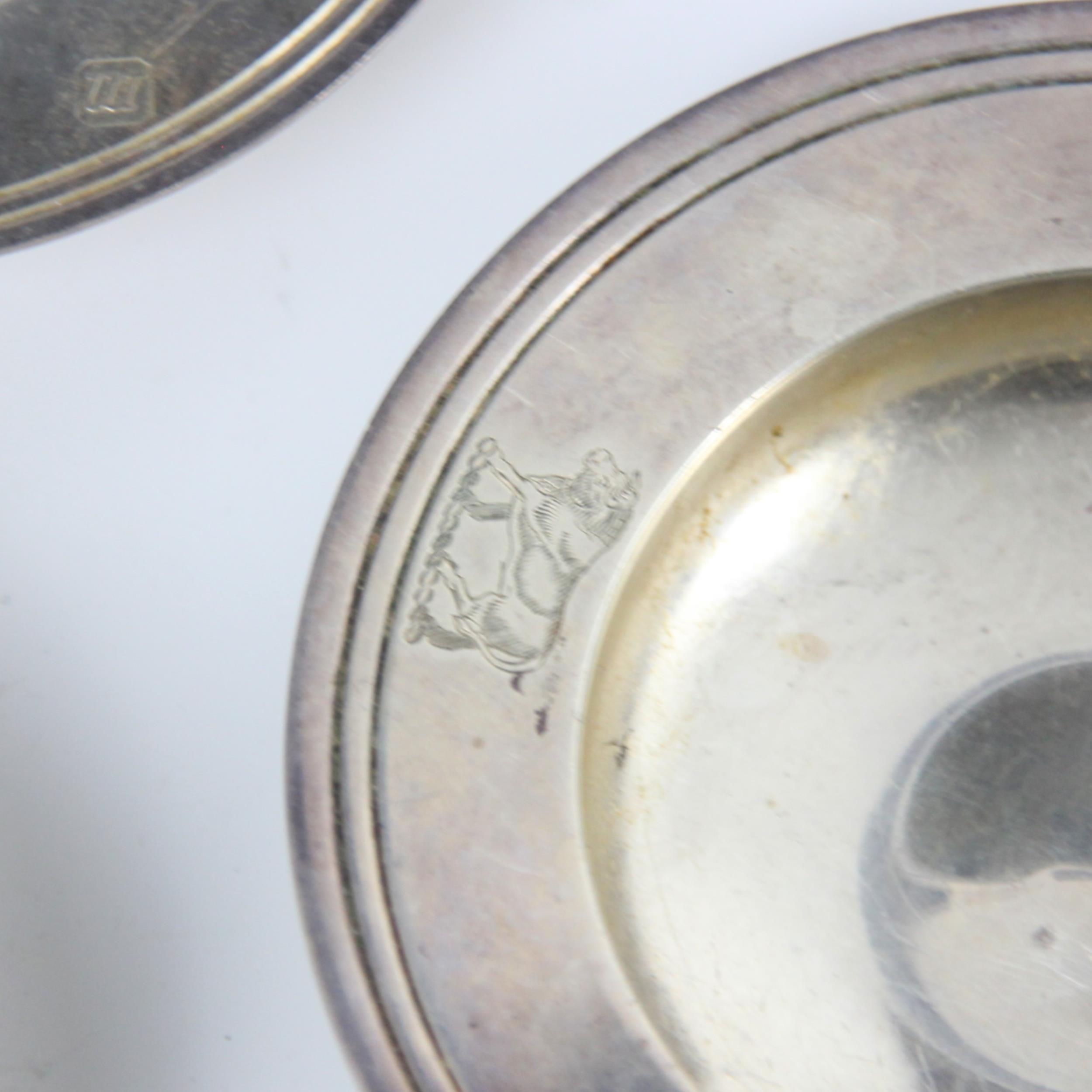 A pair of late 20th century silver trinket dishes, Asprey and Co Ltd, London 1975, of circular form with engraved crest to rim, 9.5cm diameter, with a pair of similar examples, William Comyns & Sons, London 1967, 9.5cm diameter, gross weight 7ozt (4)