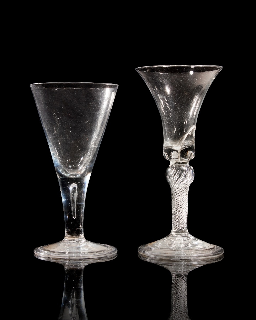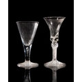 Two large George II wine glasses, the first c.1735, the drawn funnel bowl on a plain stem enclosing a tear and folded foot, 20.1cm high, the second c.1740-5, the bell bowl with knopped air-twist stem and folded foot, 22.2cm high (2)
