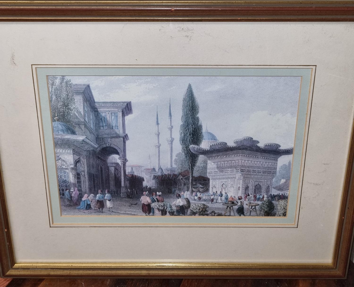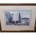 A coloured Print of a street scene.
