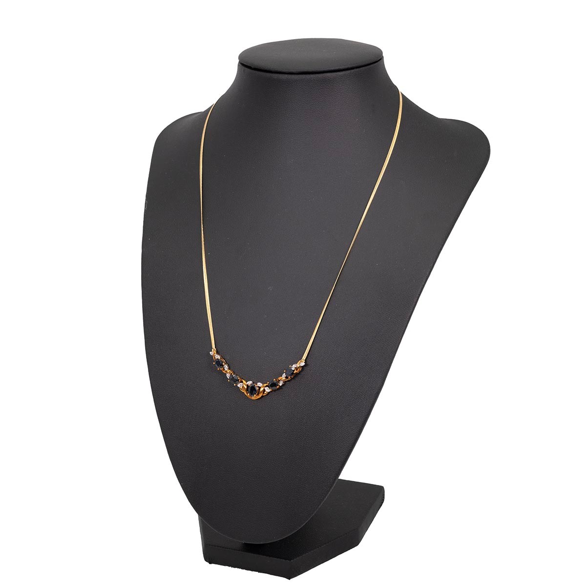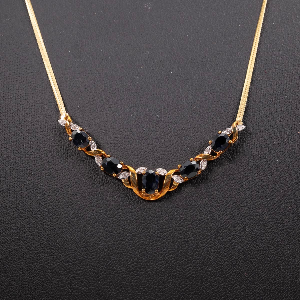 9ct gold sapphire and diamond pendant necklace, the pendant set with five sapphires and twelve diamonds, L45cm, weight 4 grams.