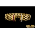 Italian Designer 18ct Two Tone Gold Bangle In a Basket Weave Design, The Ends Set In Diamonds and Rubies. Marked 750 - 18ct. The Diamonds and Rubies of Excellent Colour. Diamond Weight 1.00 cts - Marked to Clasp. Est Rubies Weight 1.00 cts. c.1960's / 1970's. 58.6 grams. Condition Excellent In All Aspects.