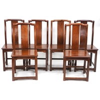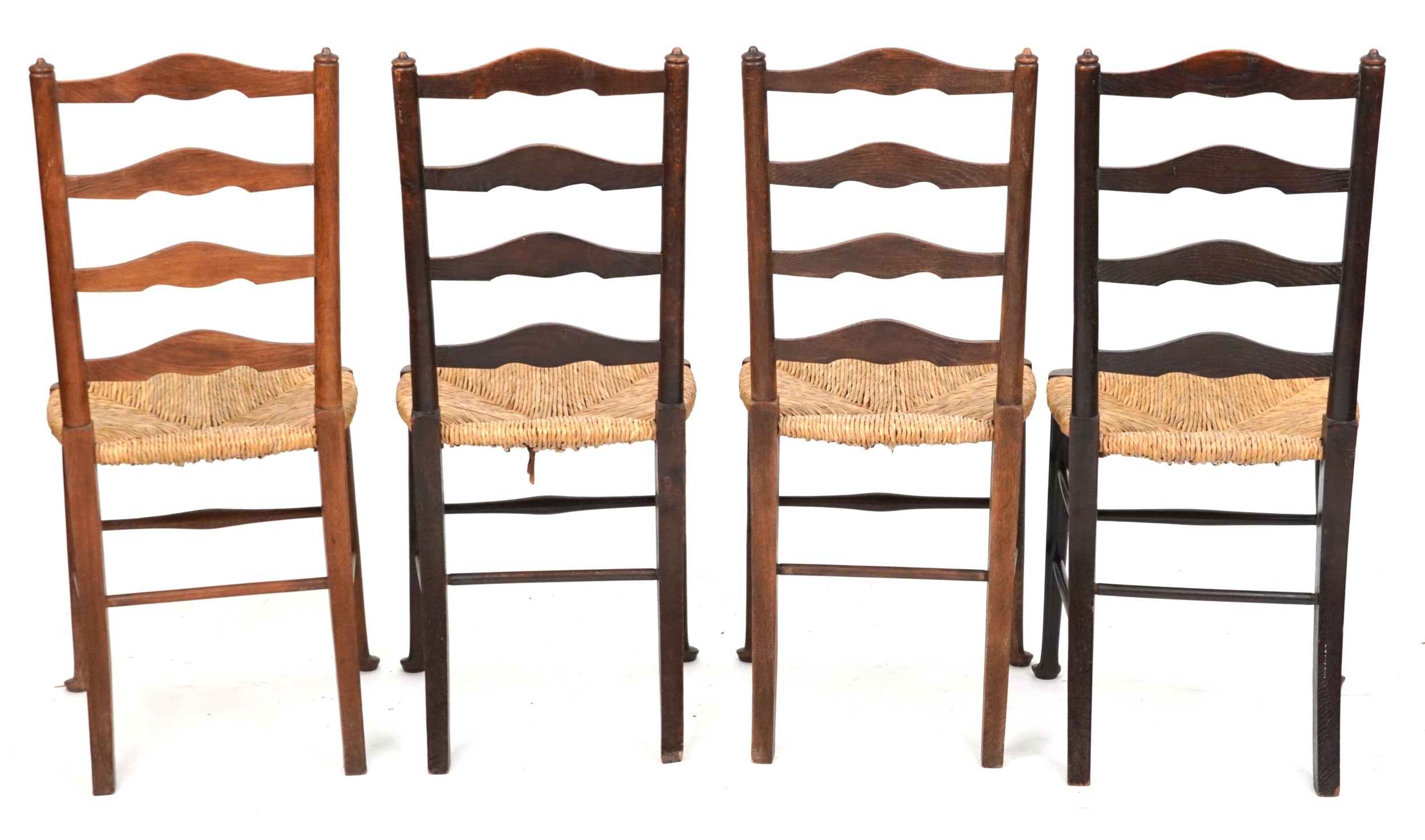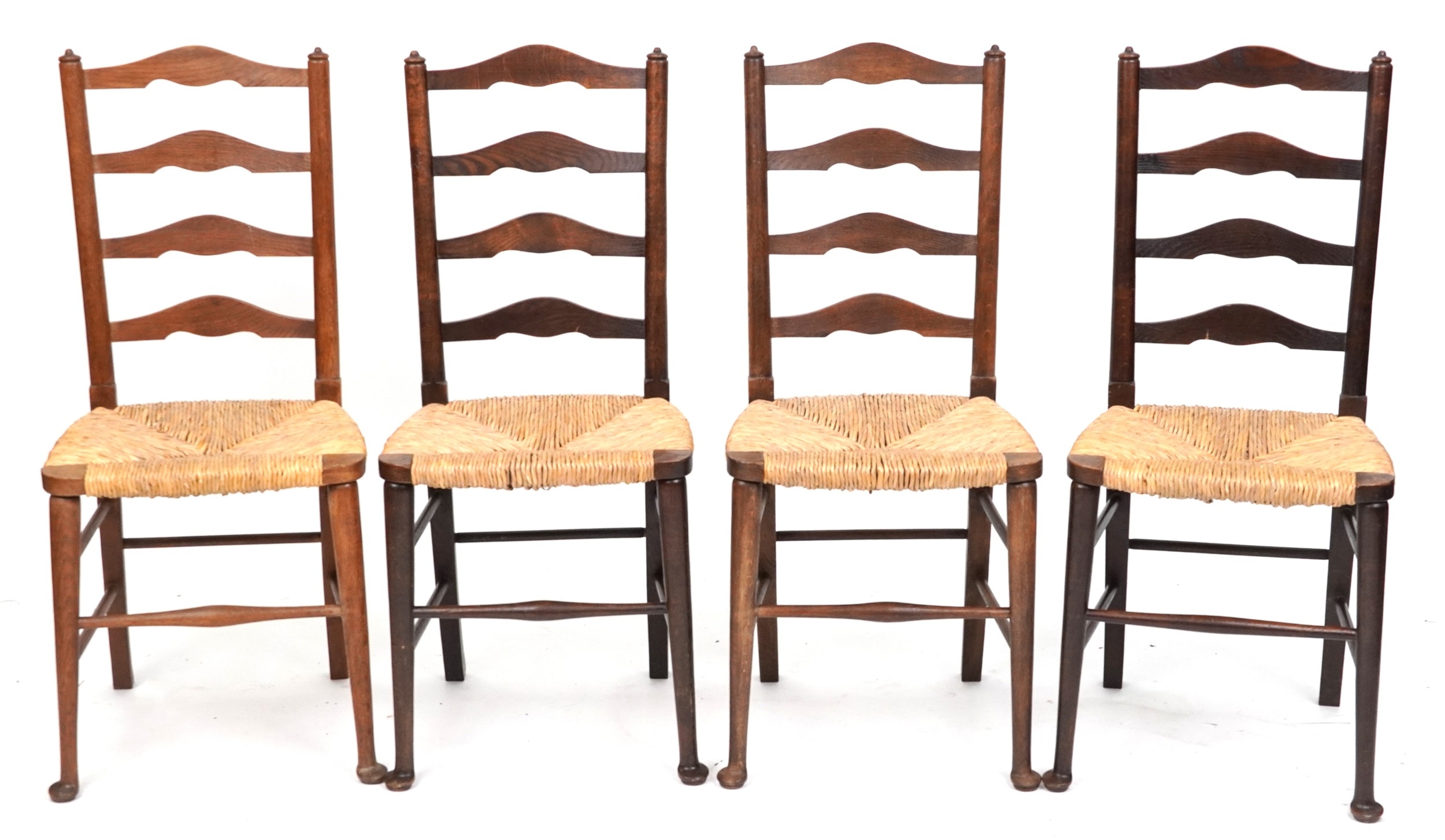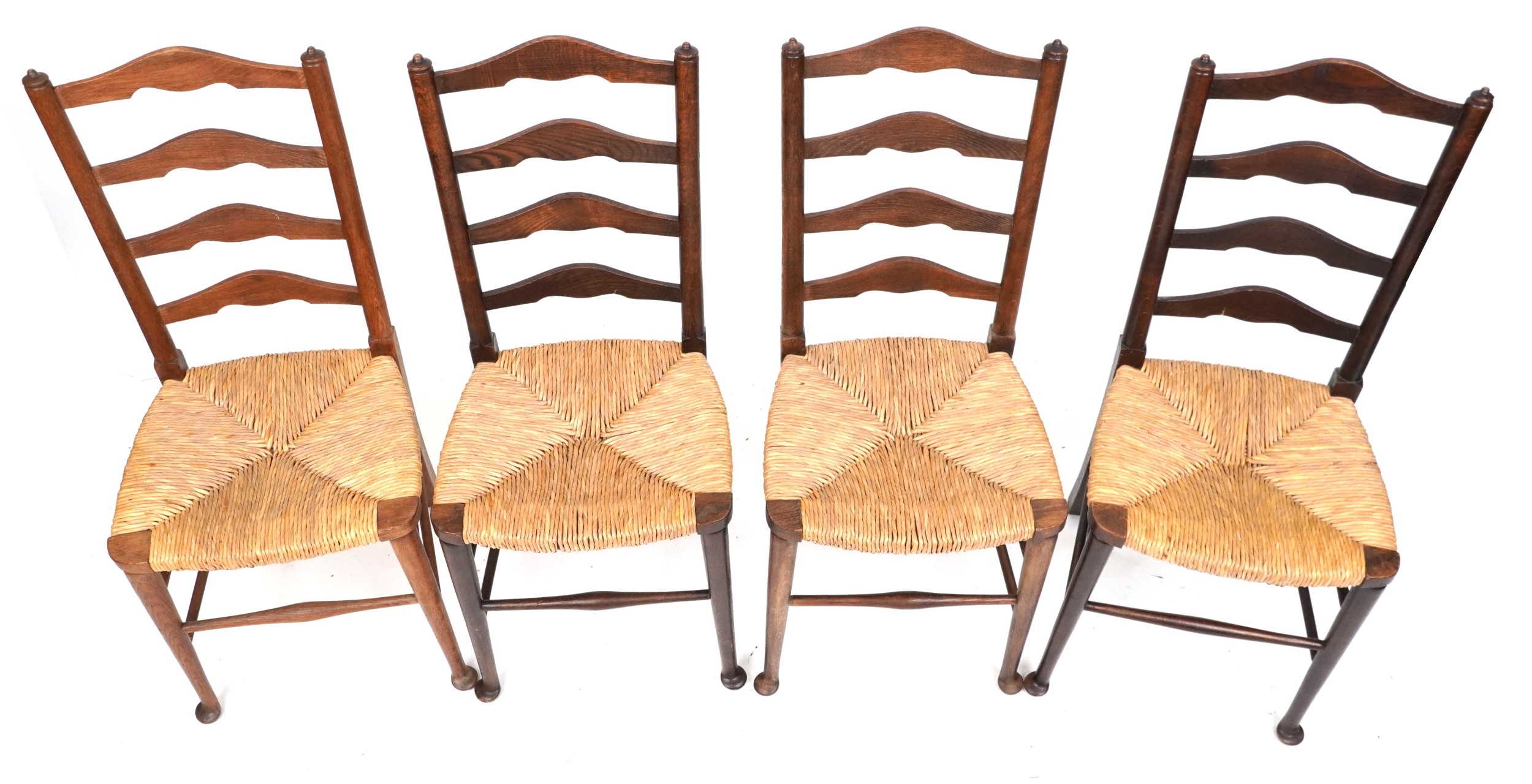 A matched set of four early 20th century oak ladder back chairs after a design by Edwin Lutyens, 94cm high x 41cm wide.