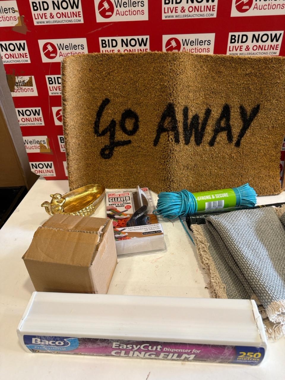 BAG OF ASSORTED HOMEWARE ITEMS INCL.CLING FILM DISPENSER & SCISSOR ACTION CLEAVER