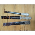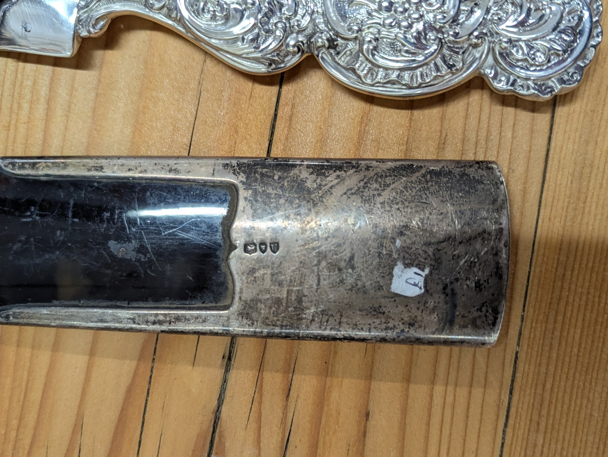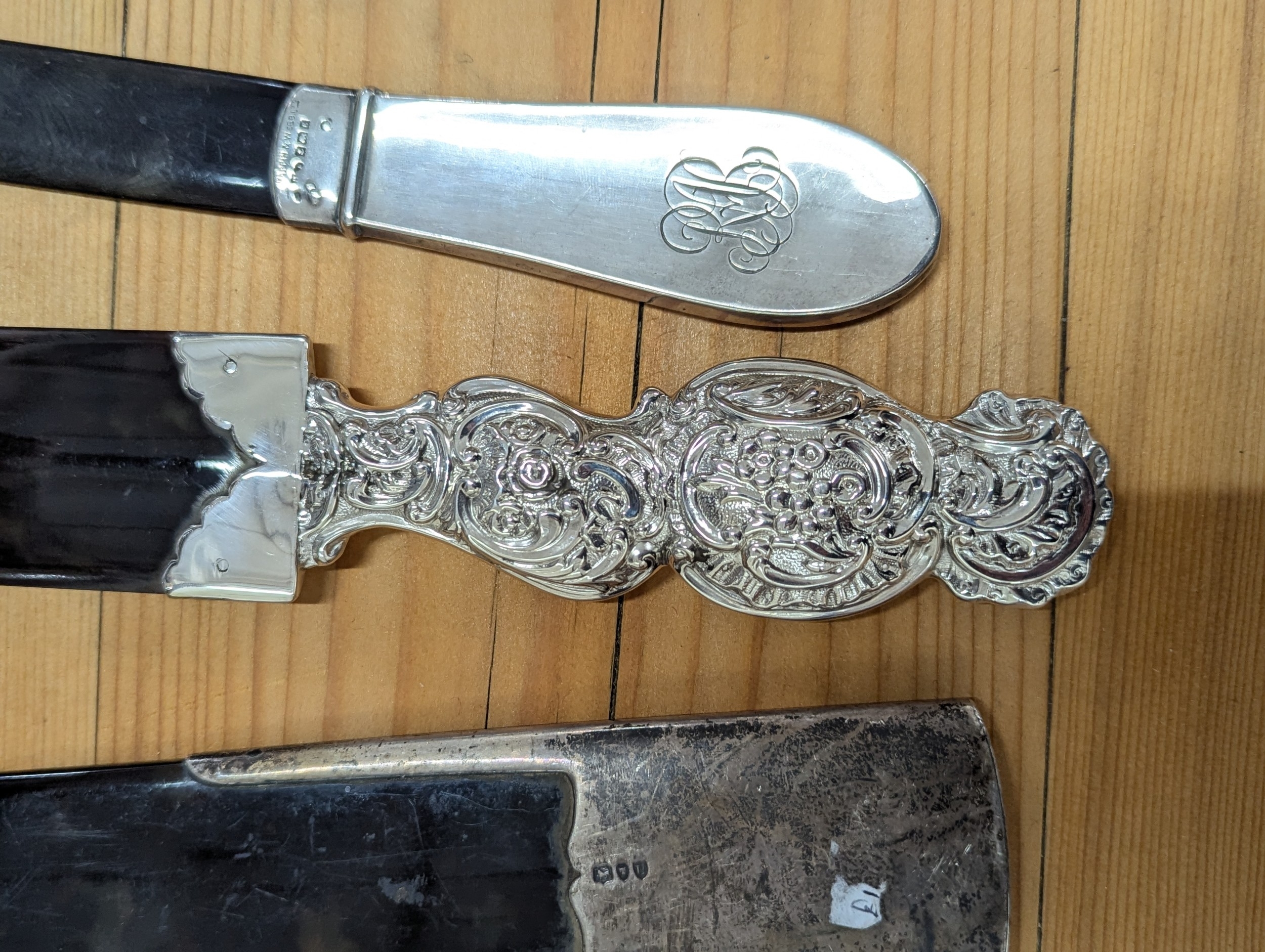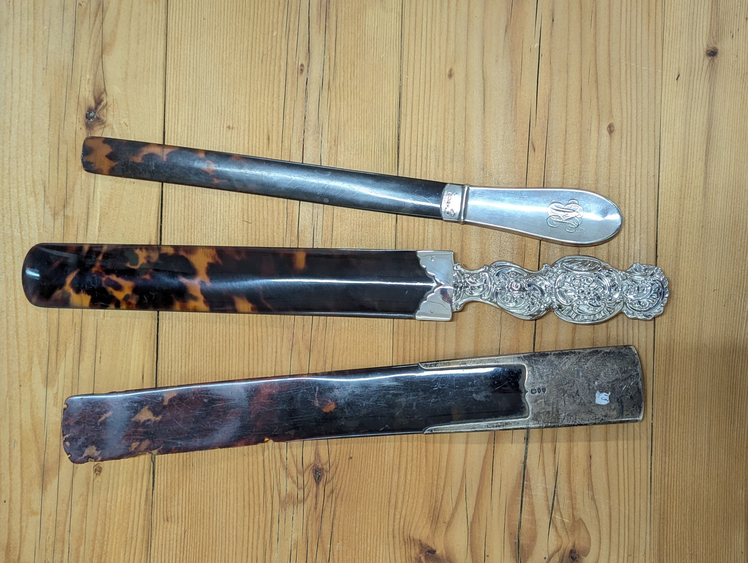 Three silver handled and tortoiseshell page turners, one example by Mappin & Webb Ltd, hallmarked Birmingham 1906