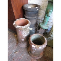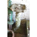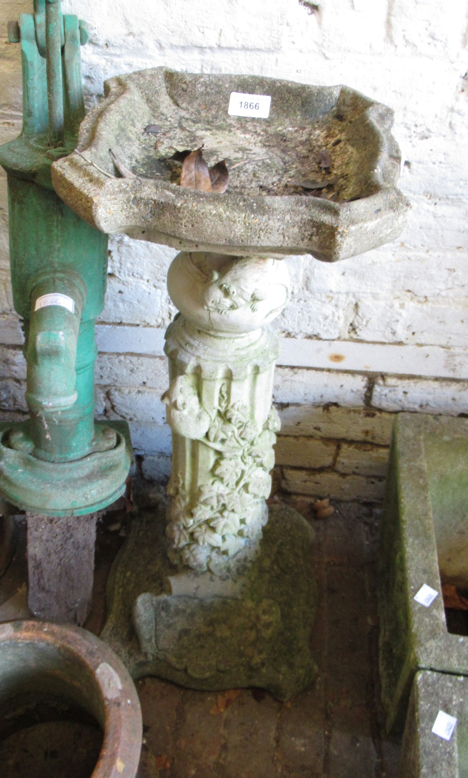 Weathered cast concrete garden bird bath and a cast iron water pump