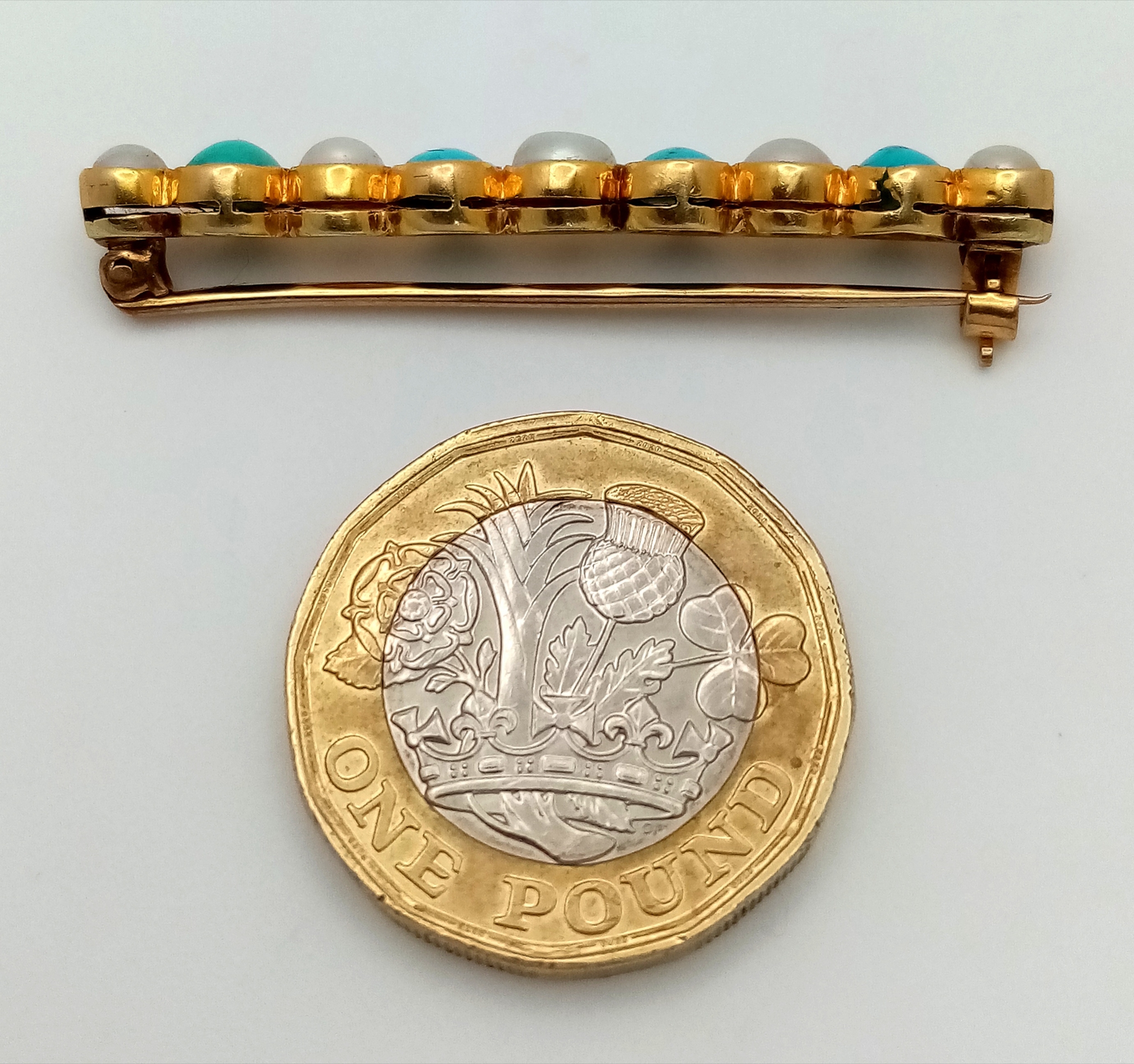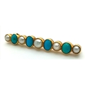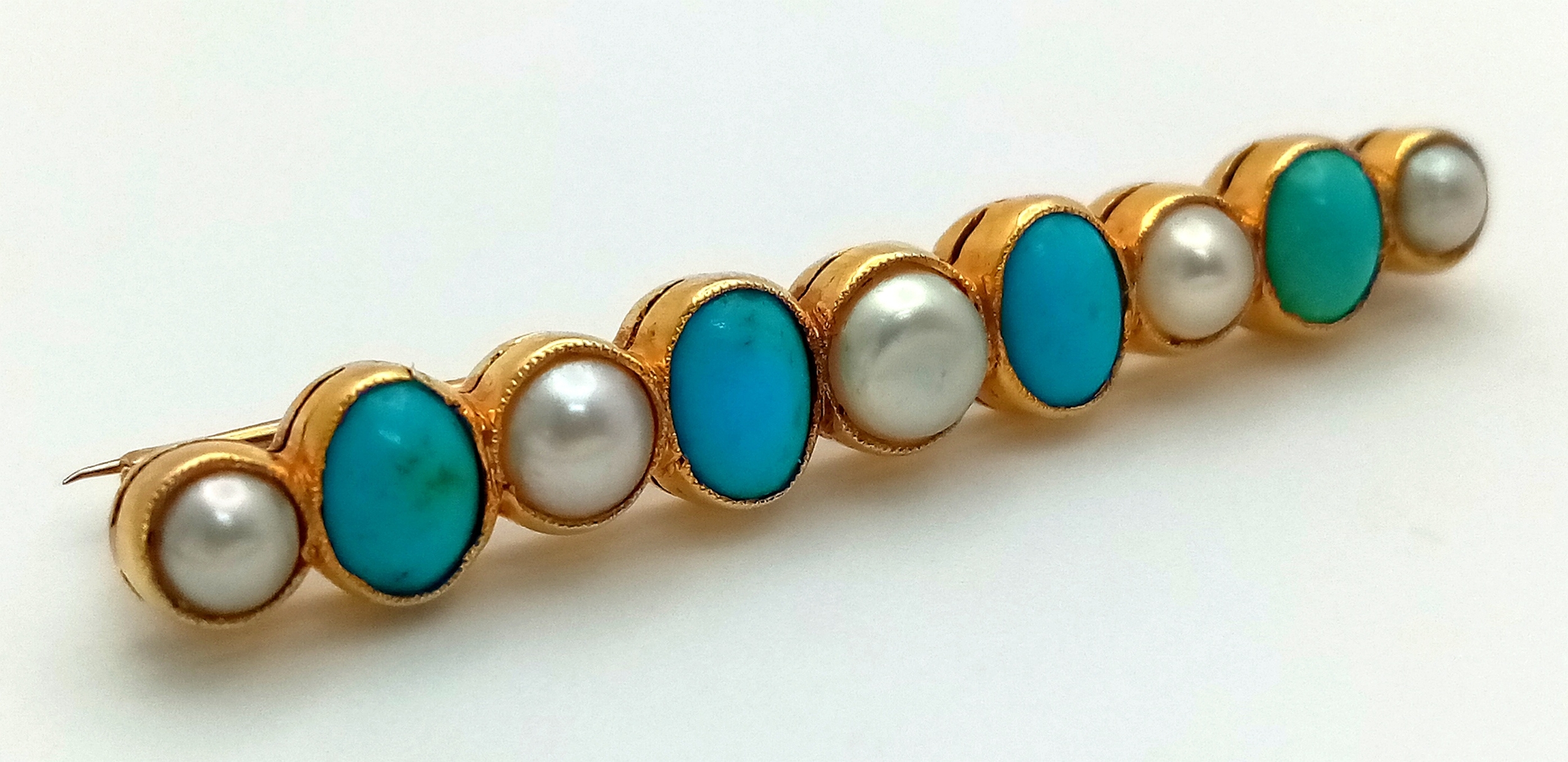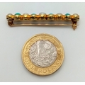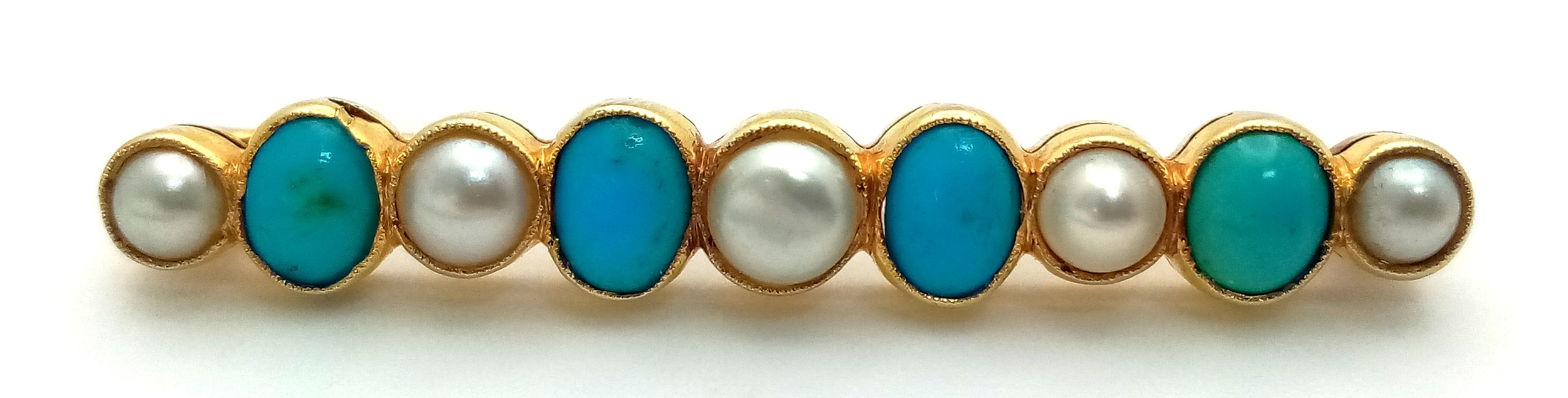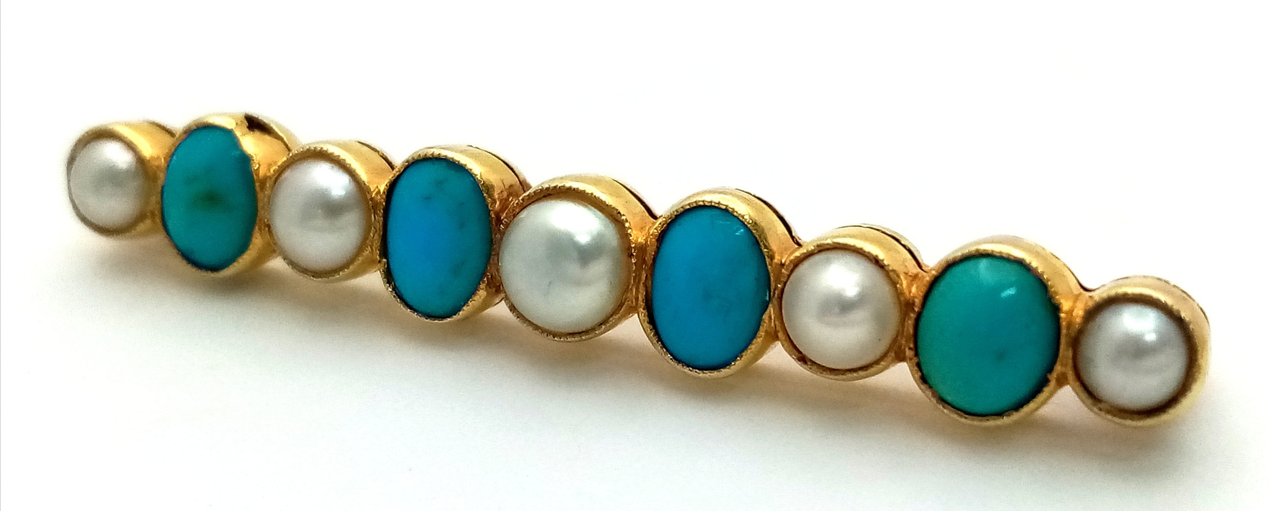 An Antique, Victorian, 18K Gold (tested) Pearl and Turquoise, Bar Brooch. 4cm. 3.8g total weight.