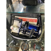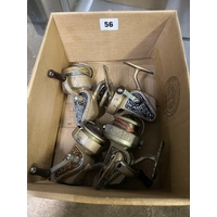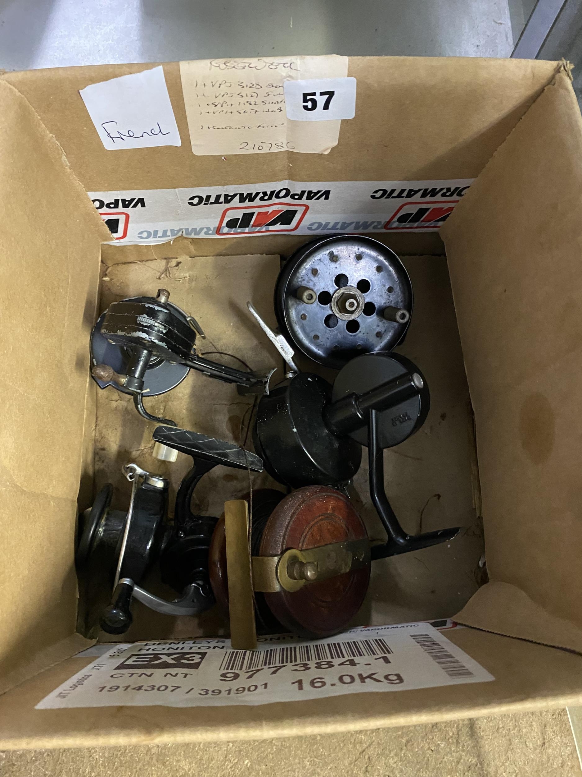 Five reels - two Intrepid, vintage Mitchell, wood & brass reel, metal strap back reel