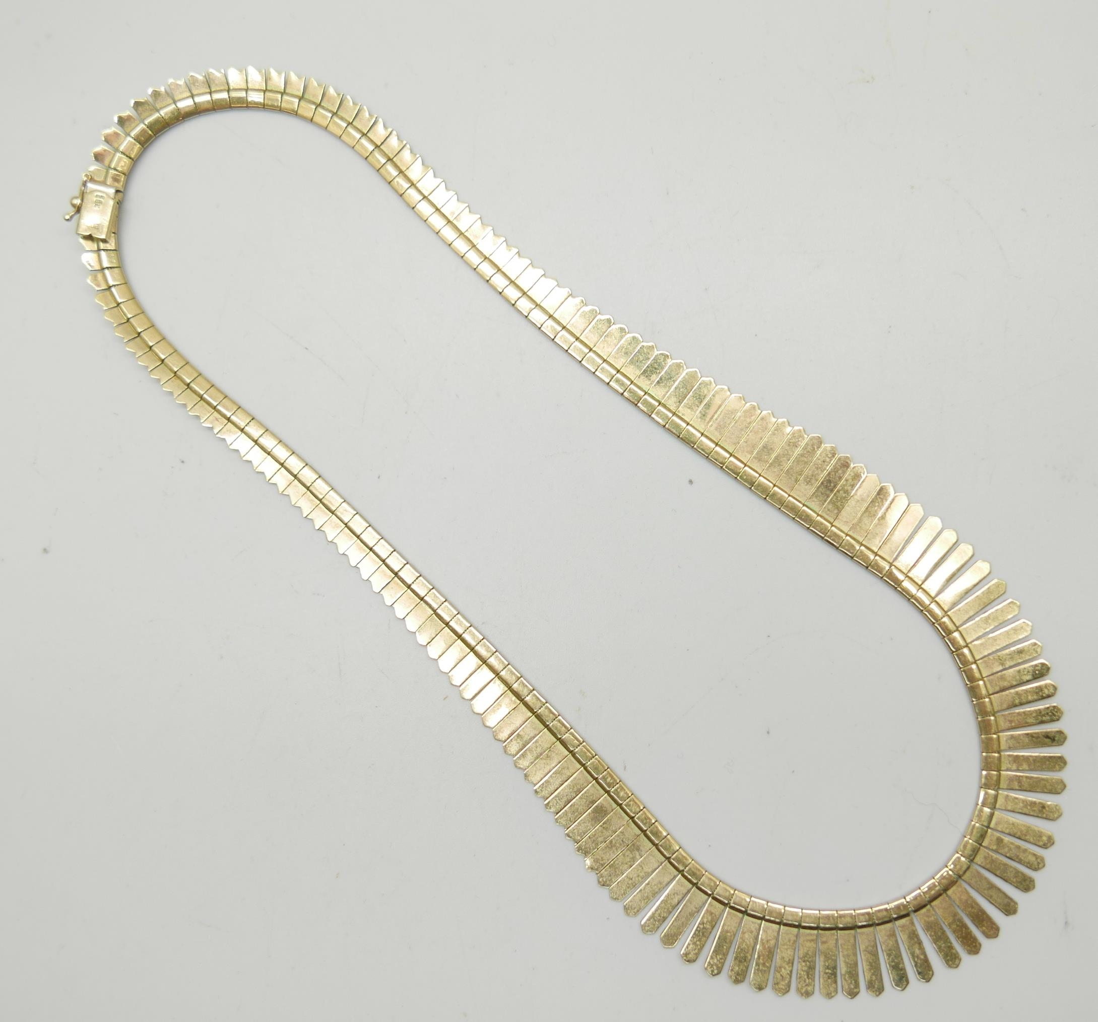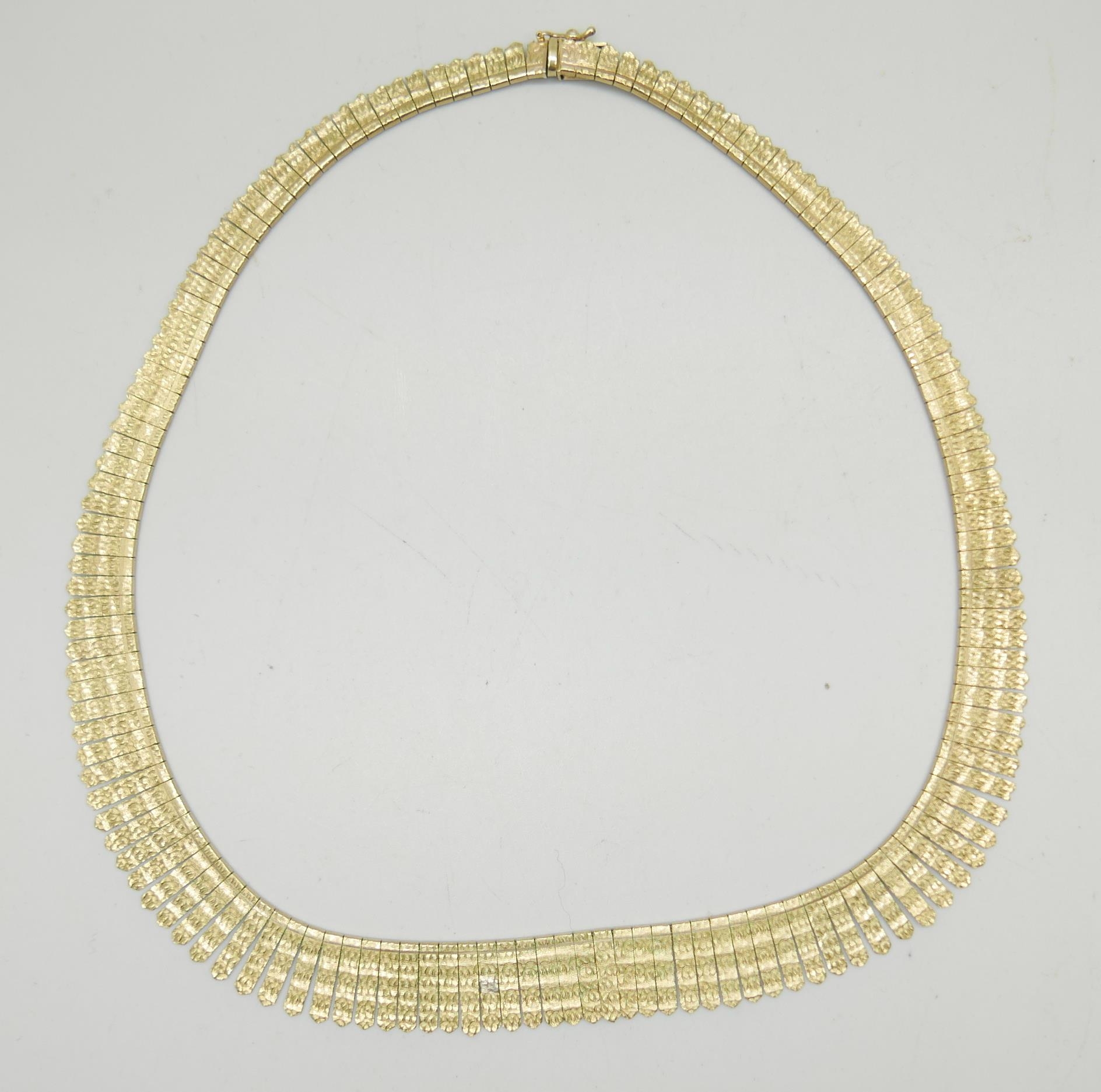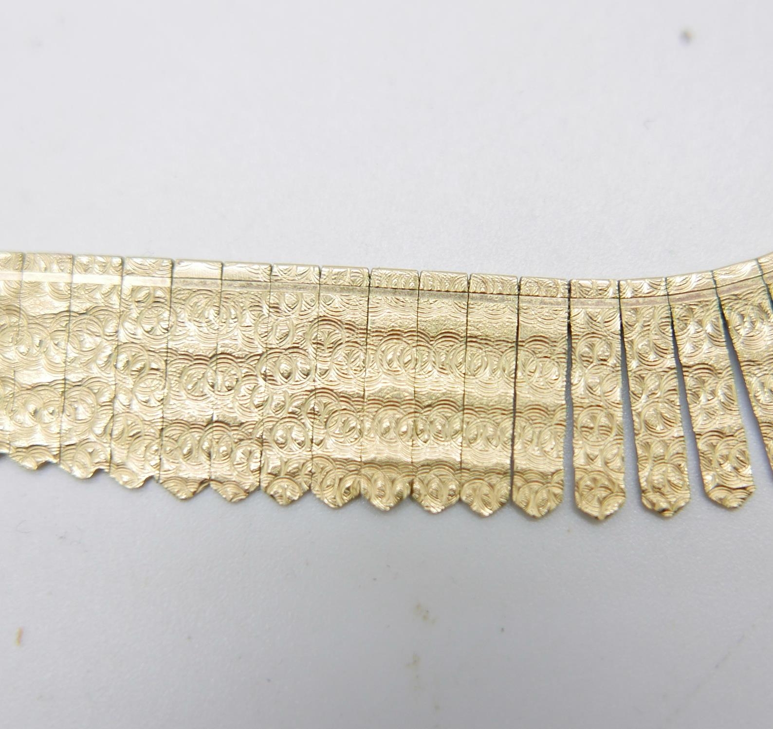 A 9ct gold fringe necklace with textured design, 44.5cm, 22g