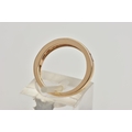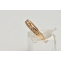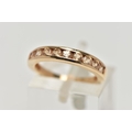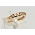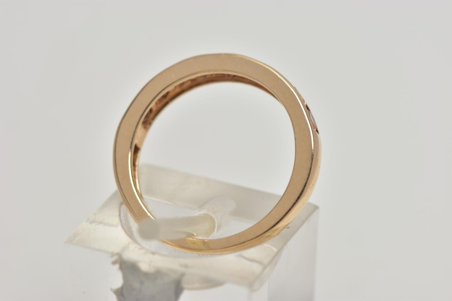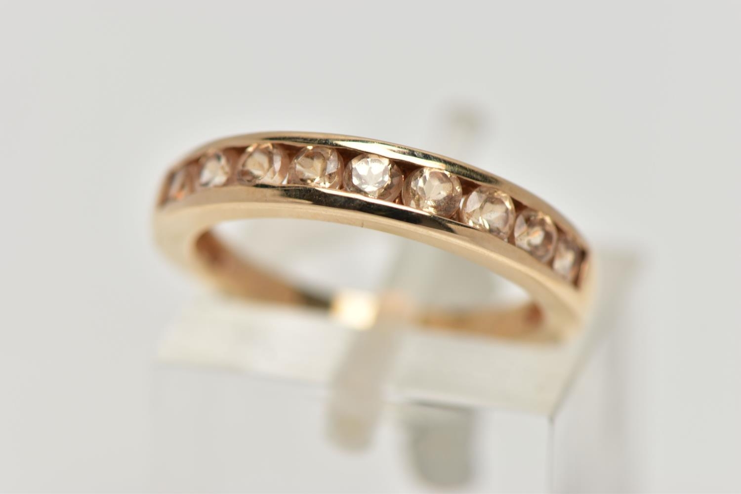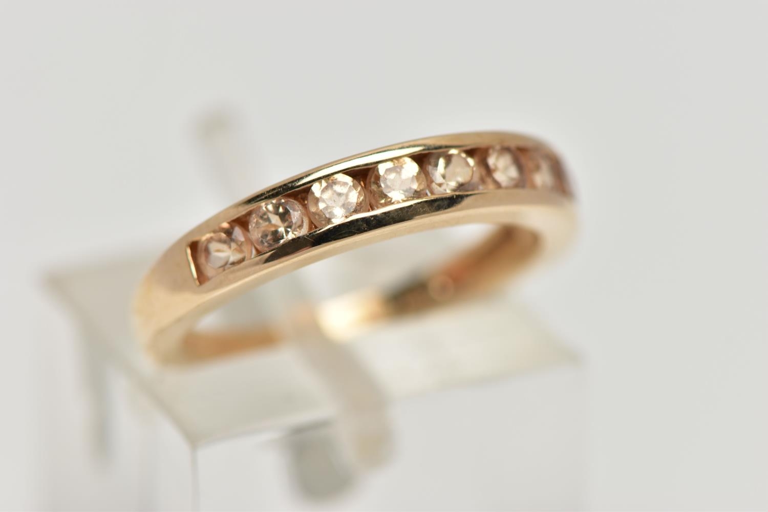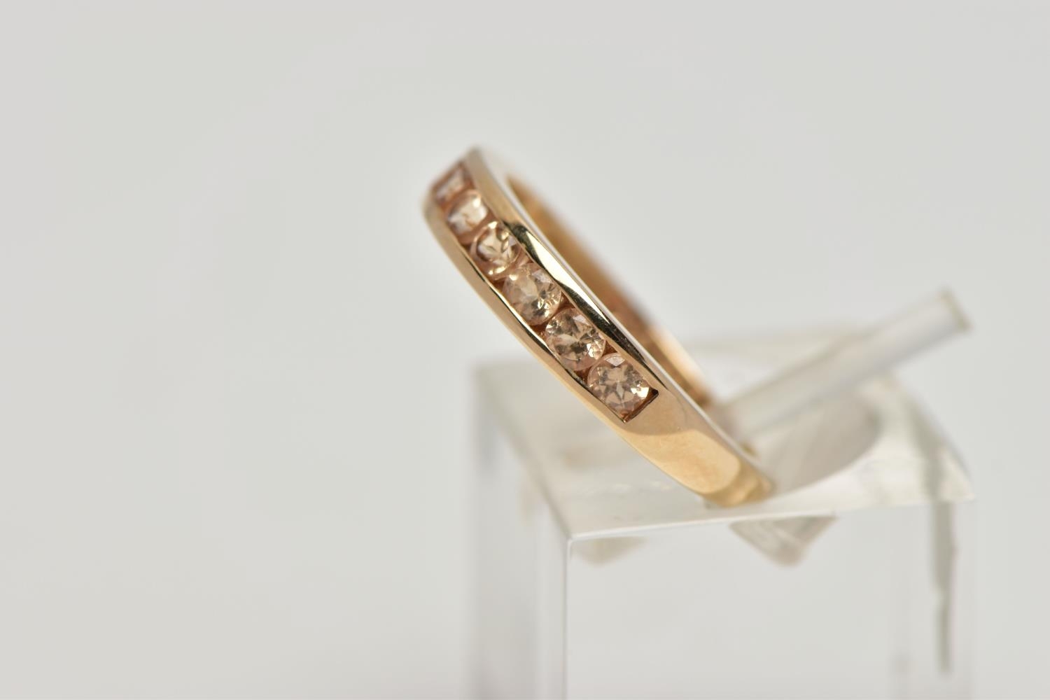 A 9CT GOLD GEM SET HALF ETERNITY RING, the circular shape peachy colour gems assessed as tourmaline, within a channel setting to the plain band, hallmarked Birmingham 2015, ring size I 1/2, approximate gross weight 2 grams (condition report: overall in good condition, with some minor nibbles to table and crown facets)