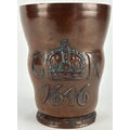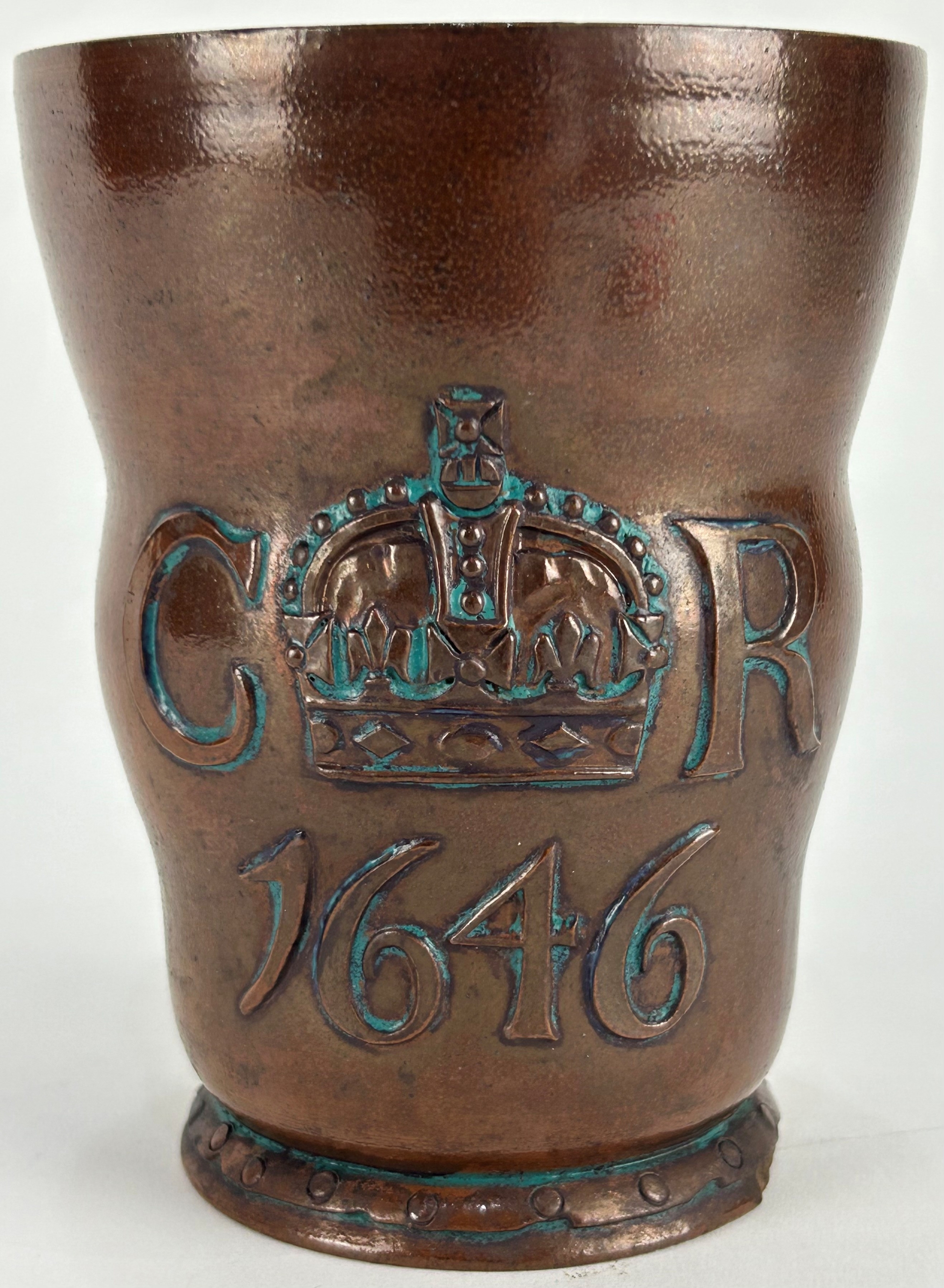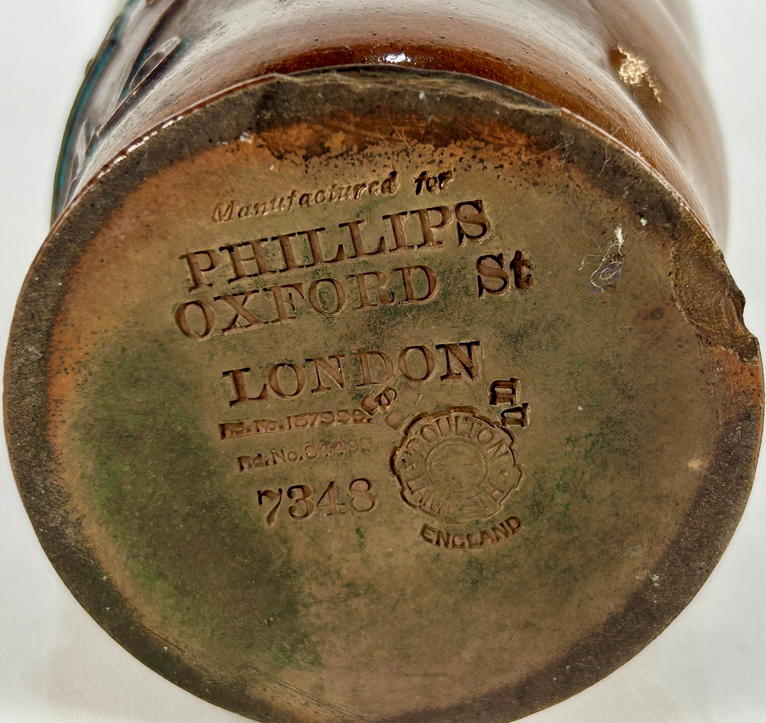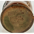 A Doulton Lambeth stoneware beaker, manufactured for Phillips, Oxford Street, London, late 19th / early 20th century, modelled in the form of a leather jug that was said to have been made for King Charles 1st when he visited Salisbury in 1646, 14cm high, (chips to base rim).