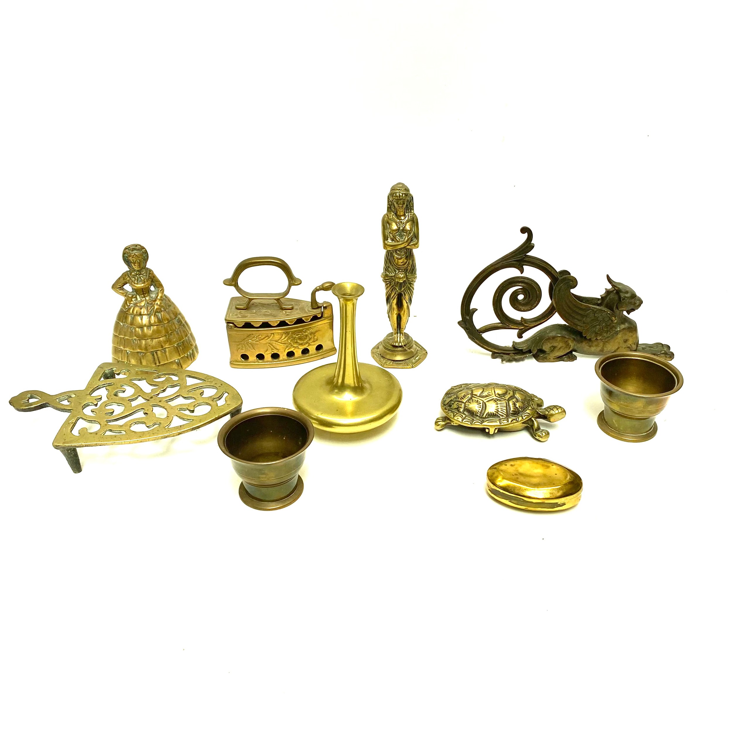 A selection of heavy brass items including Egyptian figure, tortoise, snuff box and a brass/bronze winged lion