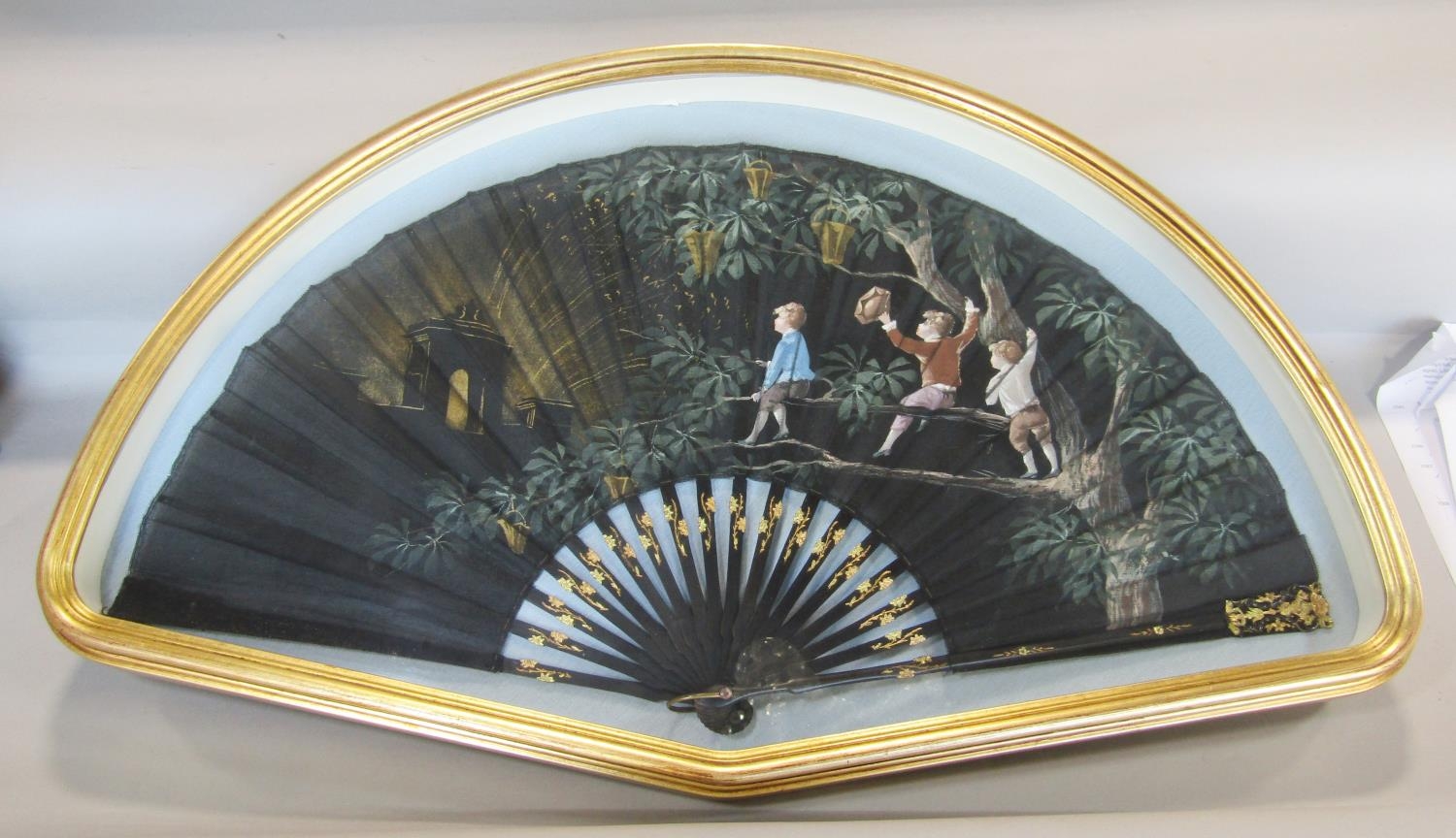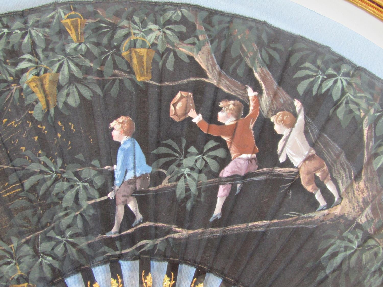 A late 19th century French fan on satin with ebony sticks, with painted detail showing three boys at a firework display in a bespoke gilded frame