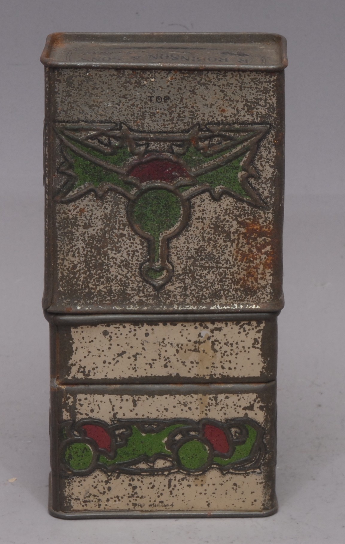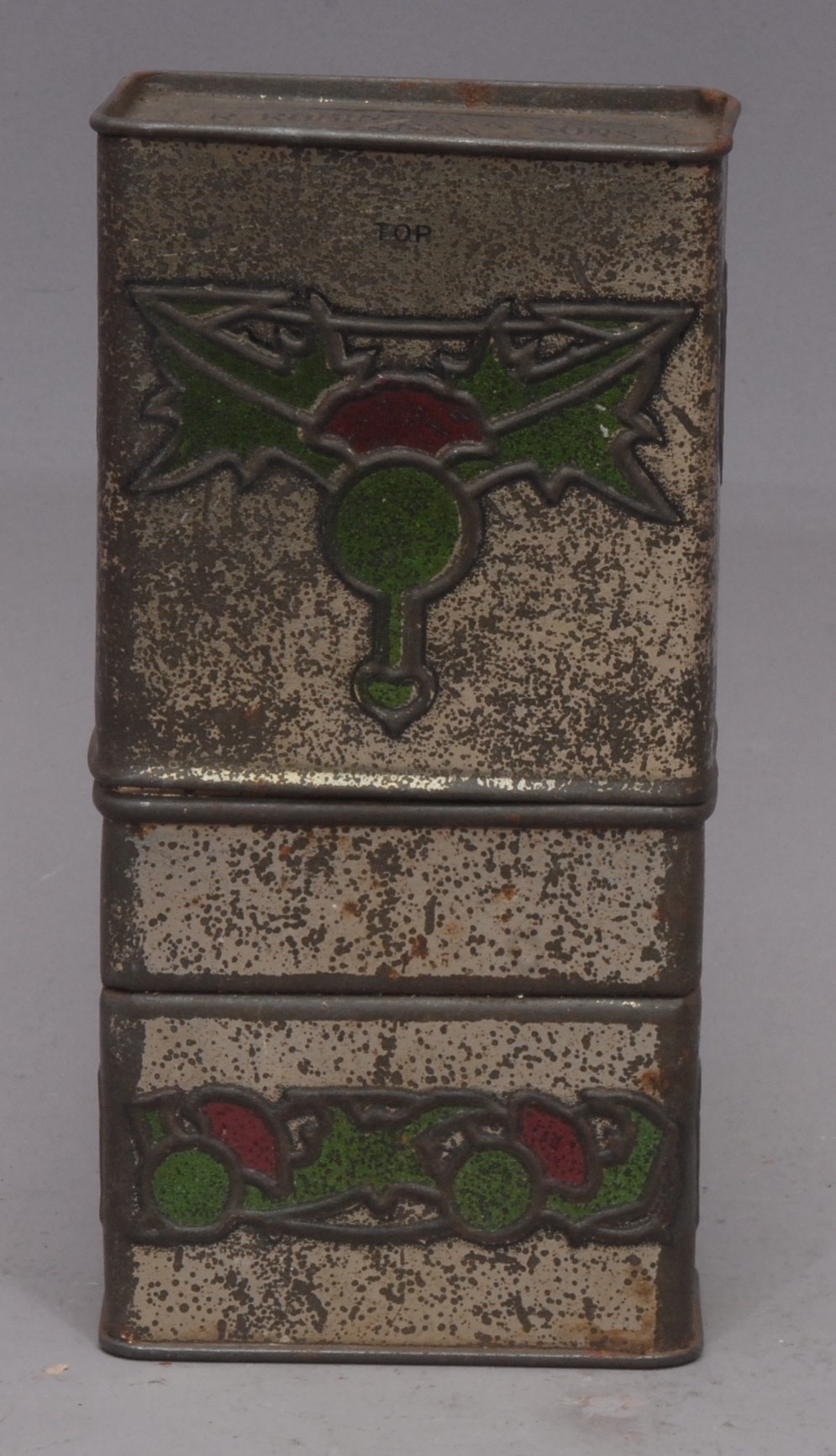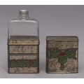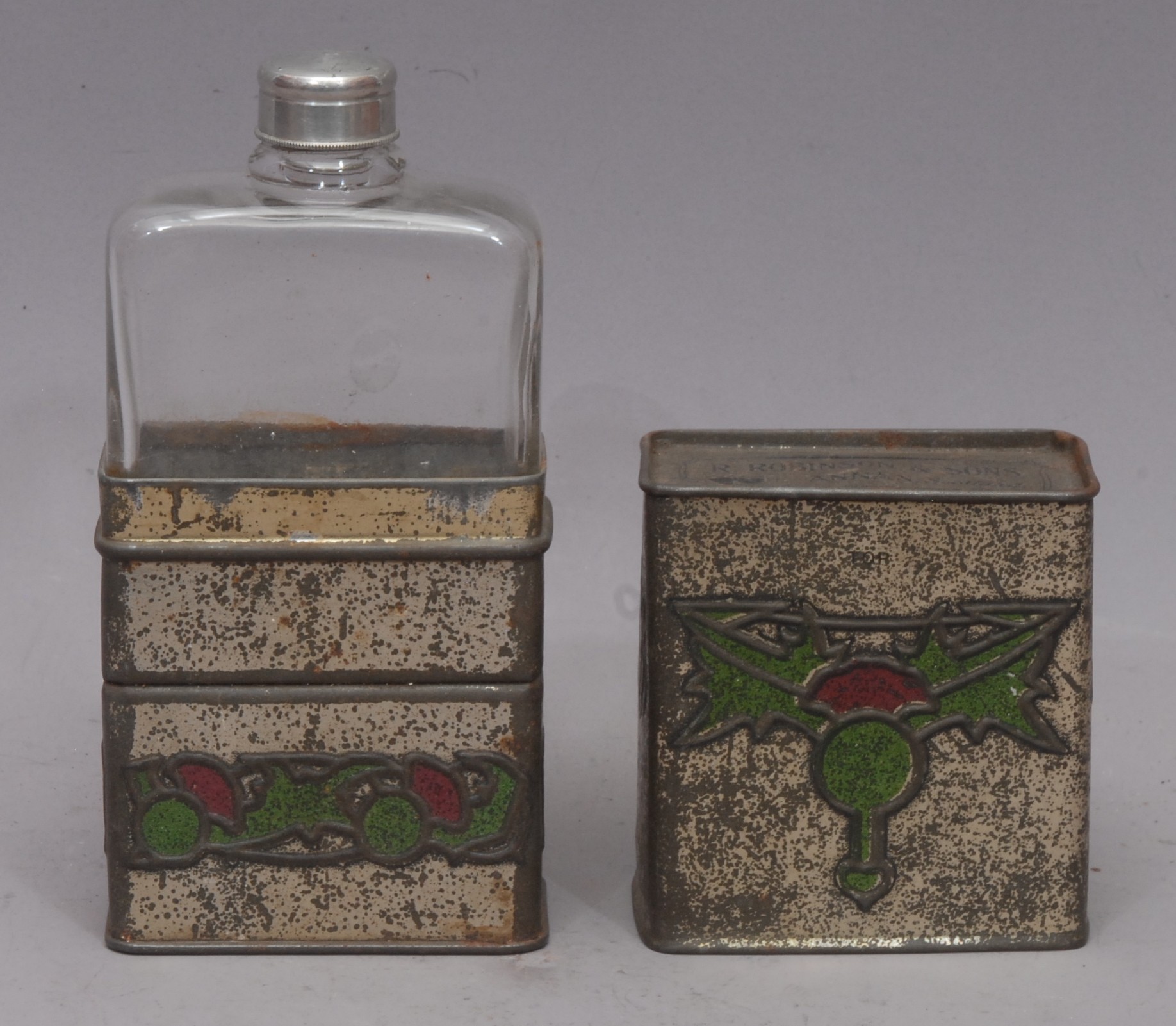 Advertising - a Scottish Art Nouveau promotional novelty biscuit tin whisky flask, by R Robinson & Sons, Annan, Scotland, embossed in the Macintosh taste with stylised thistles, the push-fitting cover enclosing a glass bottle, 16.5cm high, c.1915