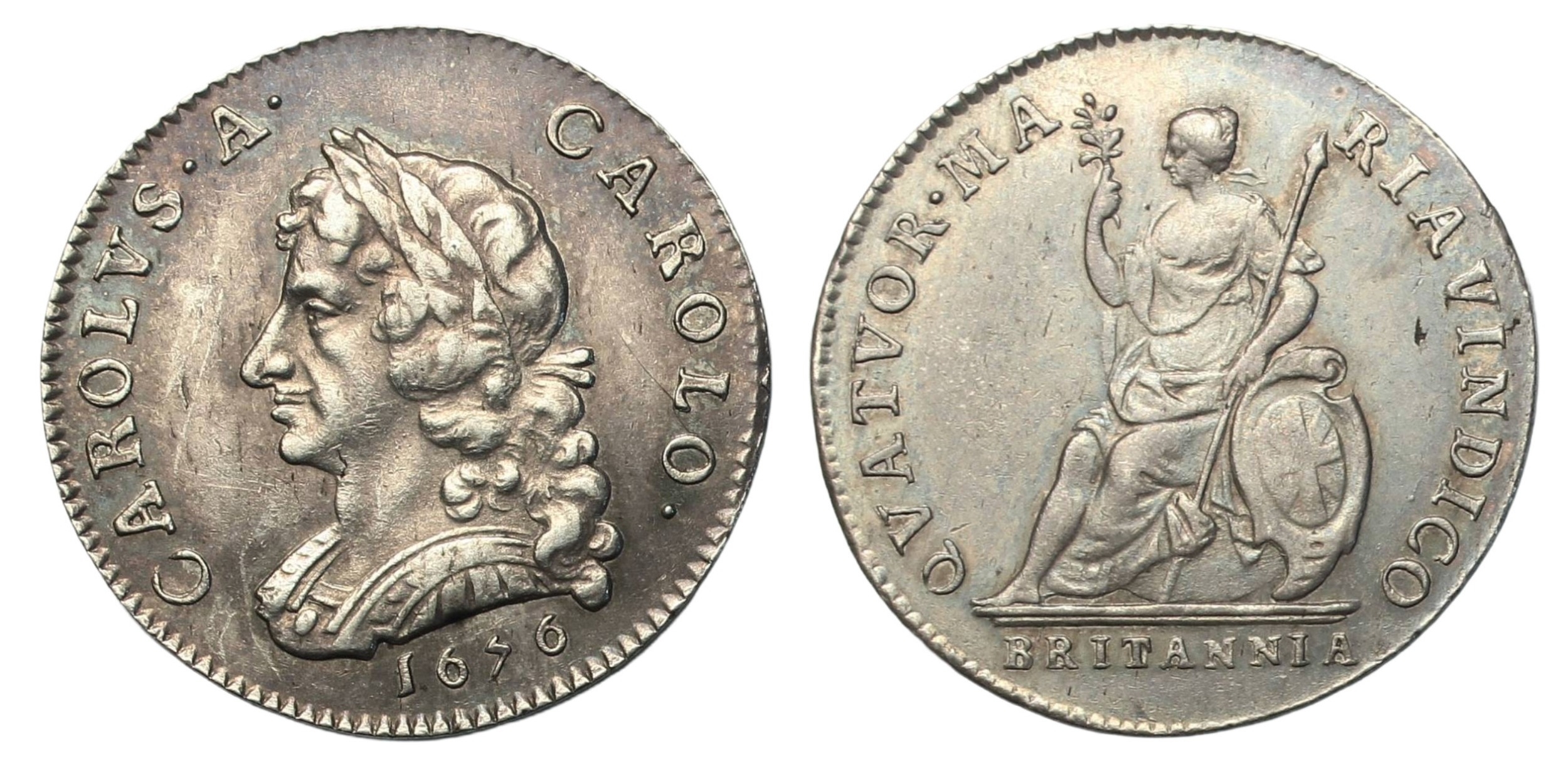 Charles II (1660-1685) Pattern Farthing (Medalet), 1676 Struck in silver, laureate and cuirassed bust left, date below, rev. Britannia seated left with shield, spear and spray of leaves, double exergue line, BRITANNIA below, plain edge, (Peck 492). Attractively toned, about very fine