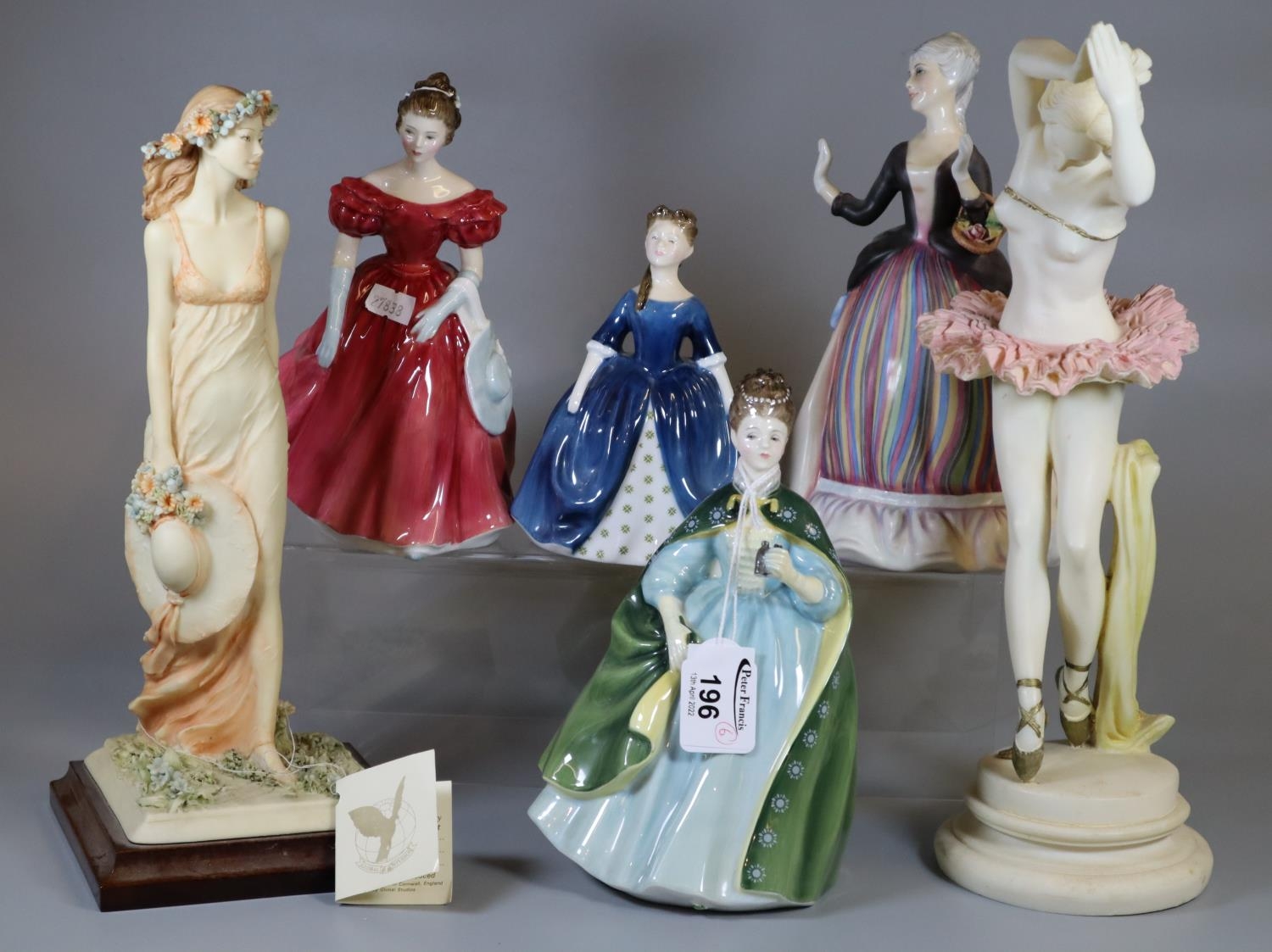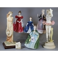 Four Royal Doulton bone china figurines to include Debbie, Premiere, Winsome, and The Gentle Arts flower arranging, together with two composite figurines of women. (6)