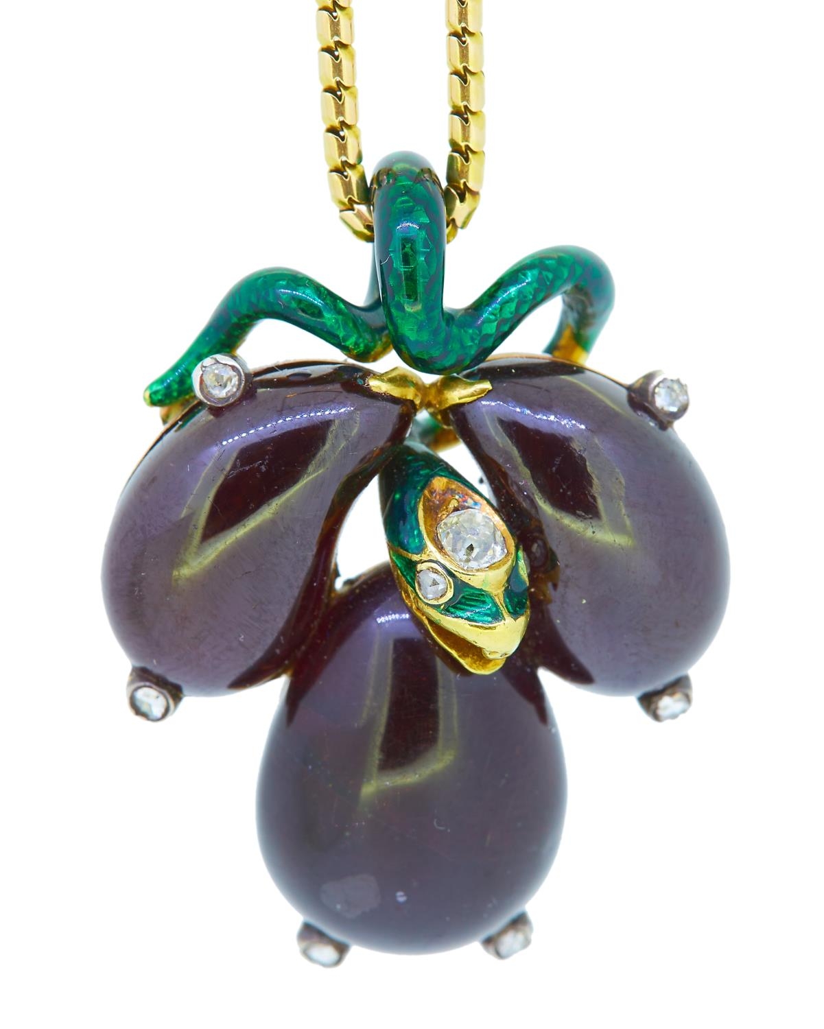 ANTIQUE GARNET ENAMEL AND DIAMOND SNAKE PENDANT, 3 cabochon cut garnets, suspending from curled snake decorated with green anemal and diamonds, with diamond accents underneath the garnets. The back with a glass compartment. With chain. L. pendant 3.7 cm. With a fitted box.