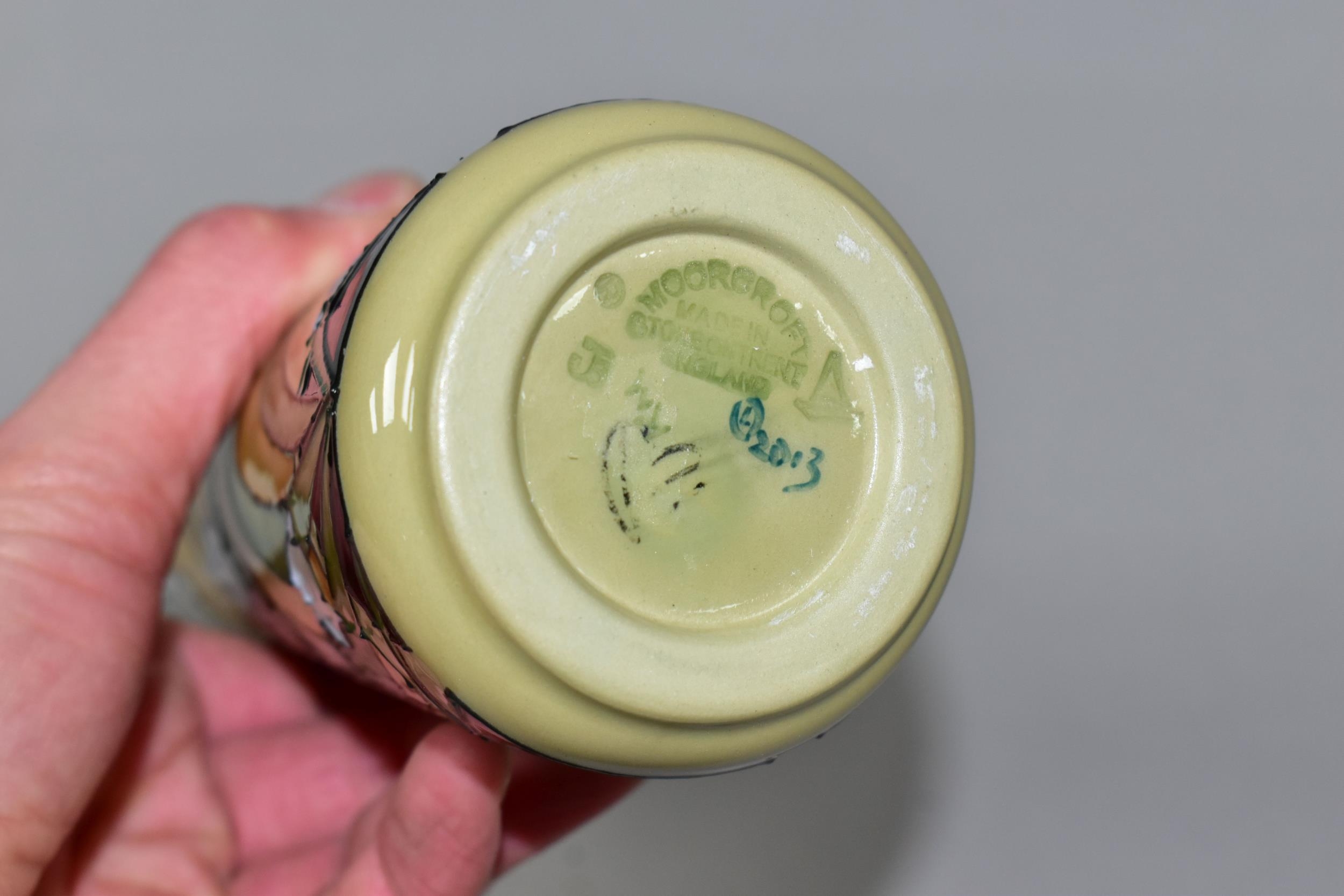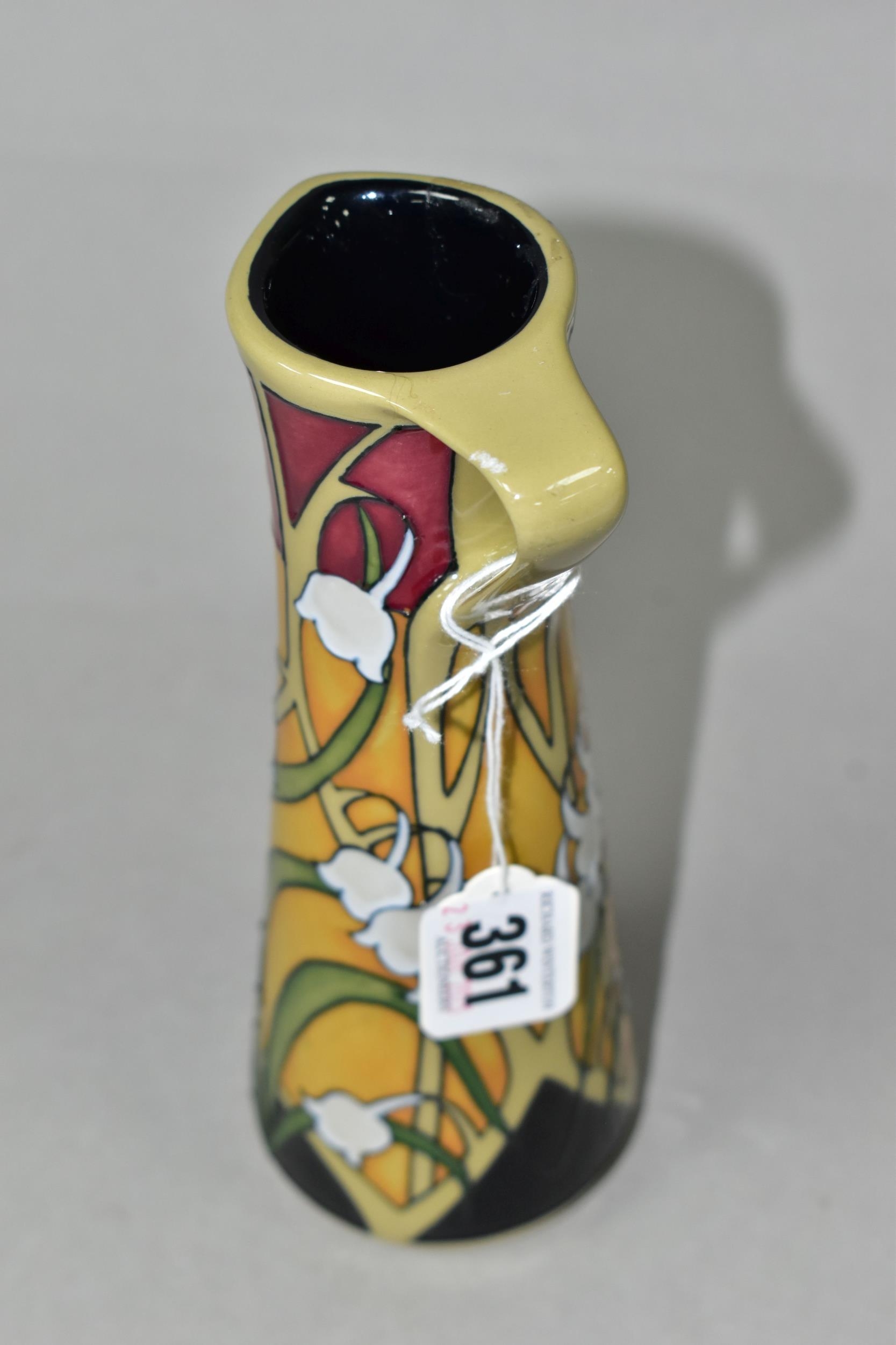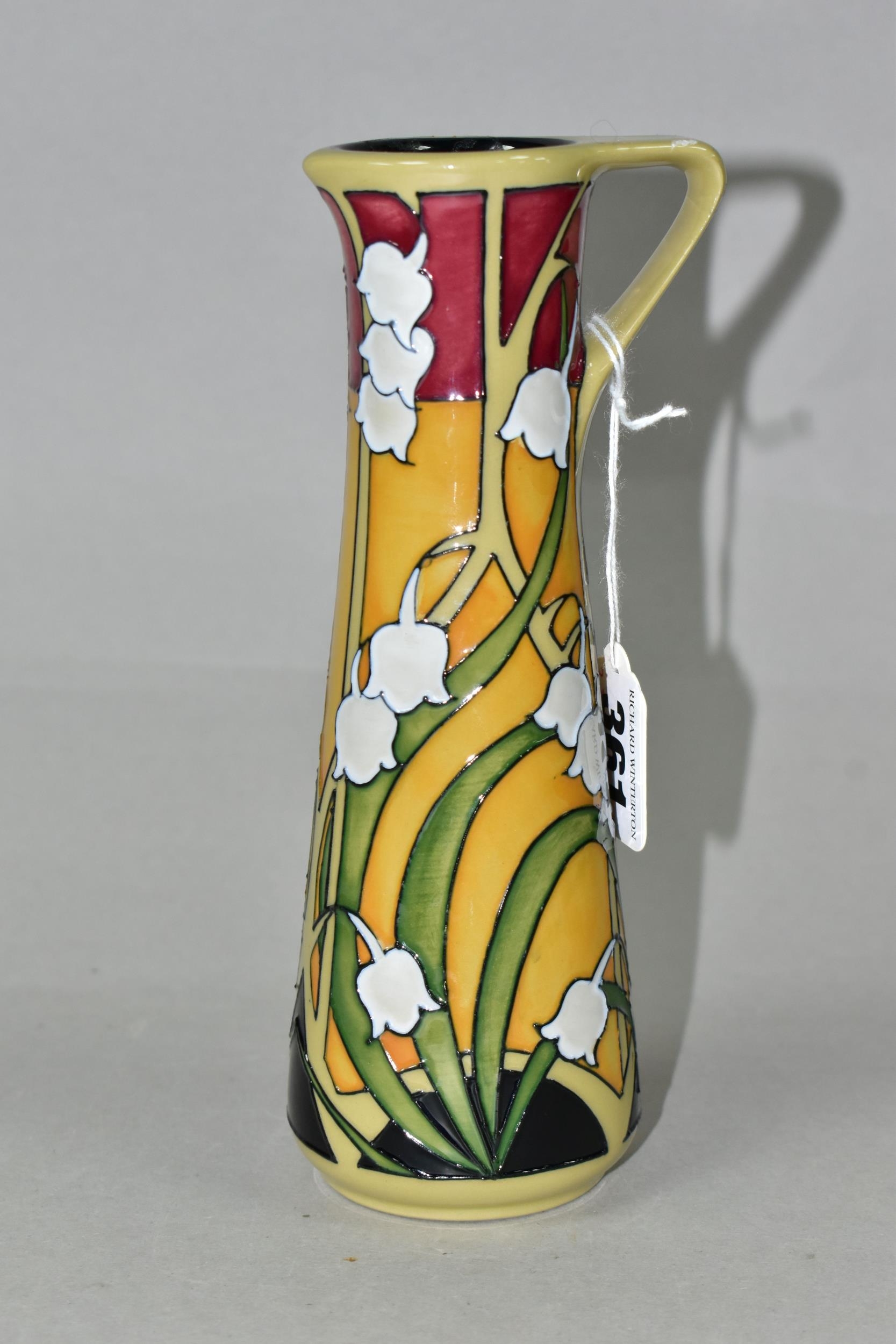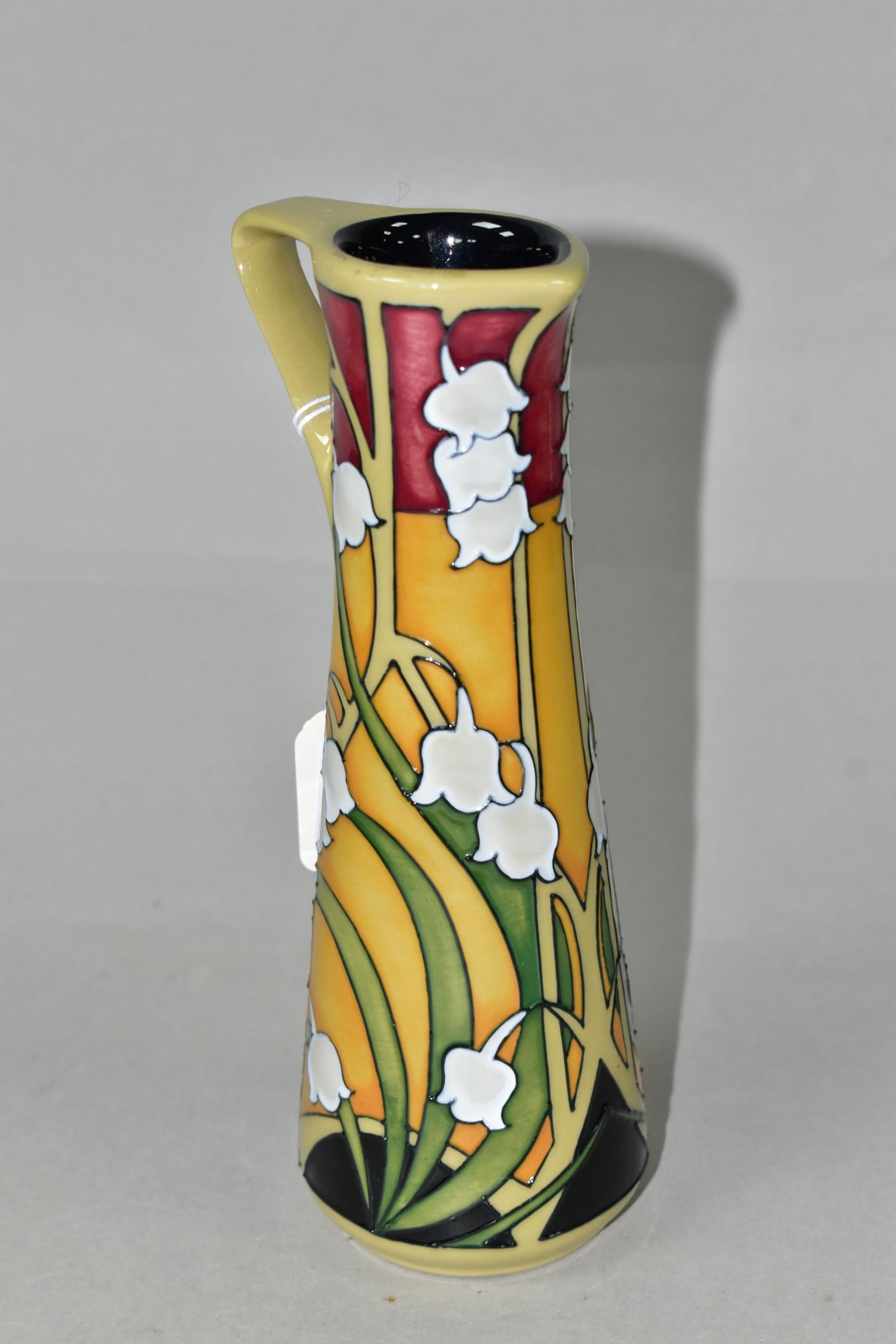 A MOORCROFT POTTERY FLEURS DECO PATTERN JUG, of angular elongated form, designed by Vicky Lovatt, decorated with stylised lily of the valley flowers on a multicoloured ground, printed, painted and impressed marks to base height 18.5cm (1) (Condition Report: appears in good condition, would benefit from a clean)