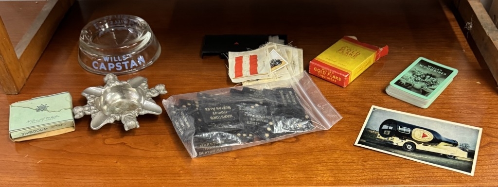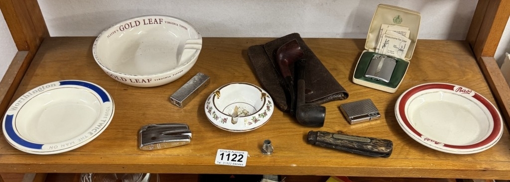 A collection of vintage smokerama including lighters, pipes breweriana, silk cigarette cards, Rose Bros Gainsborough, Lincoln imp etc