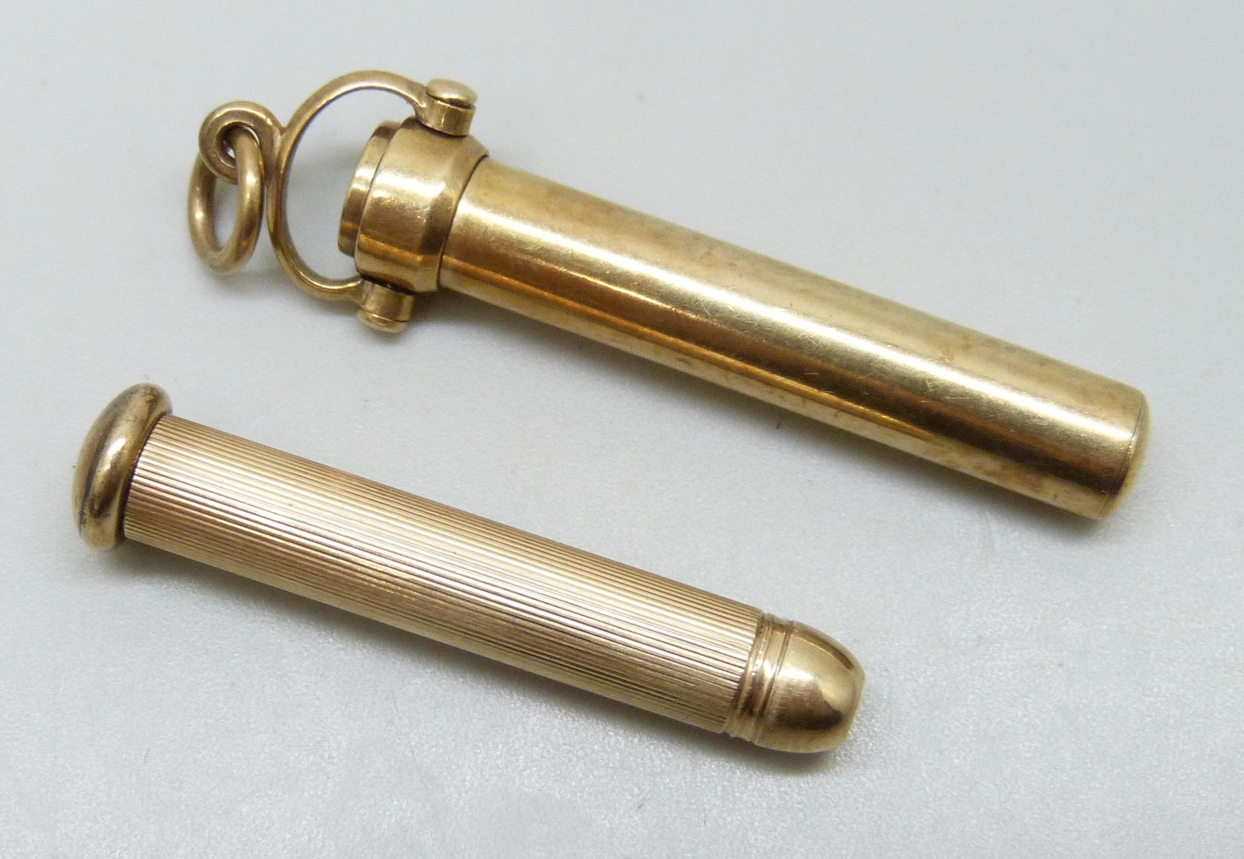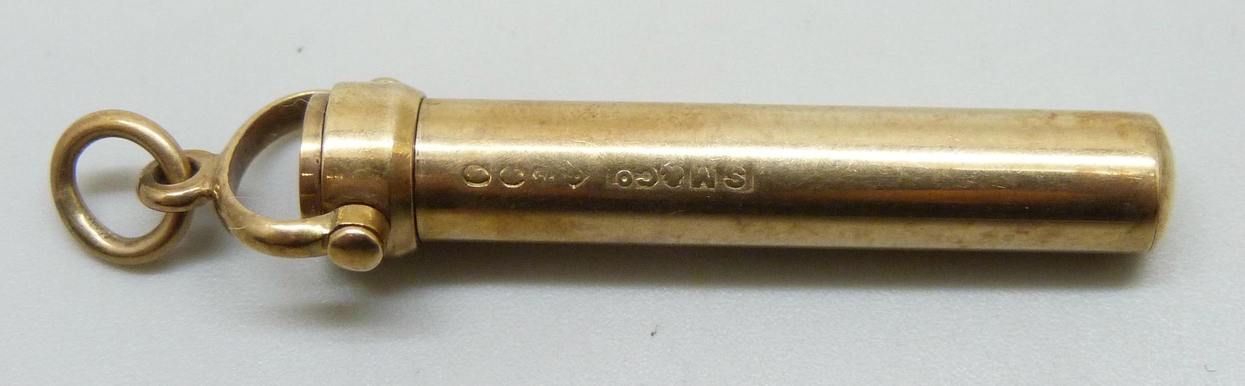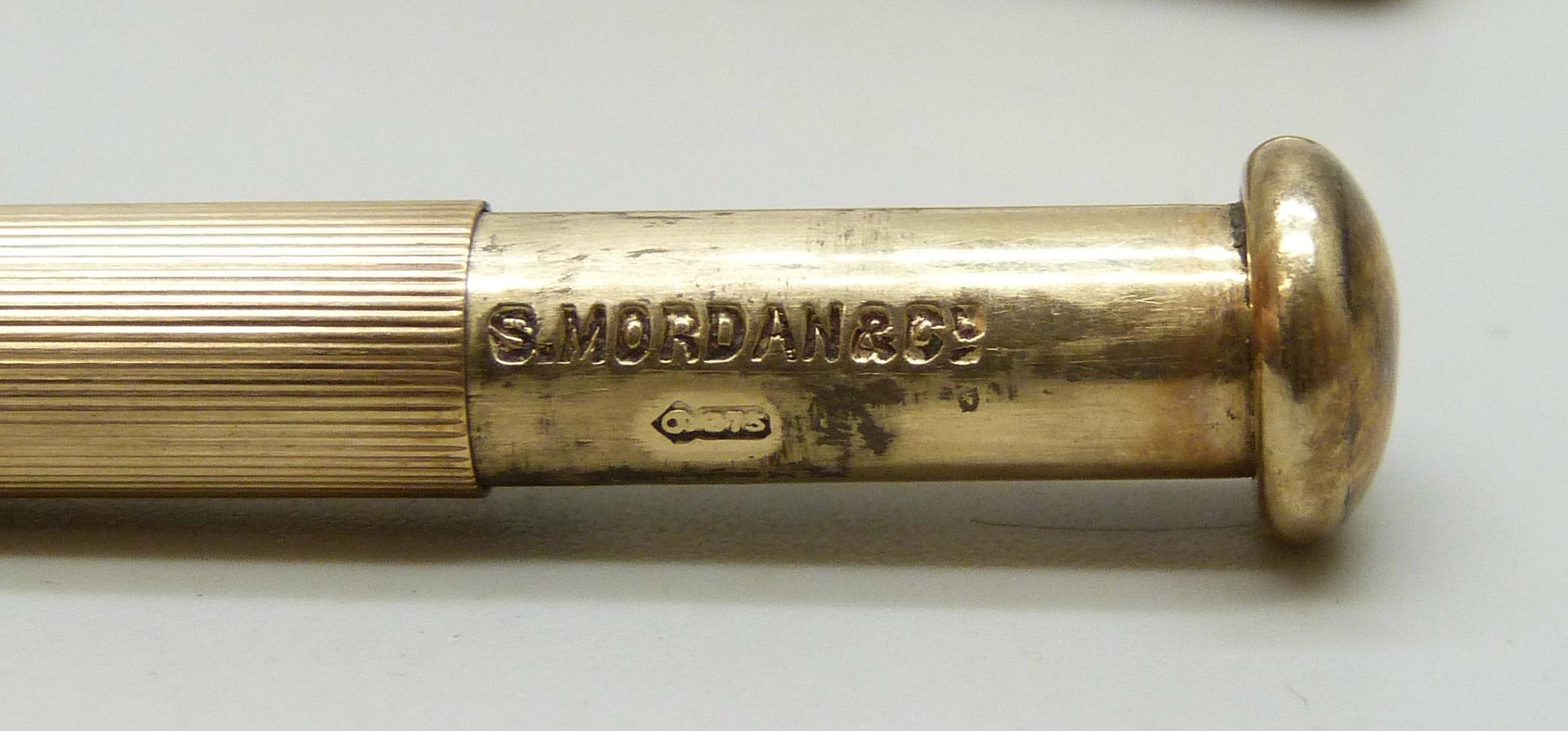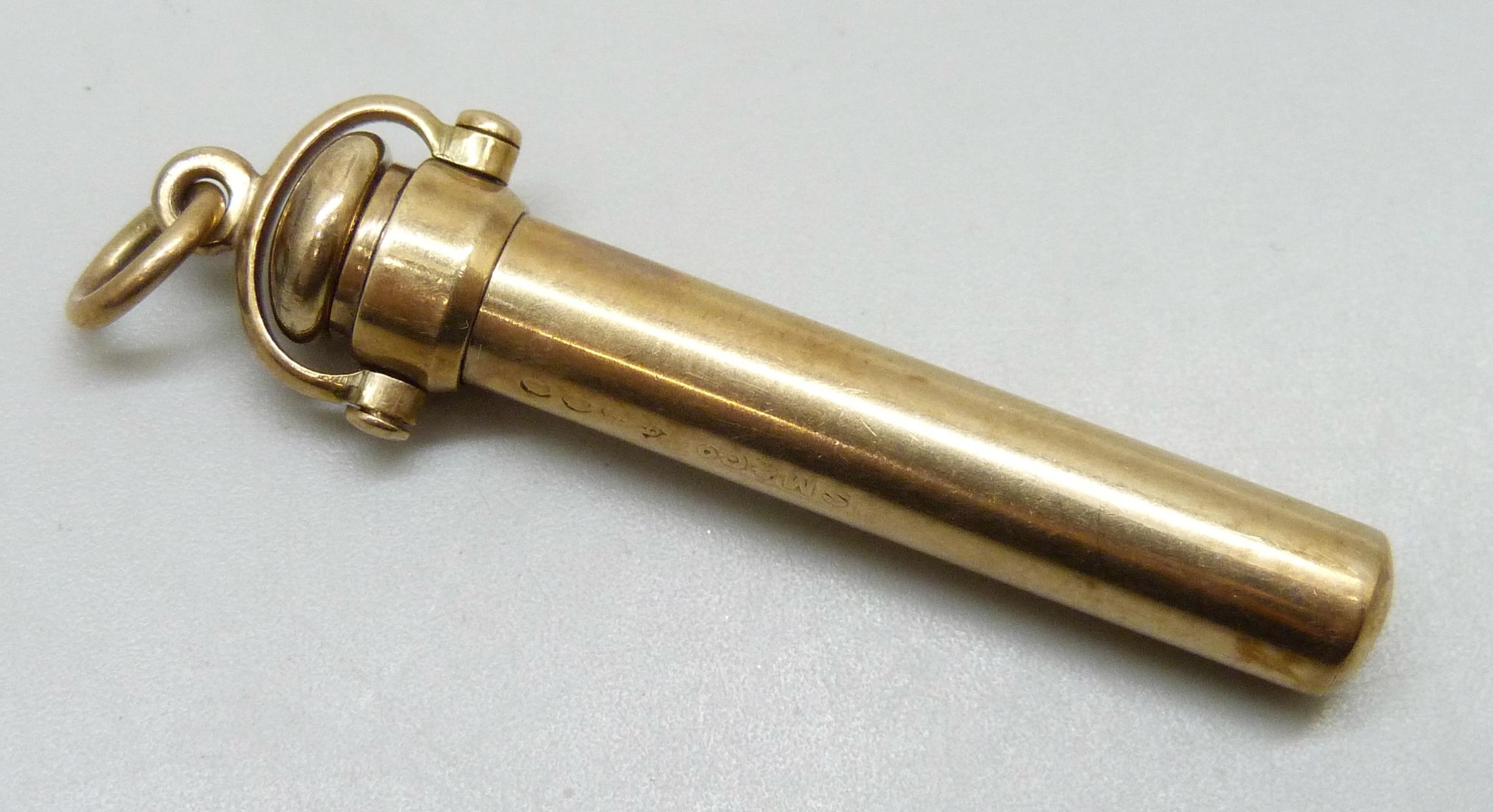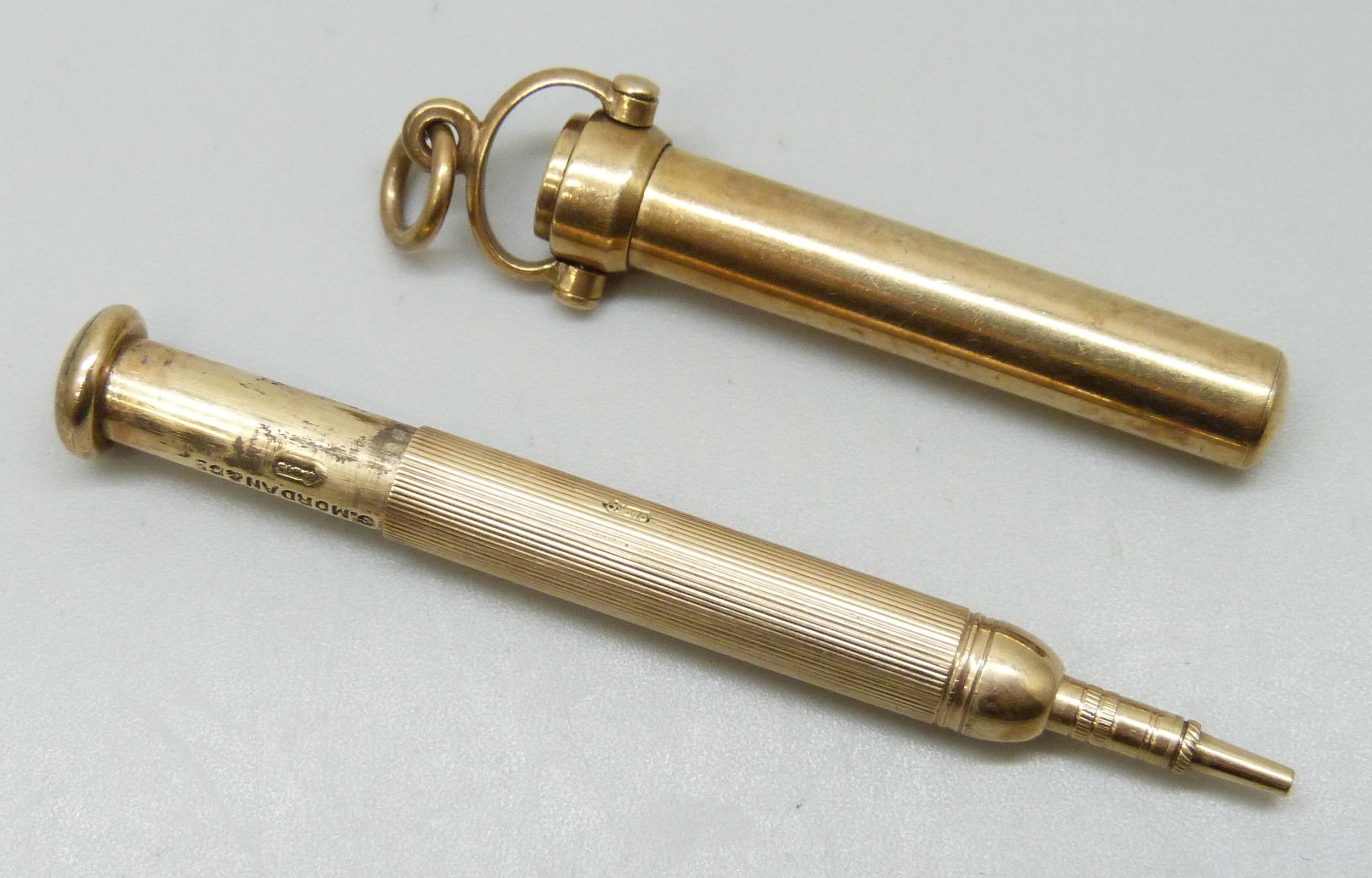 A Sampson Mordan 9ct gold pencil in a 9ct gold holder, 11g total, 5.2cm in holder including loop, 6.5cm when open