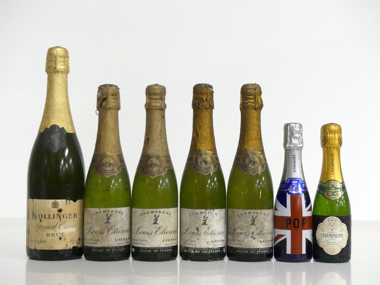 1 bt Bollinger Special Cuvée Brut NV circa 1980's sl bs, sl cdl 4 hf bts Louis Etienne Special Cuvée Extra Dry, bs, sl cdl, House of Fraser shipping label, sl foil damage 1 piccolo (20-cl) Pommery 'Pop' Extra Dry 1 piccolo (20-cl) P. Desroches & Cie Brut (Marks and Spencer) Above 7 various sized bottles