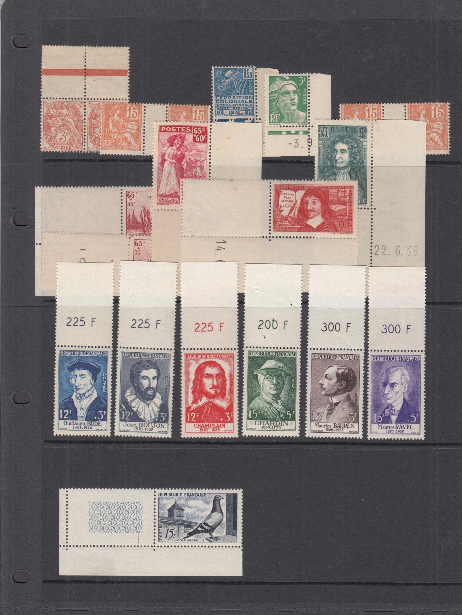 Range on Hagner and page, mostly marginal examples u/m, some with date or value in margin. Includes 1931 Colonial 1f.50, 1937 discord (corrected) and 1956 Relief Fund.