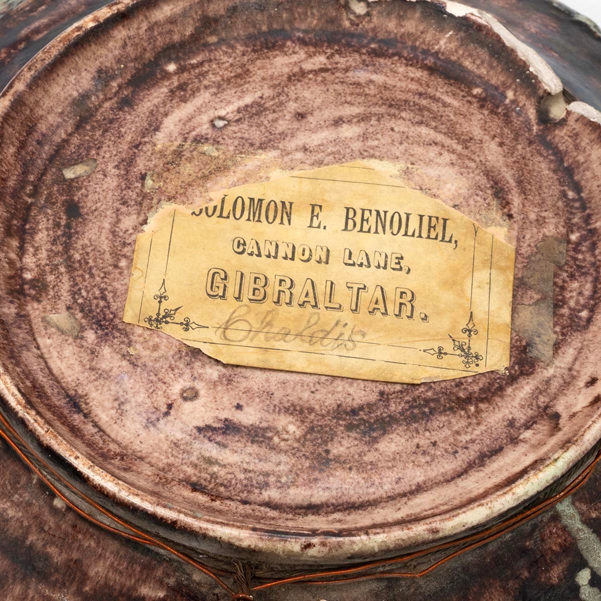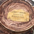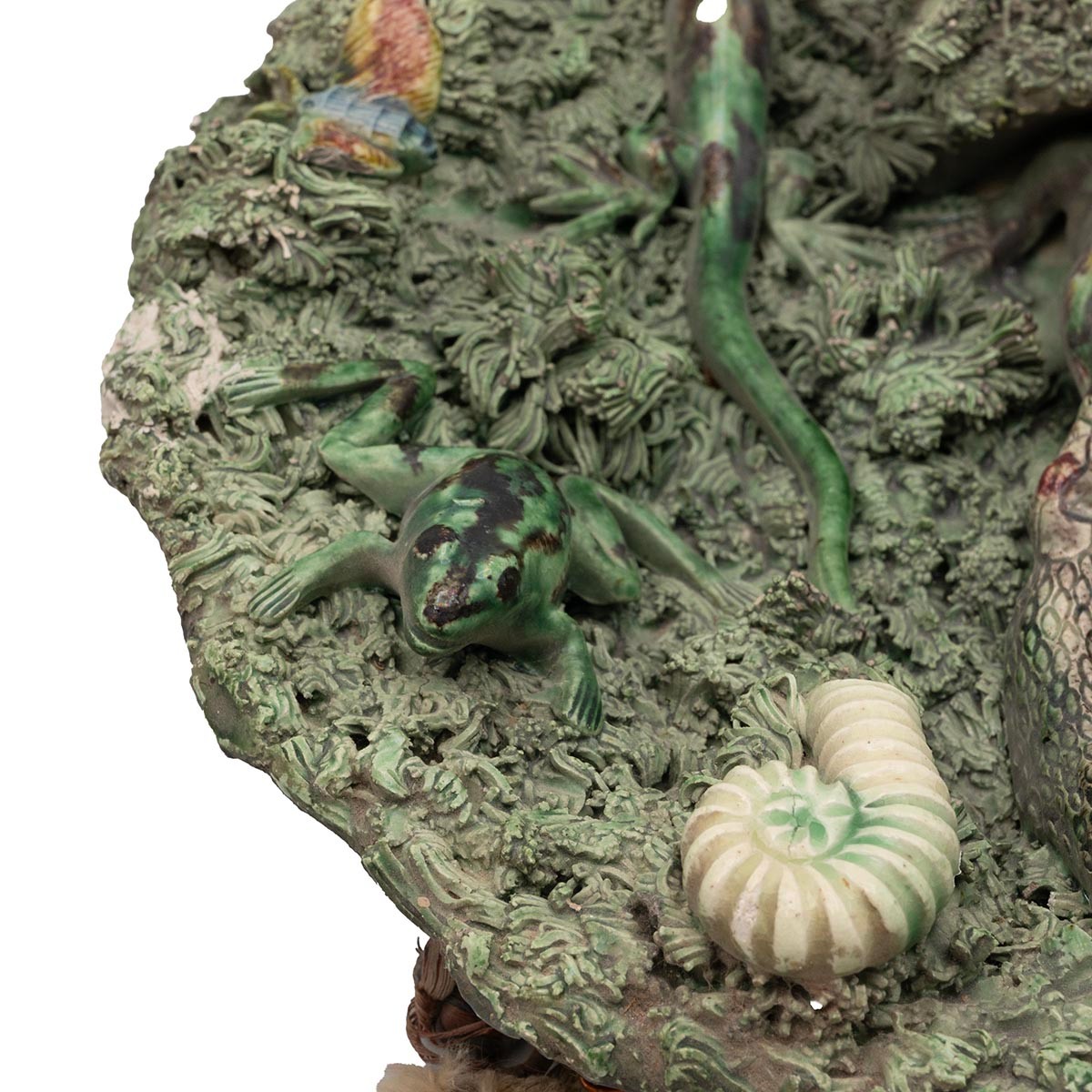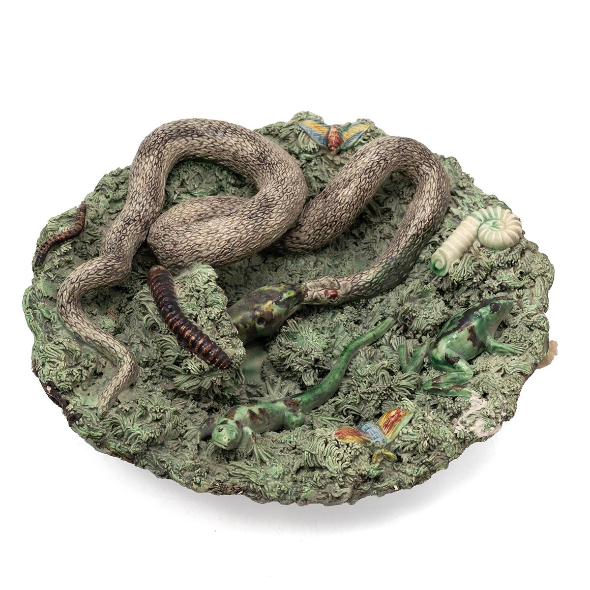 Gibraltar Majolica Palissy style plate. Naturalistic modelling with reptiles and insects on extruded clay base. 'Solomon E Benoliel, Cannon Lane, Gibraltar' label to the underside. Diameter 24cm.