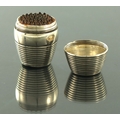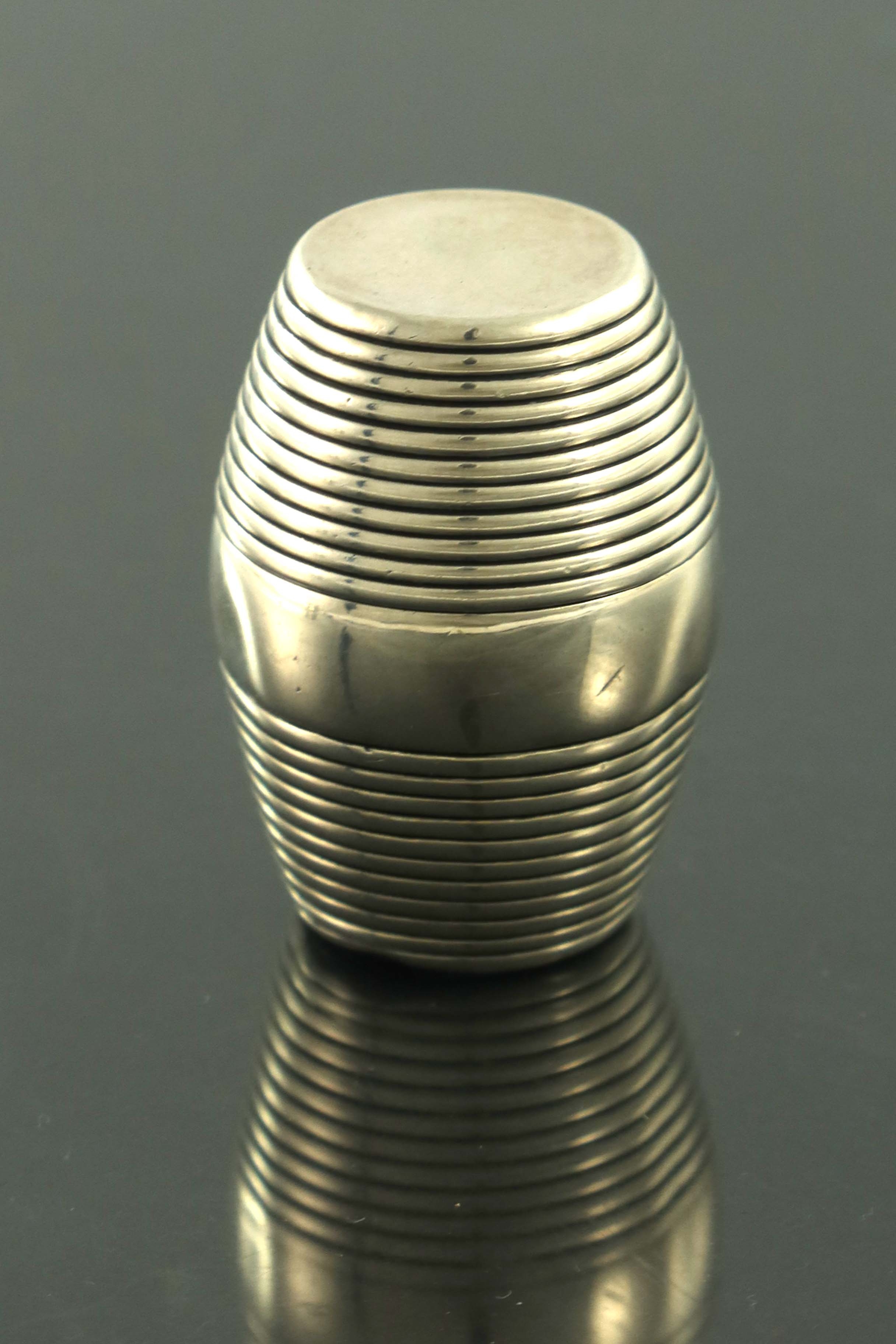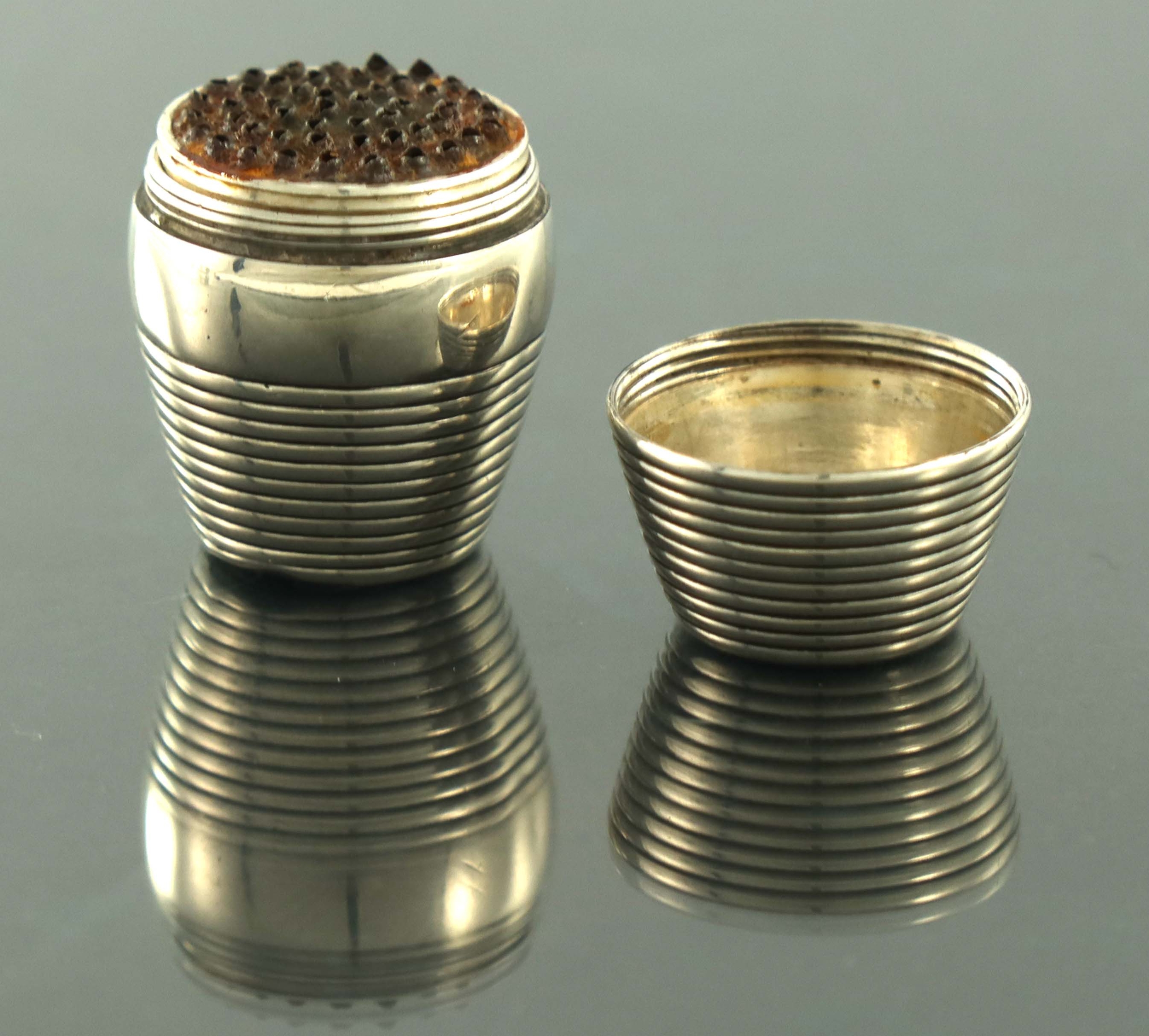 A George III silver nutmeg-grater, Samuel Meriton, London 1789, tapering barrel form, opens to reveal the metal grater, 3.7cm high, 0.6ozt
