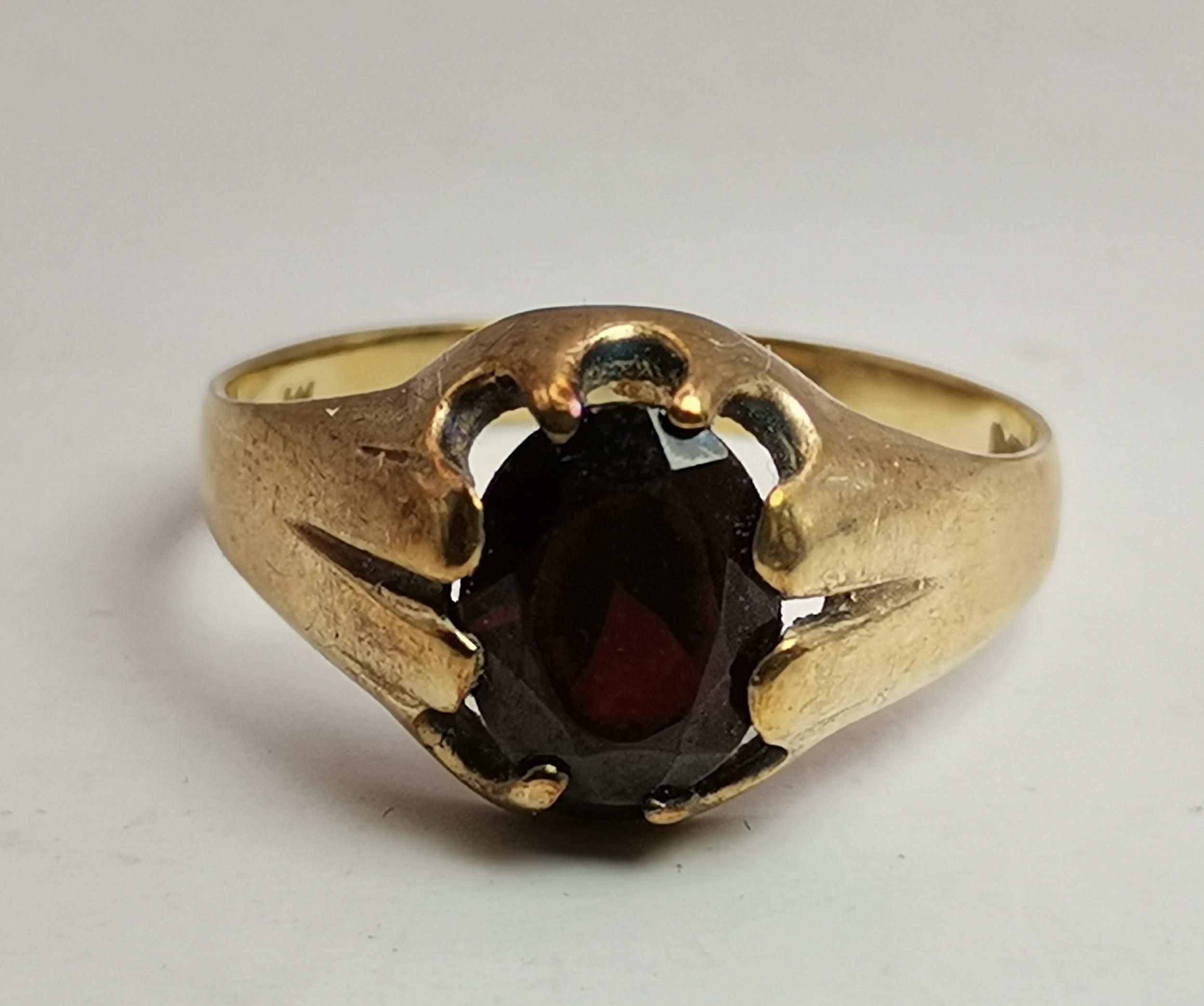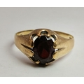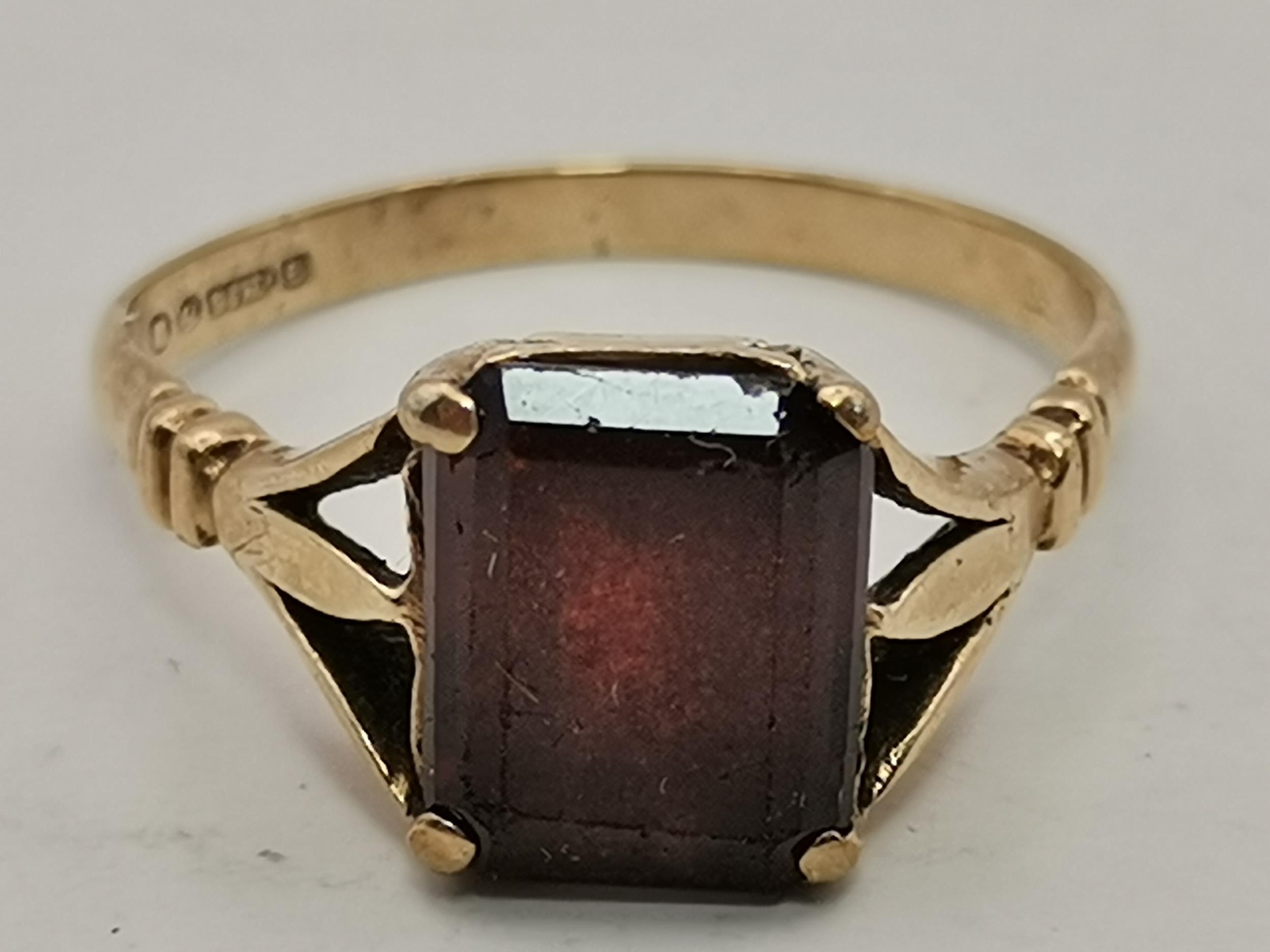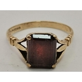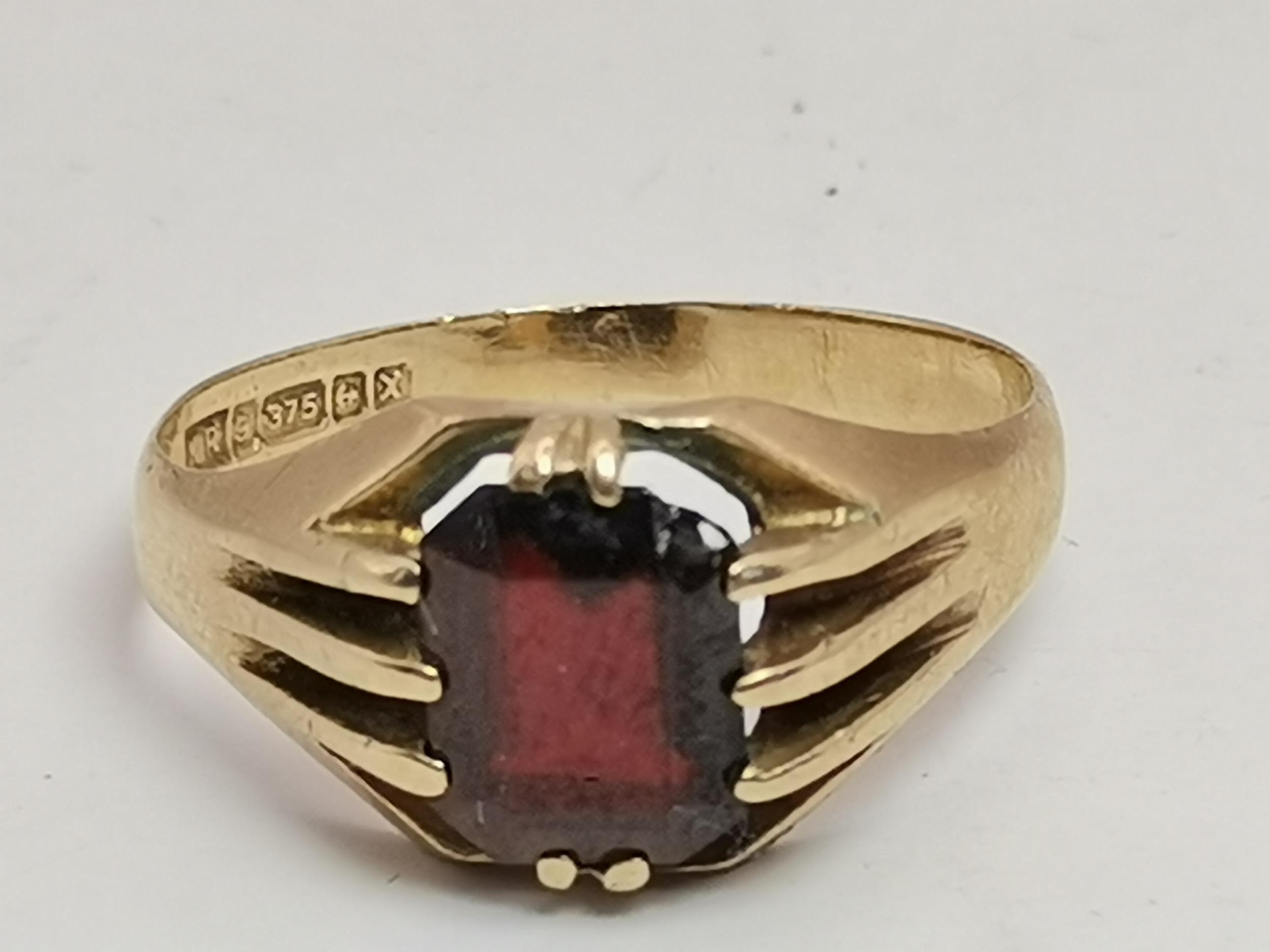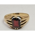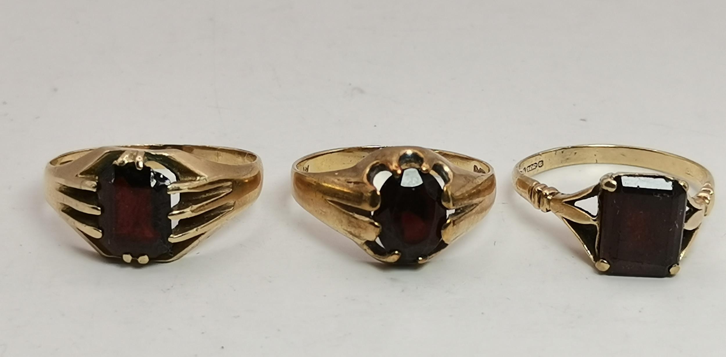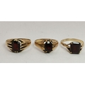 Three 9 carat gold garnet solitaire rings, each with a claw-mounted stone, two rectangular and one oval, each hallmarked 375. Ring sizes R1/2 (x2) and T, 9.5g gross