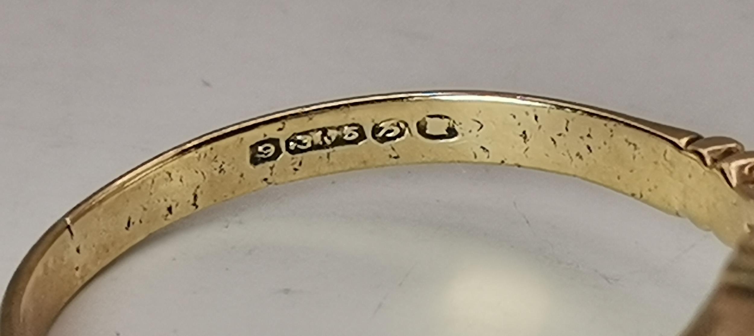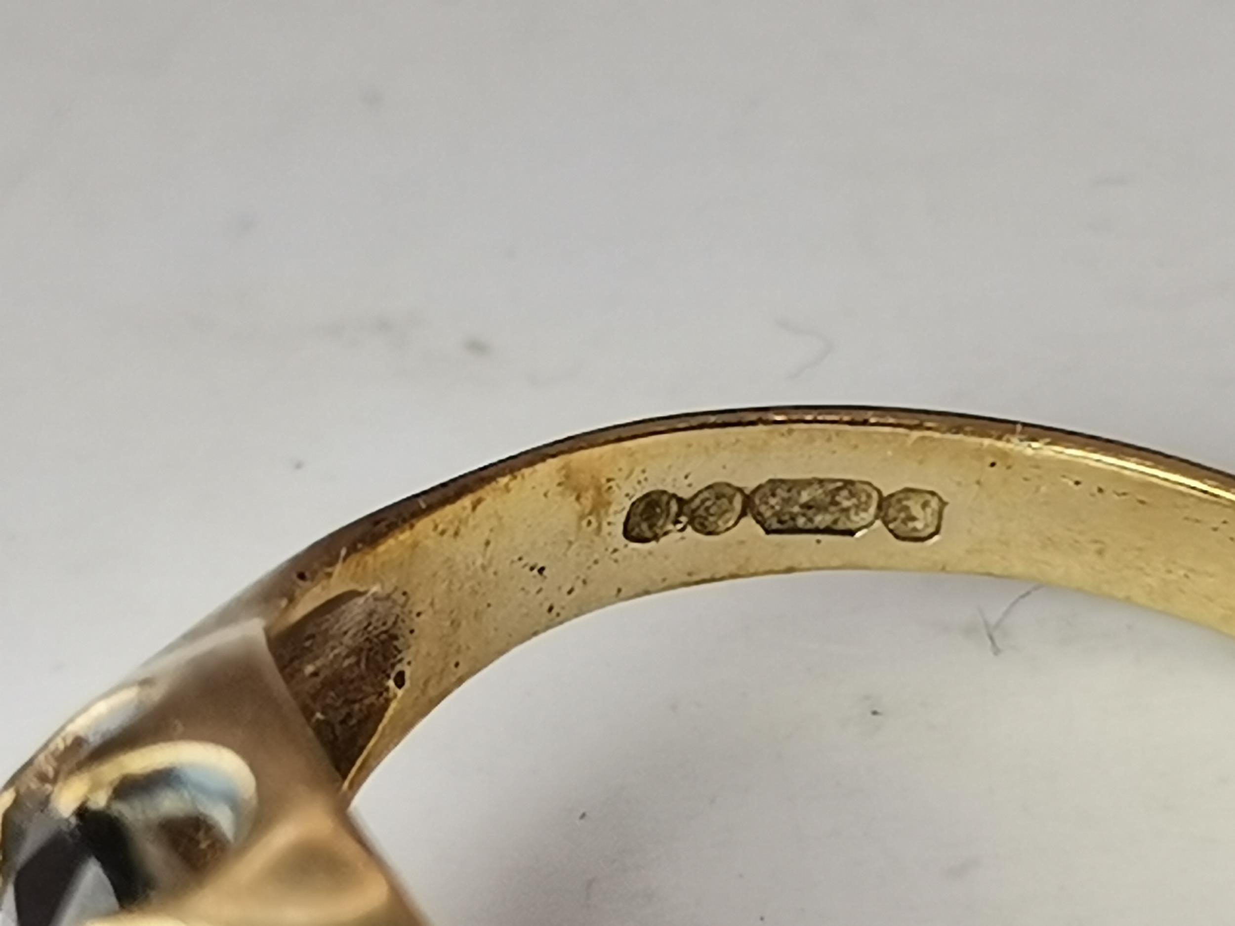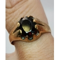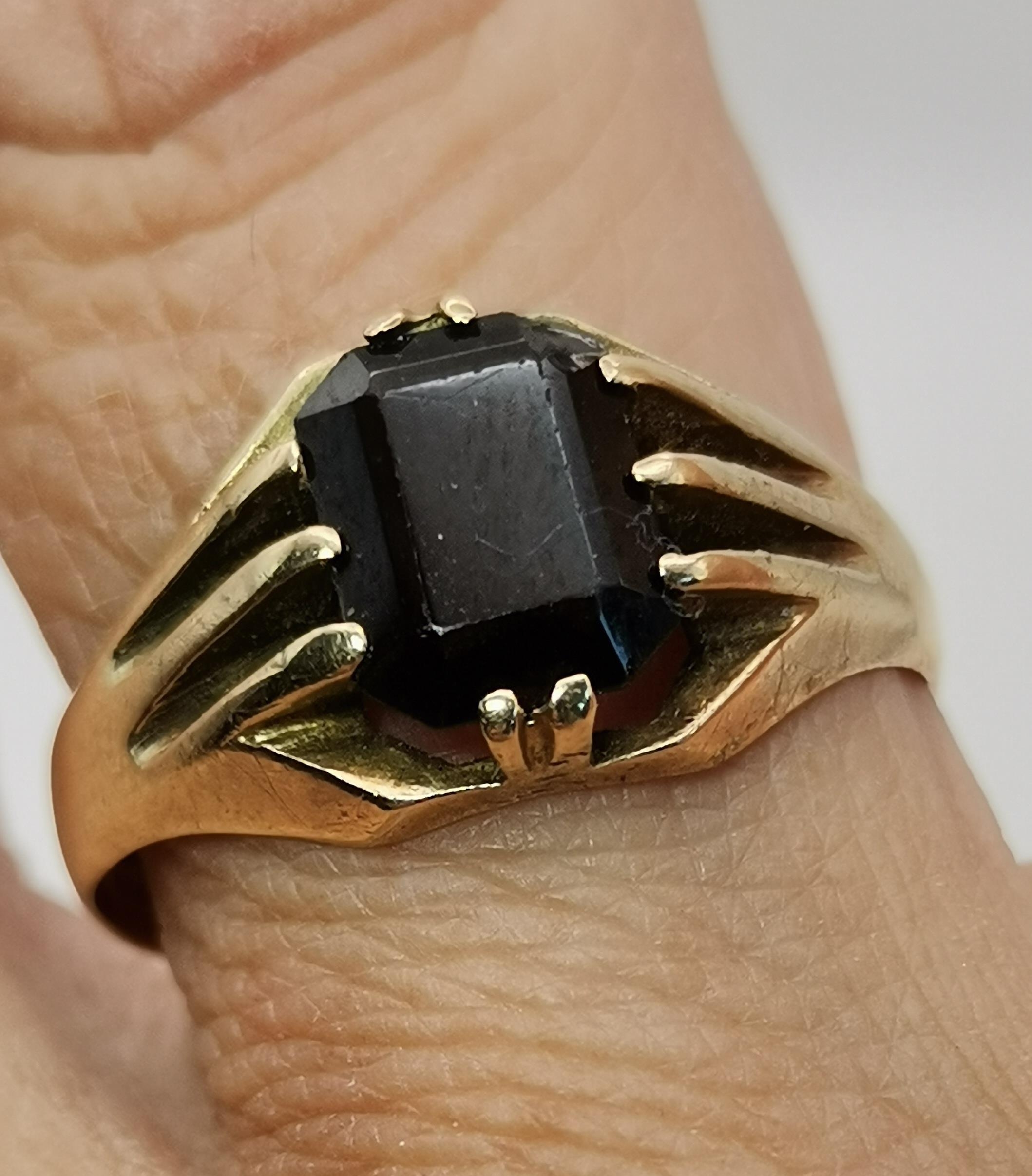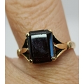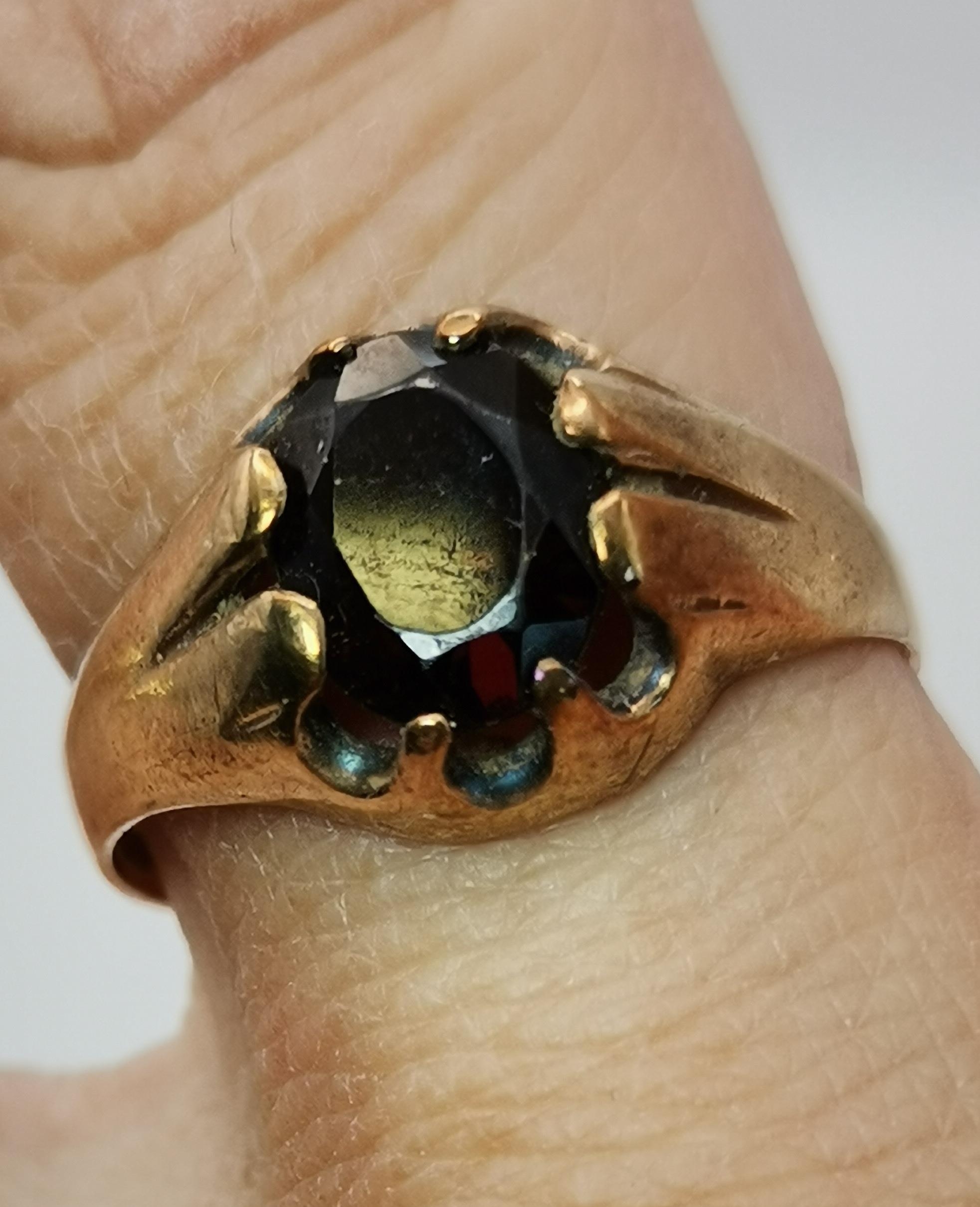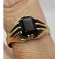 Three 9 carat gold garnet solitaire rings, each with a claw-mounted stone, two rectangular and one oval, each hallmarked 375. Ring sizes R1/2 (x2) and T, 9.5g gross