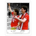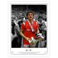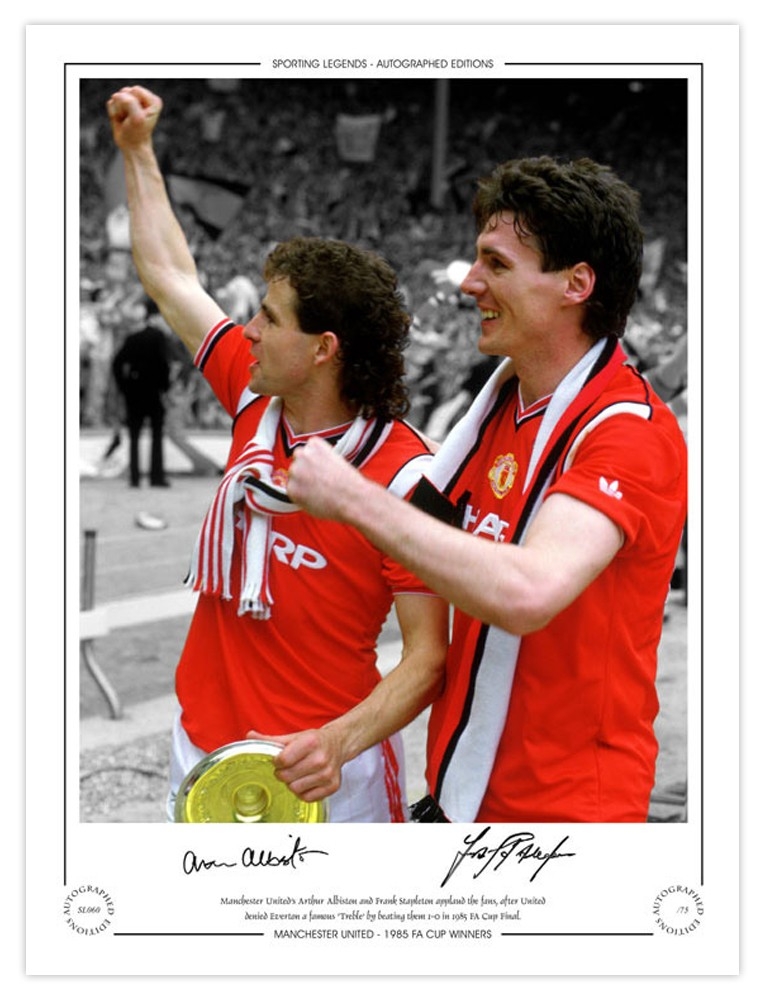 Autographed MAN UNITED 1985 Limited-Edition : A superbly produced Limited Edition print measuring 16 x 12, depicting FRANK STAPLETON and ARTHUR ALBISTON celebrating in front of supporters during a lap of honour following Manchester United's 1-0 victory over Everton in the 1985 FA Cup Final at Wembley, limited to just 75 editions it has been signed to the lower border in fine black marker.