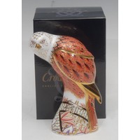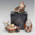 A Royal Crown Derby paperweight, Reindeer, with red nose, gold stopper, 13.5cm long, printed mark in red, boxed; others, Father Christmas in Sledge, gold stopper, 10.5cm long, printed mark in red; Santa Claus, silver stopper, 10cm, signed by John Ablitt in gold (3)