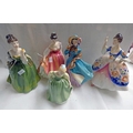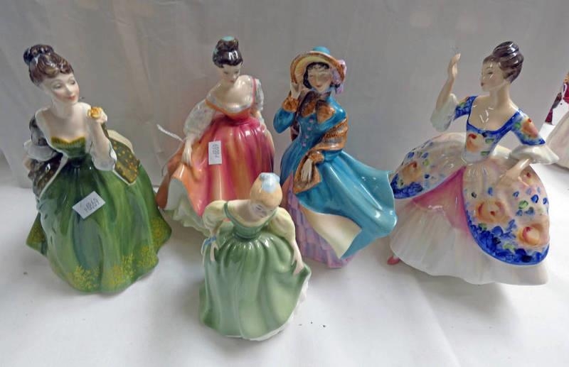 FIVE ROYAL DOULTON PORCELAIN FIGURES INCLUDING HN2835 - FAIR LADY (CORAL PINK) HN 268 - FLEUR, HN2136 - DELPHINE AND OTHERS.
