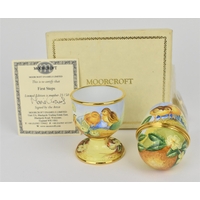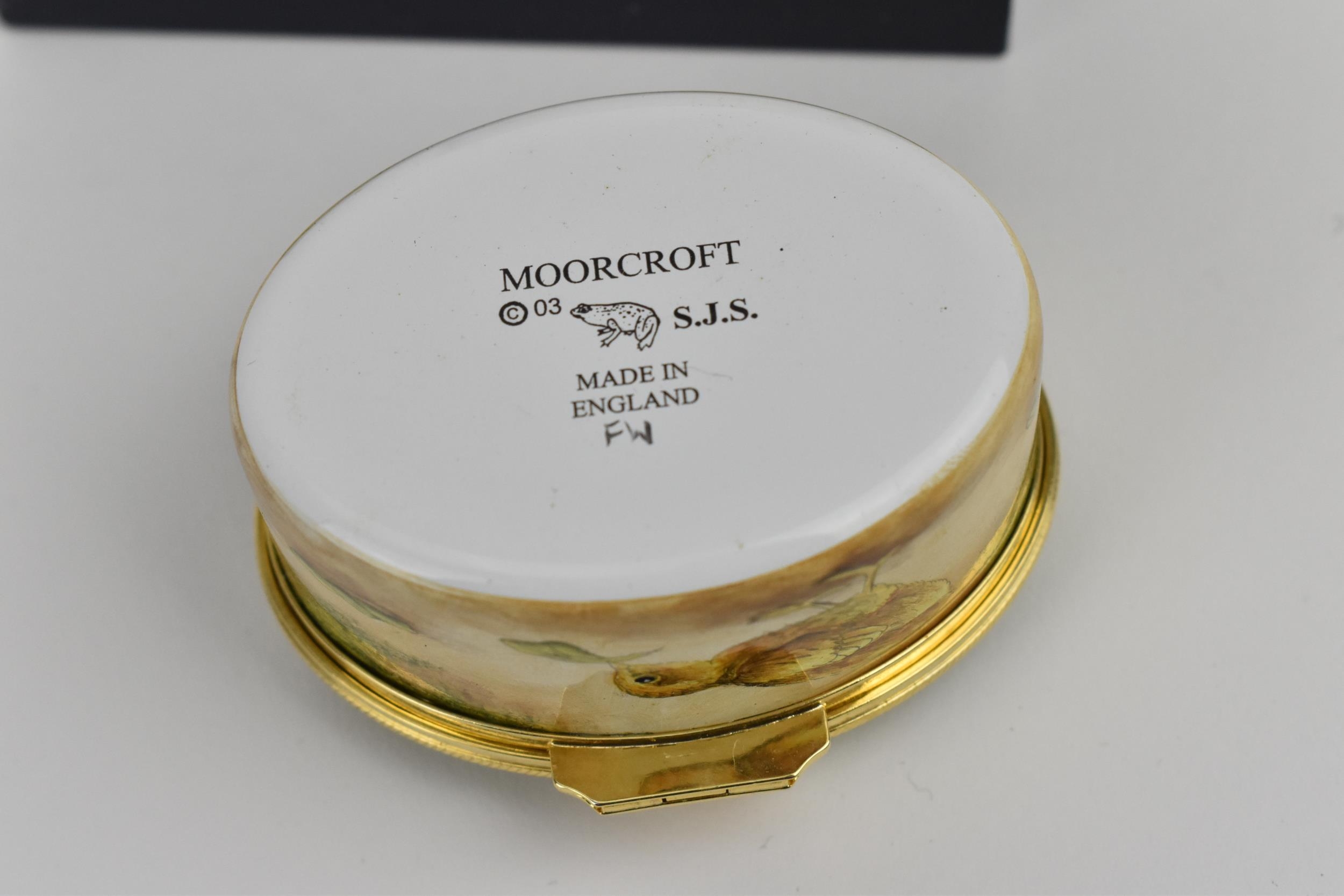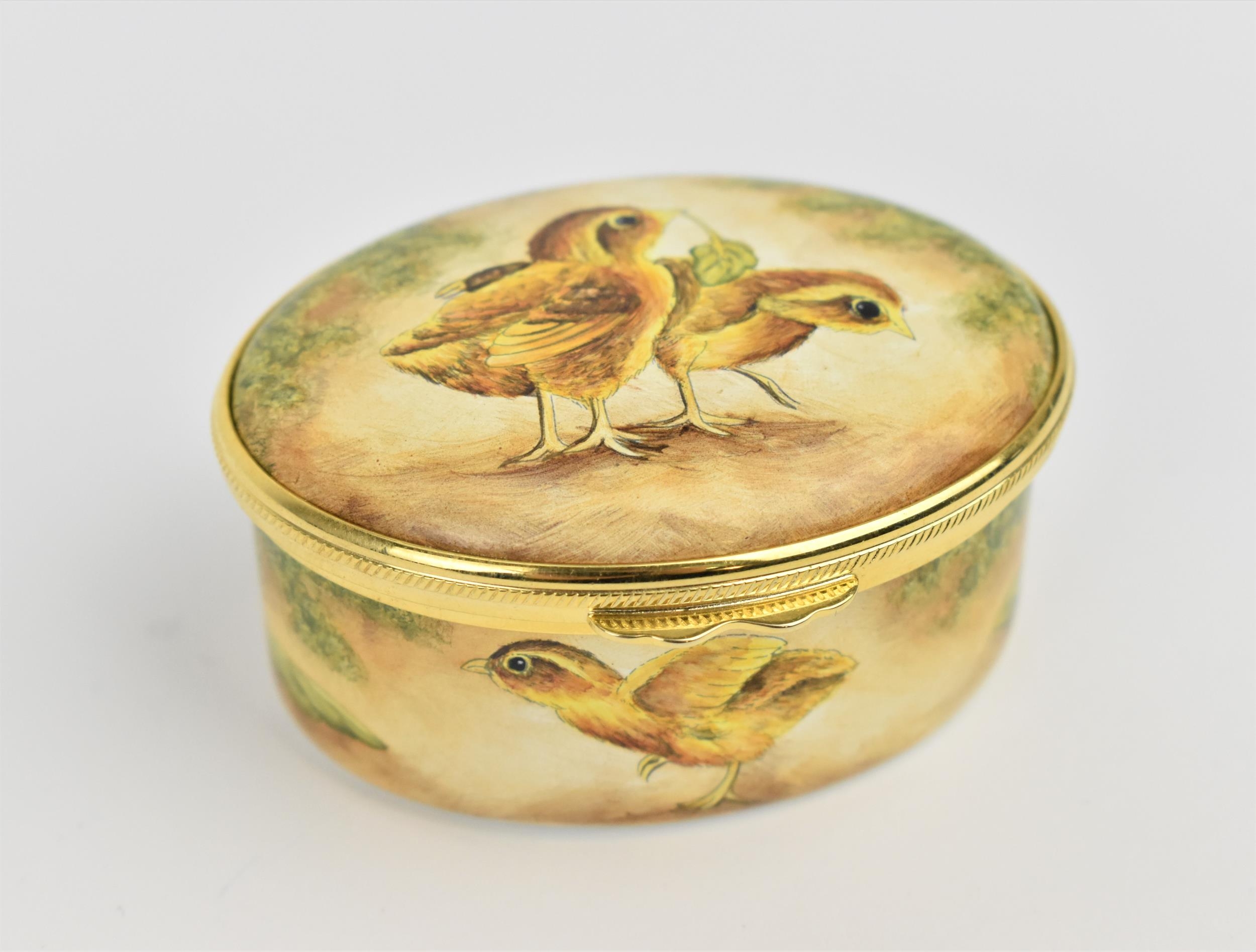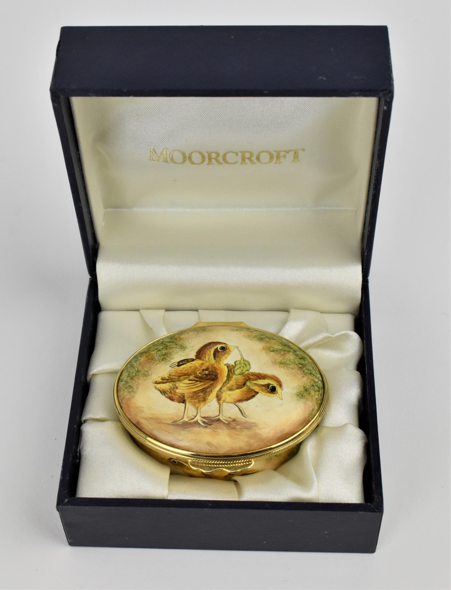 A Moorcroft Enamels Ltd box with hinged cover, by Stephen Smith, painted by Faye Williams depicting chicks, within original fitted box, 6.5 cm wide