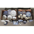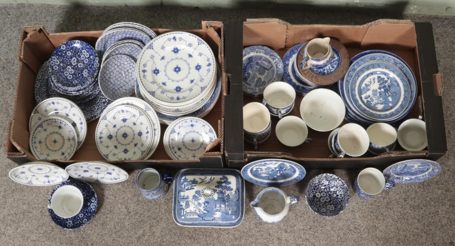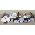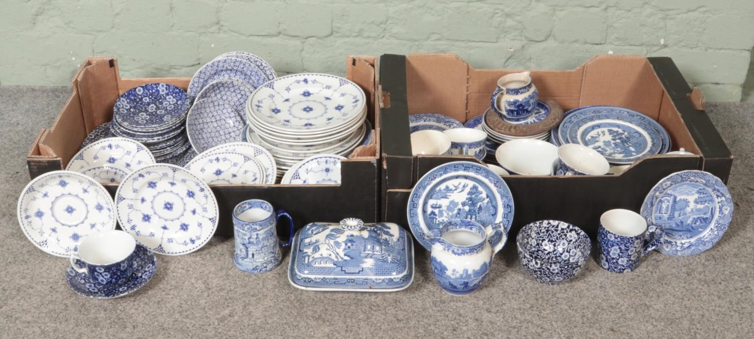Two boxes of blue and white ceramics, to include examples from Wedgwood, Spode Italian, Old Willow and Masons Denmark