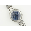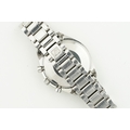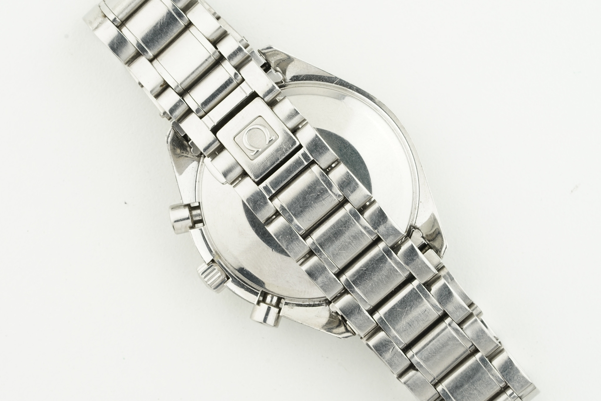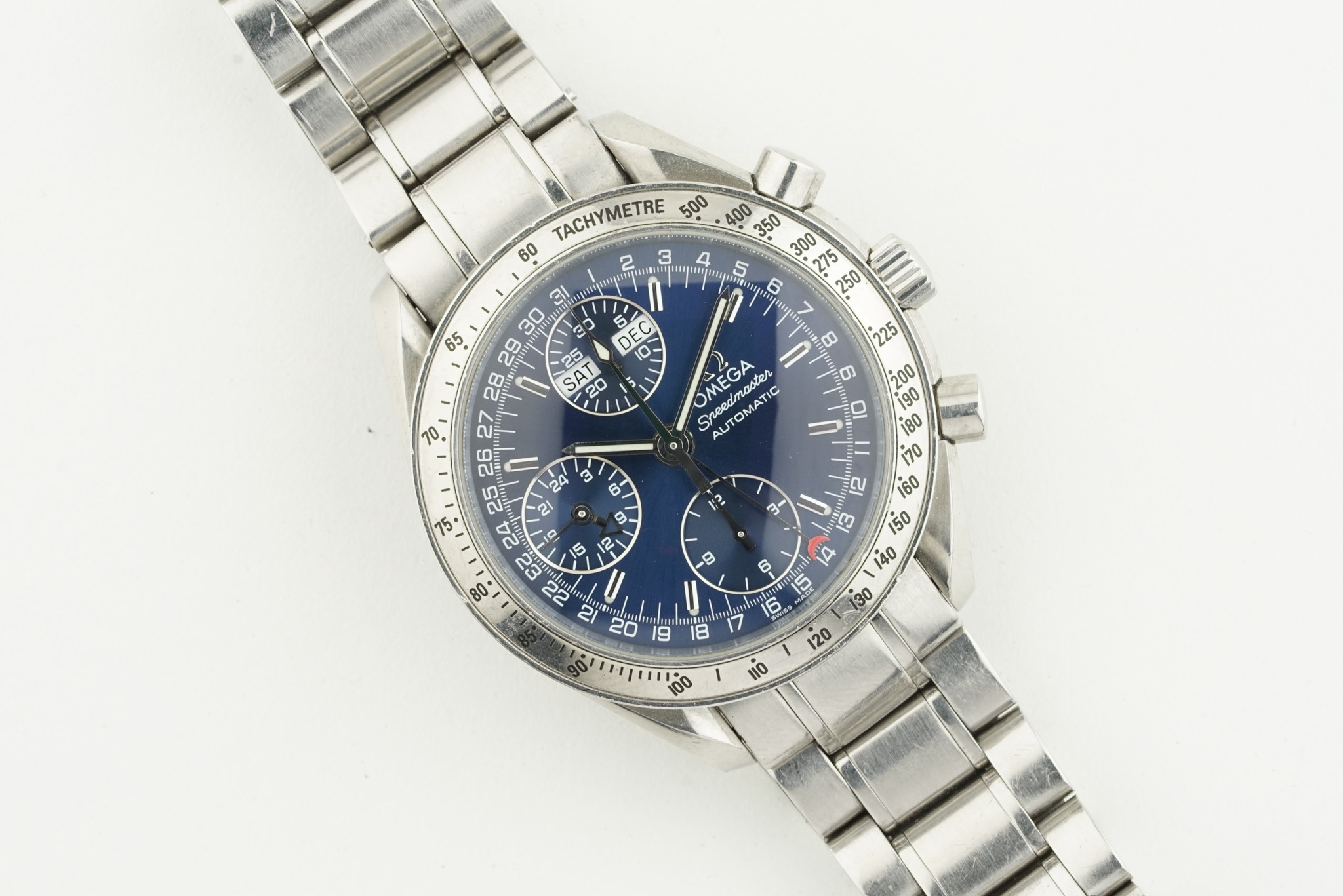 OMEGA SPEEDMASTER DAY DATE CALENDAR AUTOMATIC CHRONOGRAPH REF. 35218000, circular blue dial with stick hour markers and hands, 39mm stainless steel case with a crown and case back, inside is an automatic movement, on a s/s omega bracelet, watch is currently running.