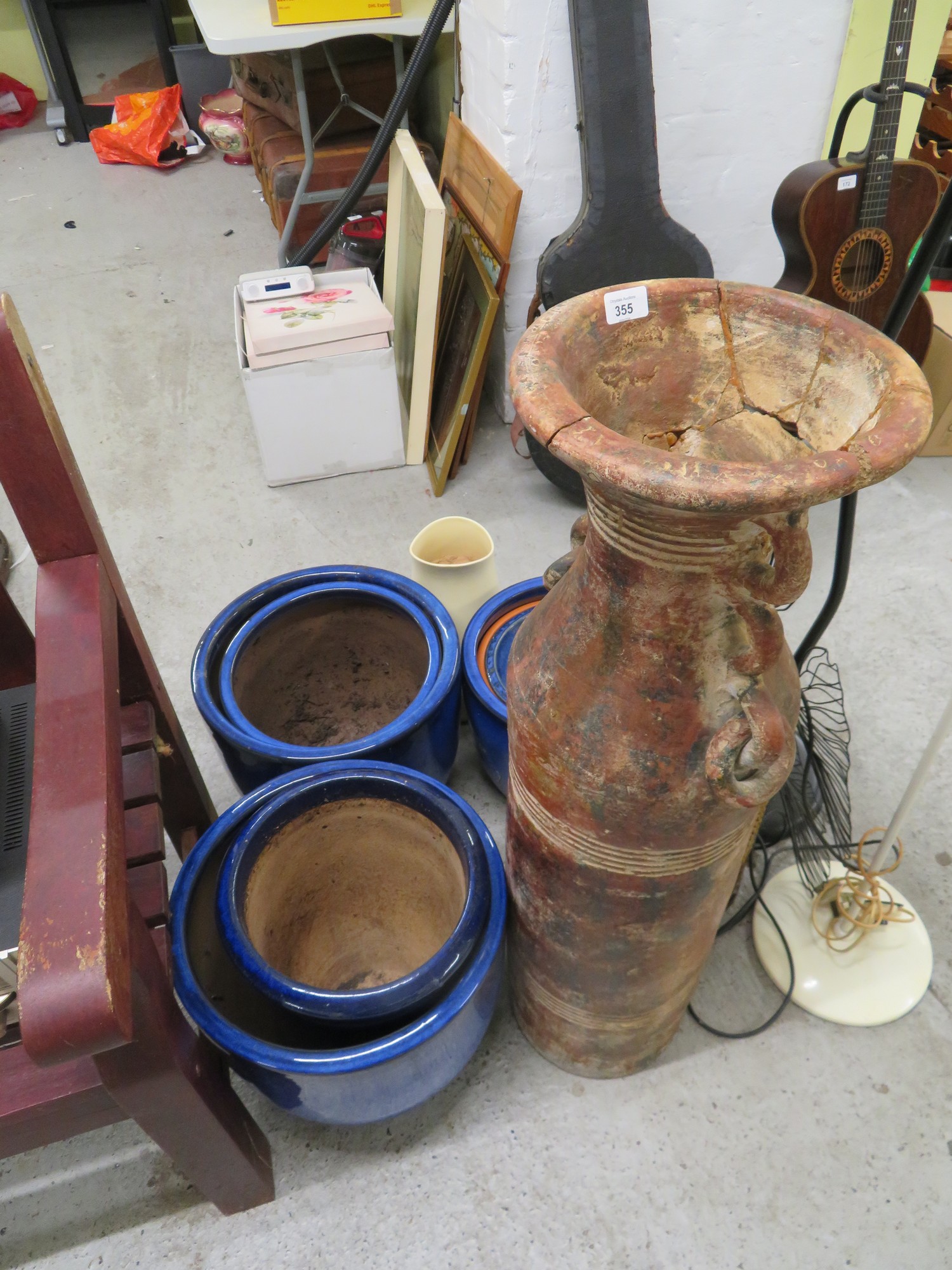 Collection of mostly blue ceramic garden pots, plus a tall terracotta pot
