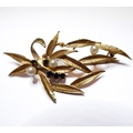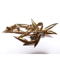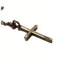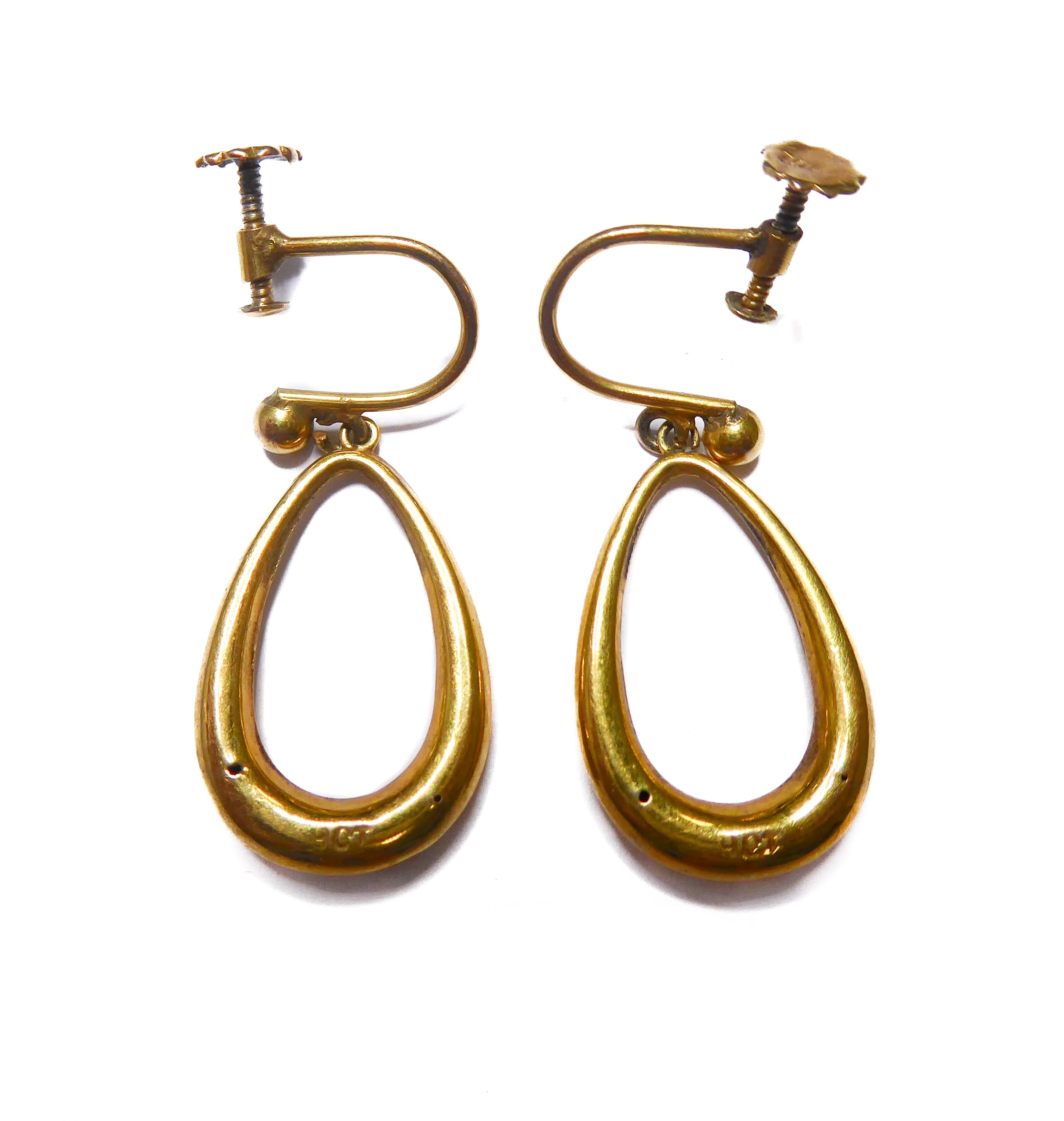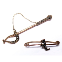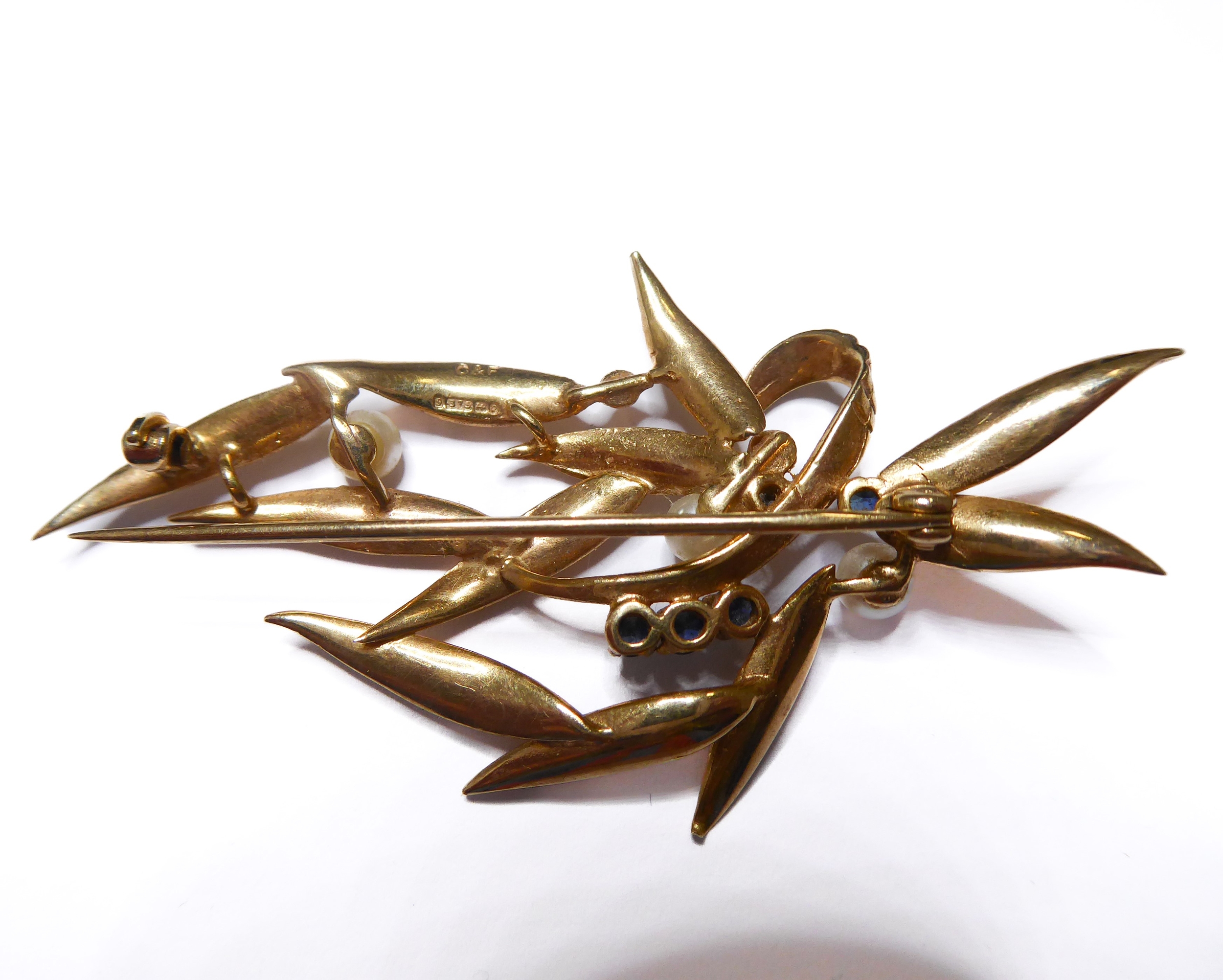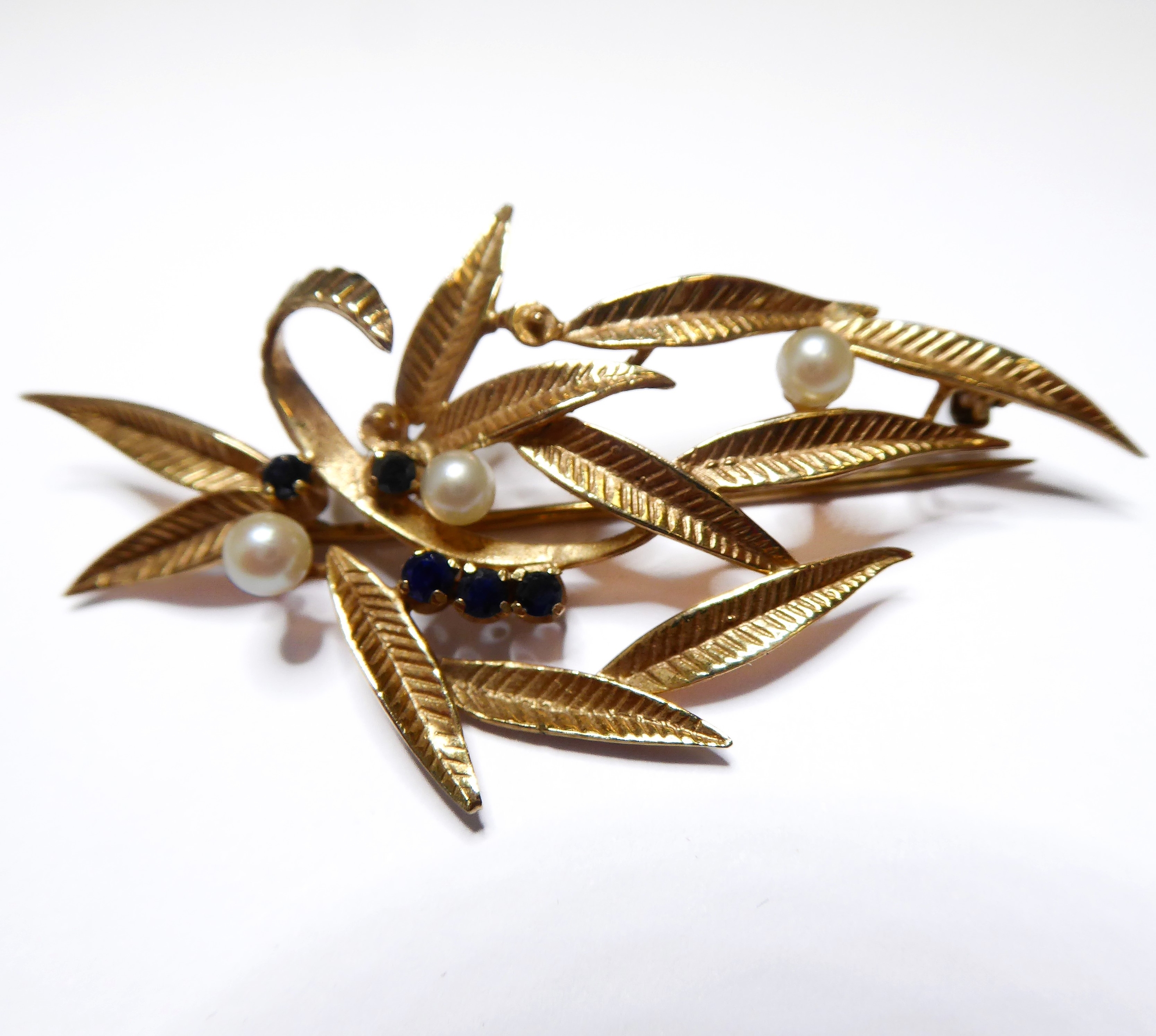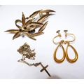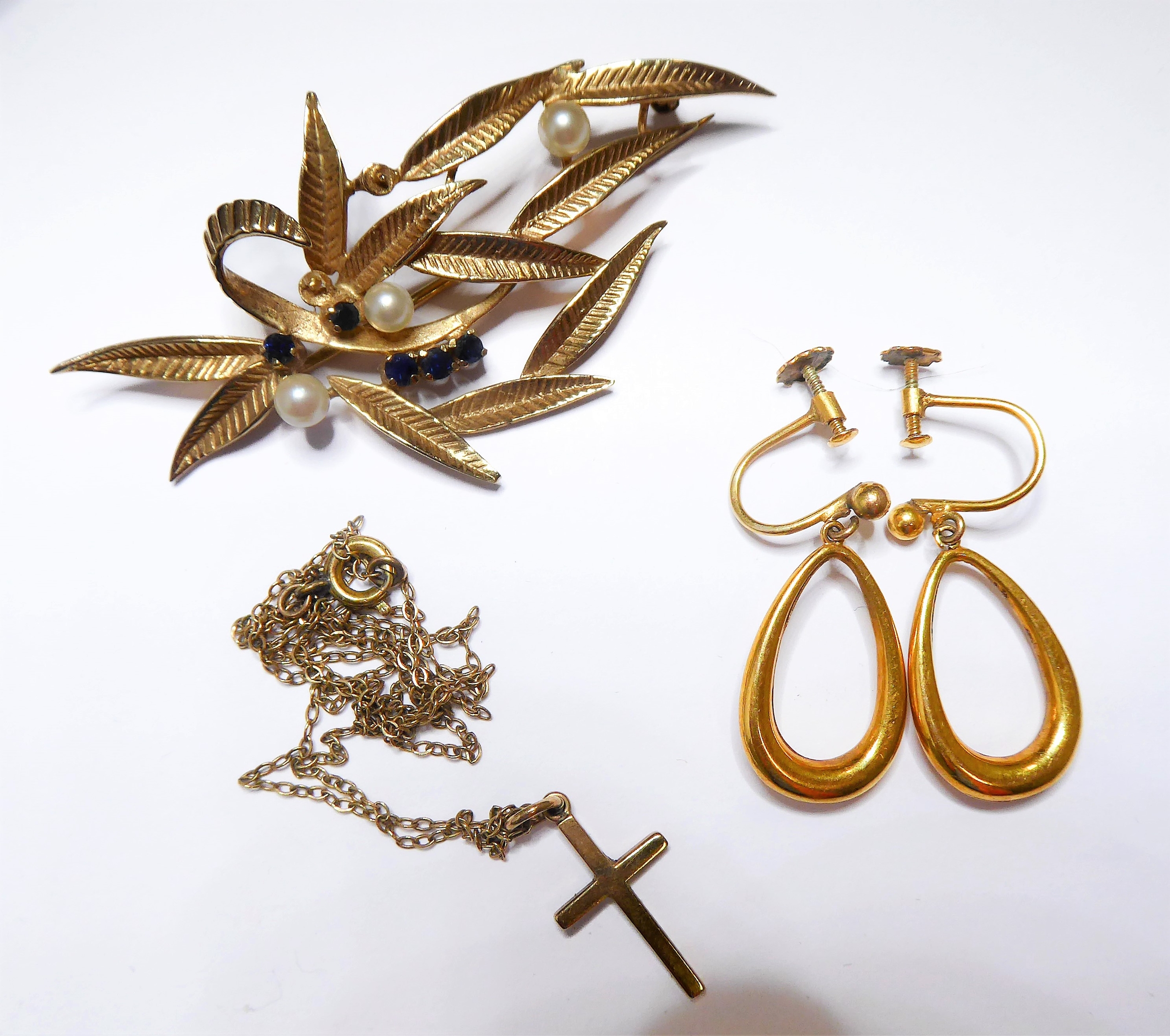 A 9-carat yellow gold, cultured pearl and sapphire foliate spray brooch (two cultured pearls deficient) (5.1g), together with a 9-carat yellow gold Latin cross pendant, 0.5g suspended from a fine trace link necklace; a pair of 9-carat yellow gold tapering oval hoop ear pendants (combined gross weight 1.6g) (3)