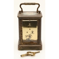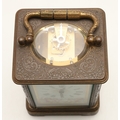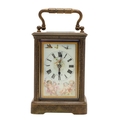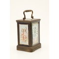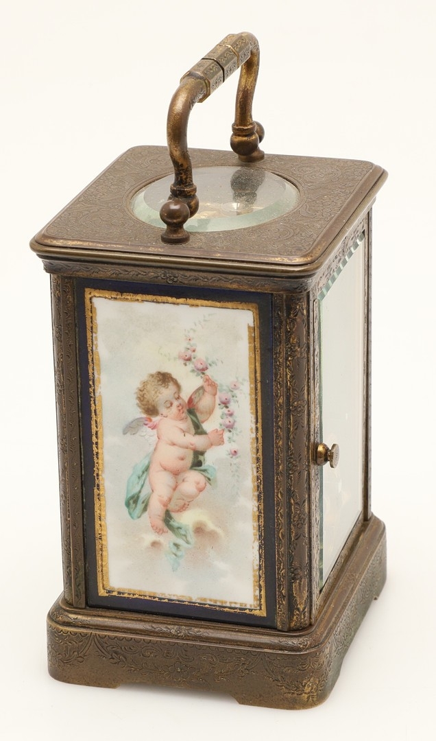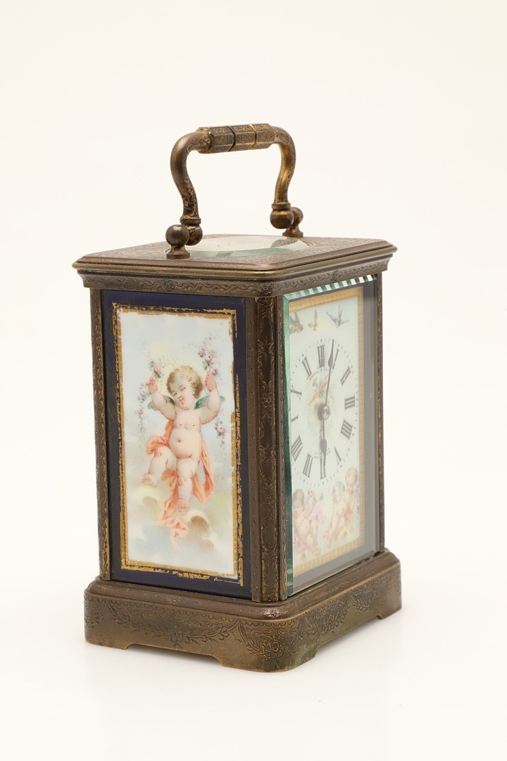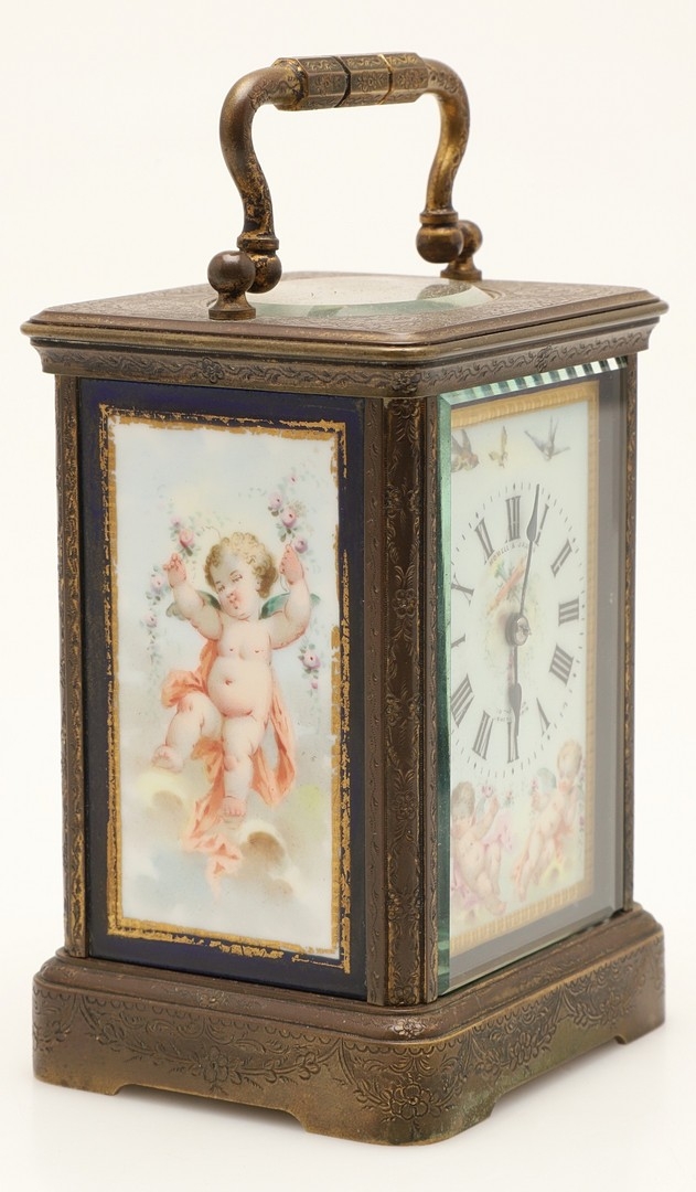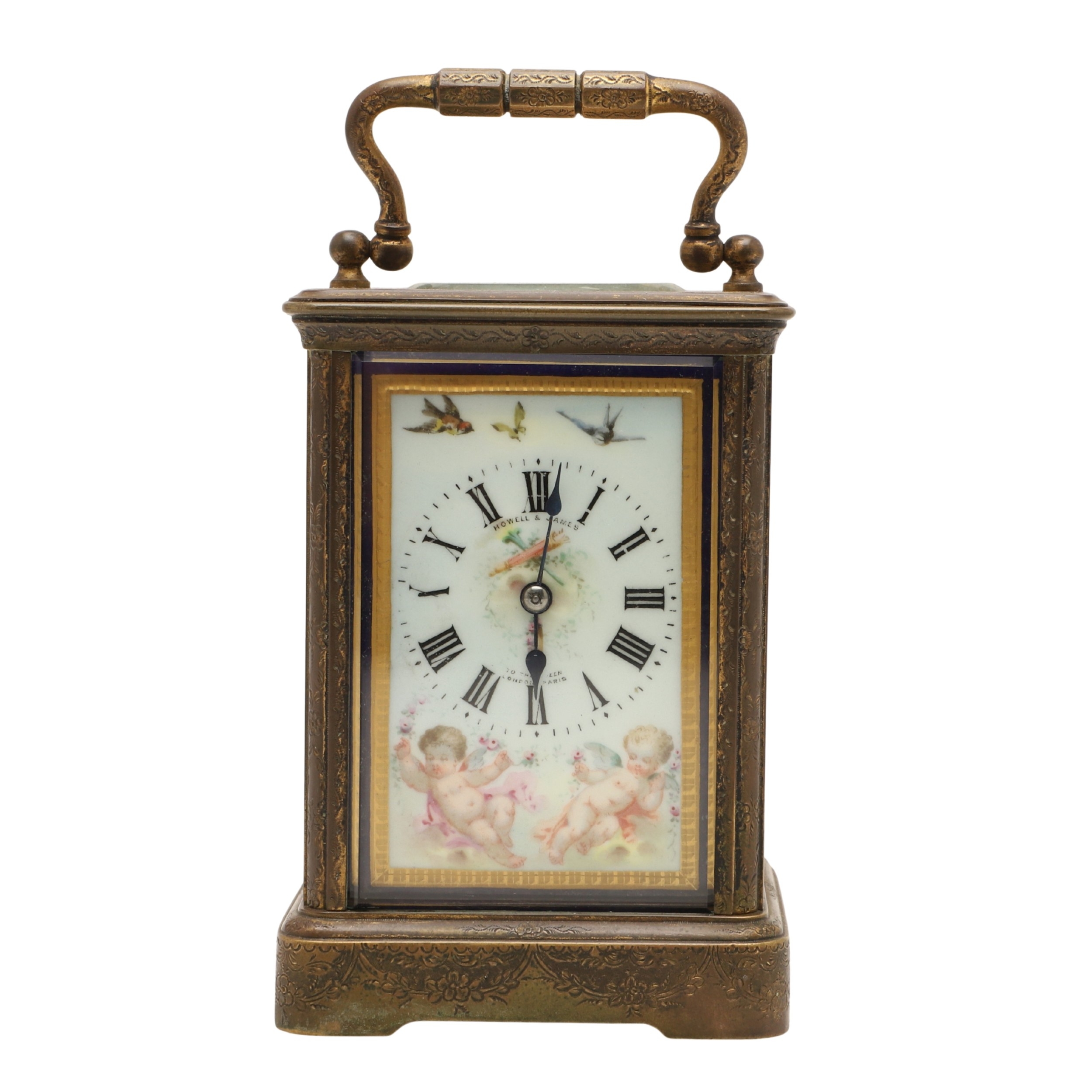 A 19TH CENTURY FRENCH BRASS AND PORCELAIN CARRIAGE CLOCK. the case engraved with foliate detail and set with Sevres style porcelain panels, decorated with cherubs and swallows, the dial signed Howell & James, To the Queen, London & Paris, height 15cm high, width 8.5cm.