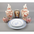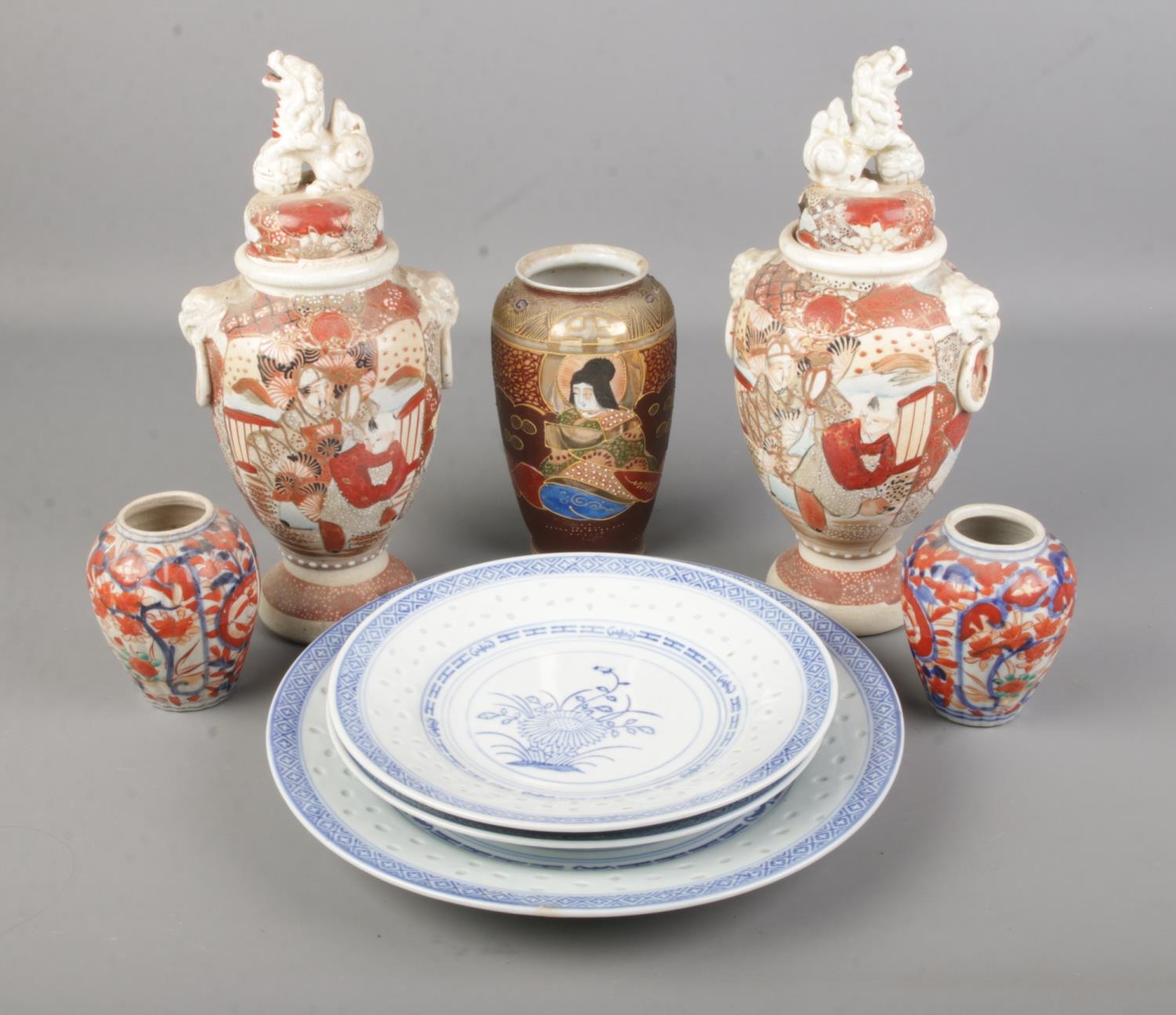 A collection of oriental ceramics including a pair of lidded satsuma vases and a smaller pair of vases, three Chinese plates etc