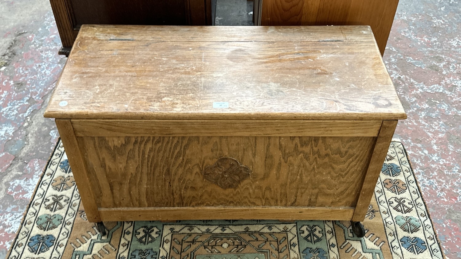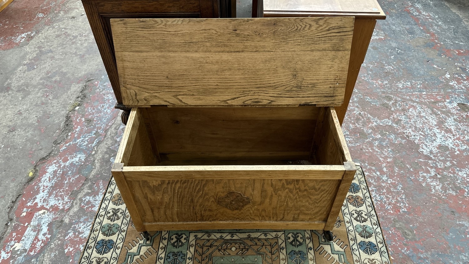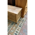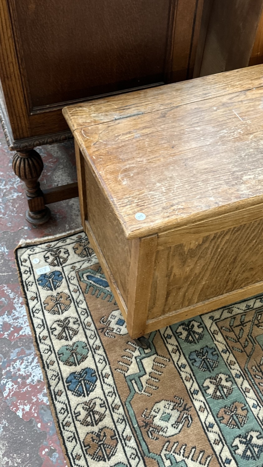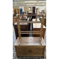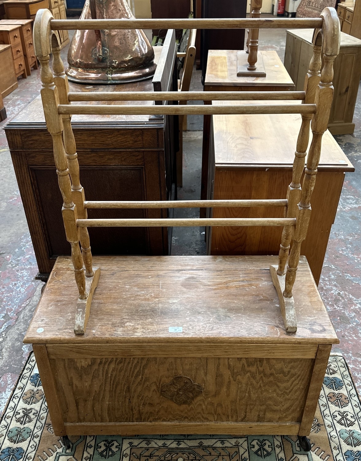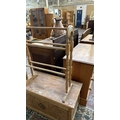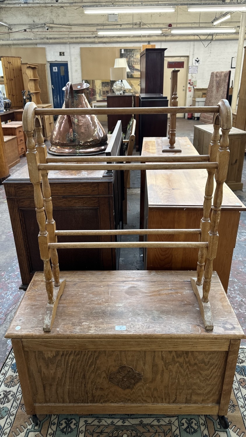 Two pieces of furniture, one Victorian style beech free standing towel rail - approx. 78cm high x 63cm wide x 29cm deep and one 1930s oak blanket box - approx. 48cm high x 86cm wide x 40cm deep